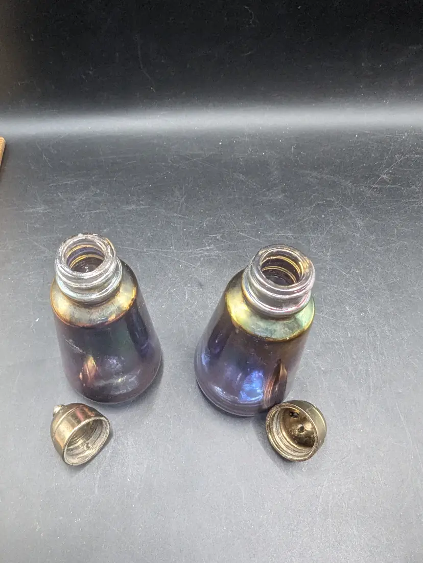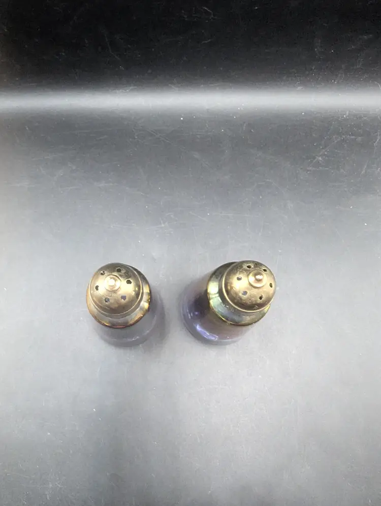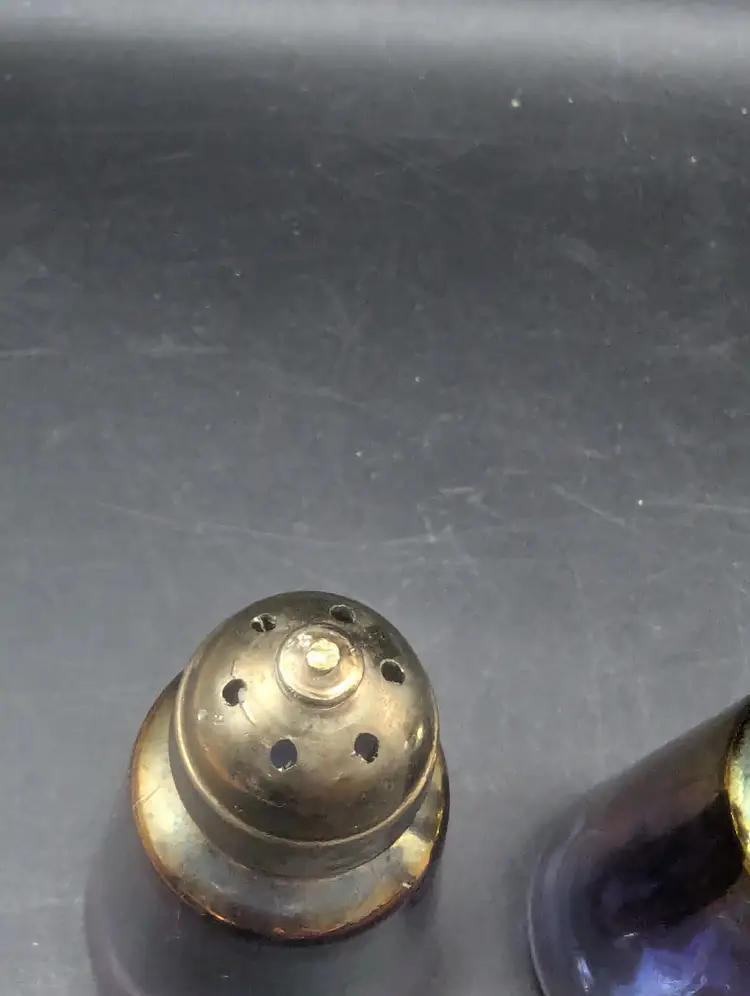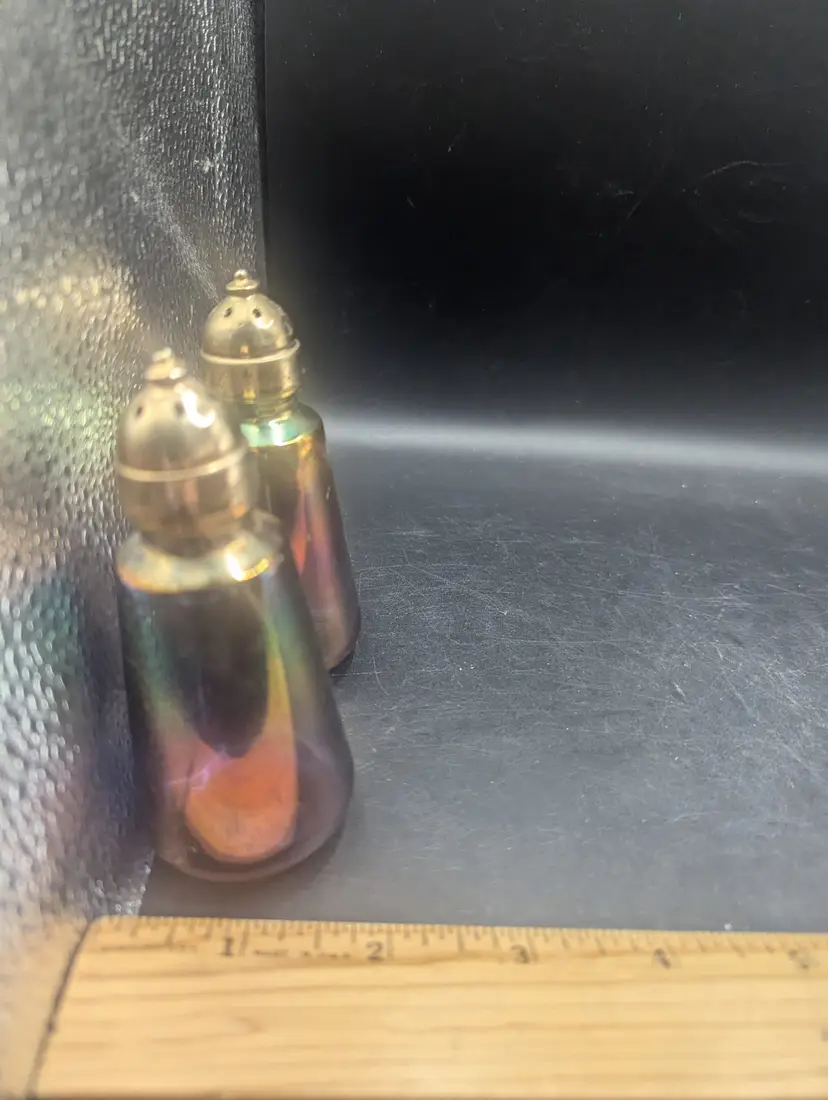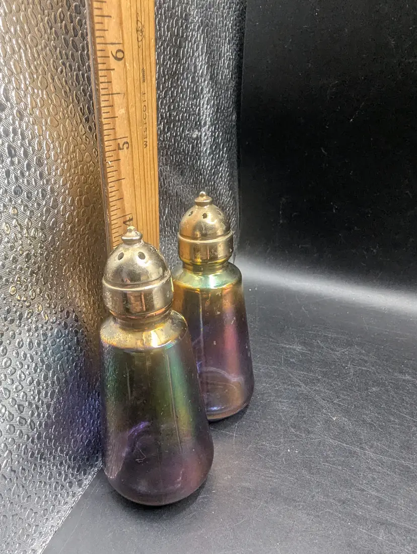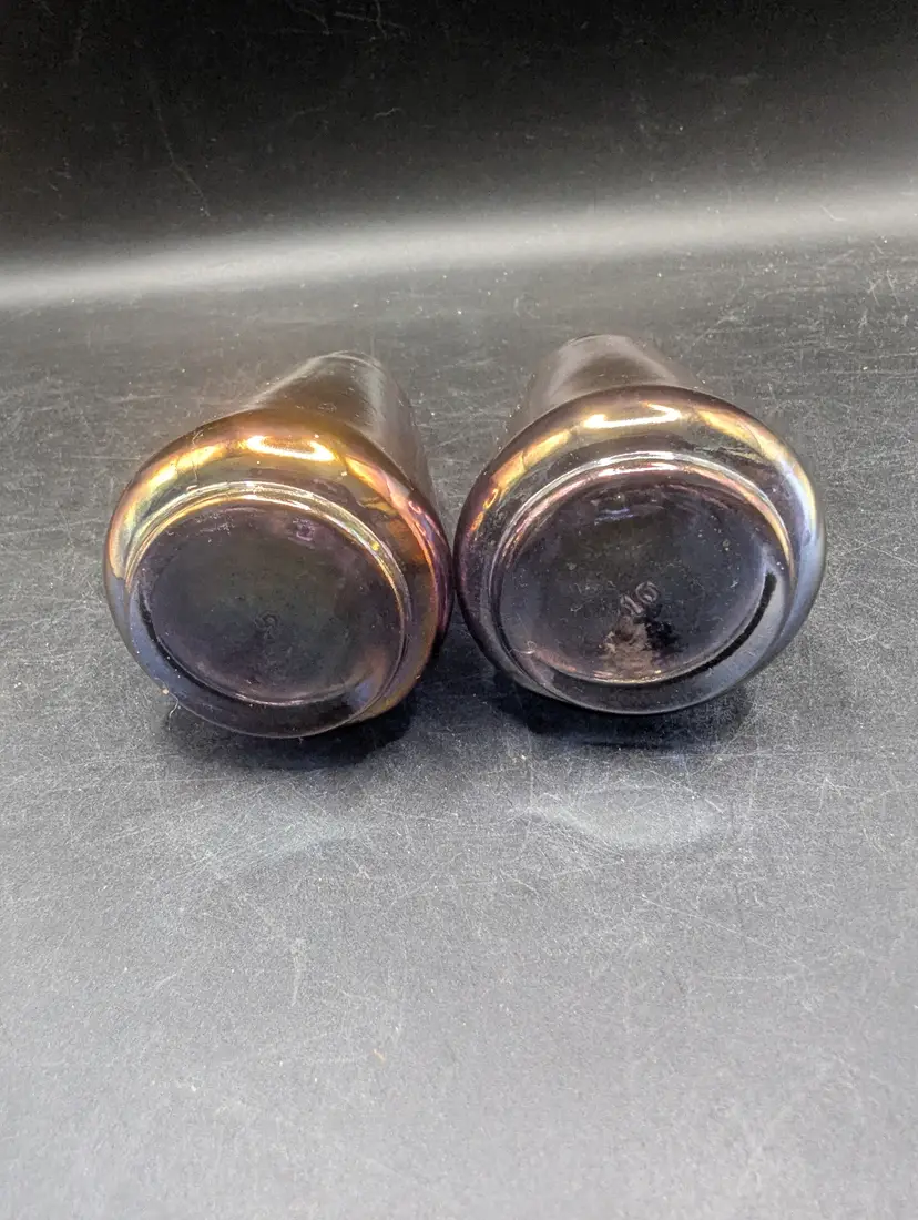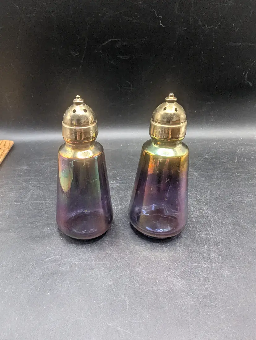 This is a lovely Vintage Glass Salt and Pepper Shakers with a Purple and Iridescent Finish With Brass Style Tops. One top has a flaw on the top as seen in last picture. Please see all pictures for condition and measurements.