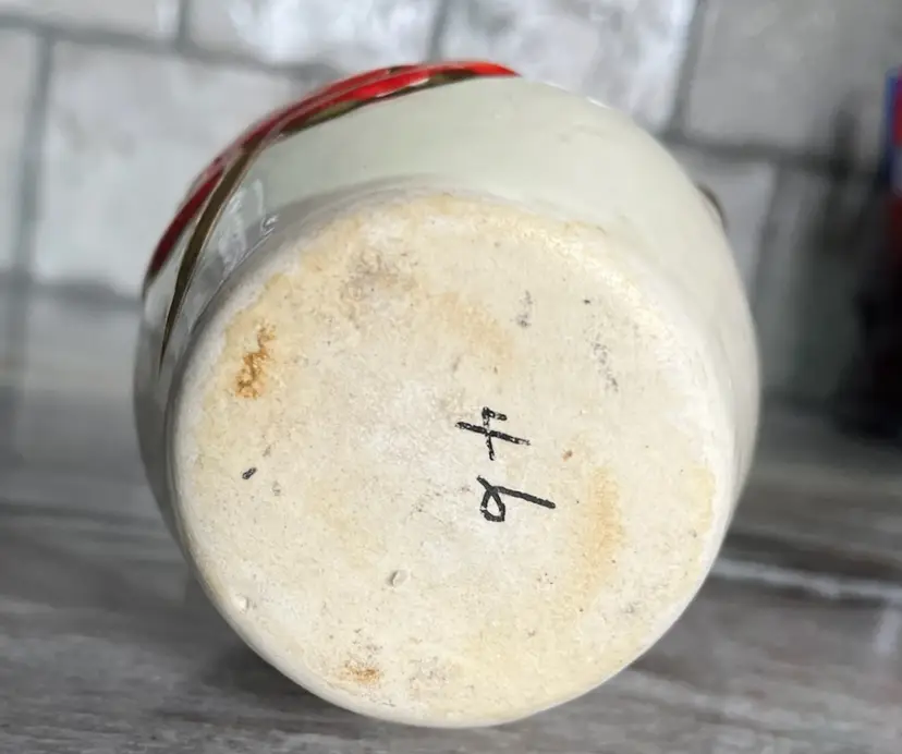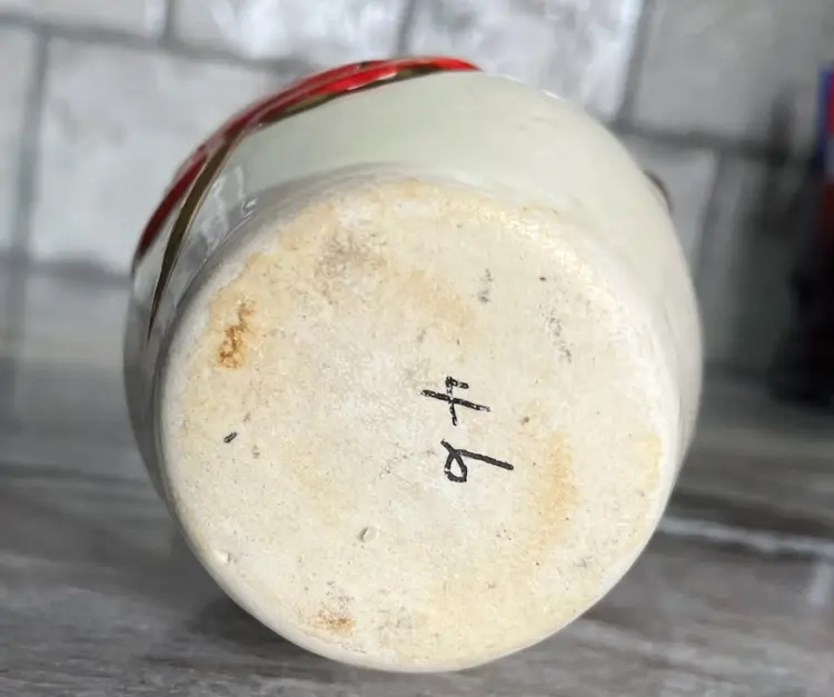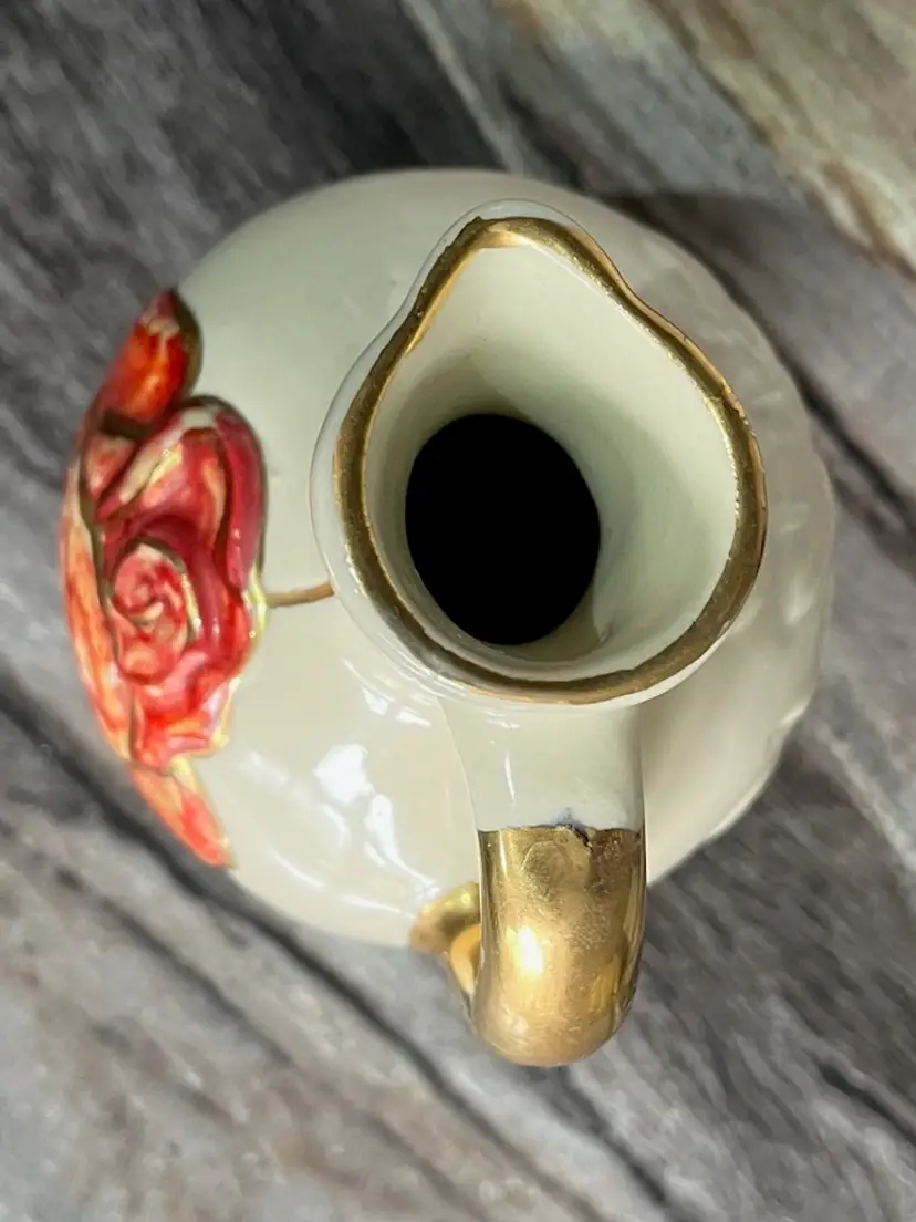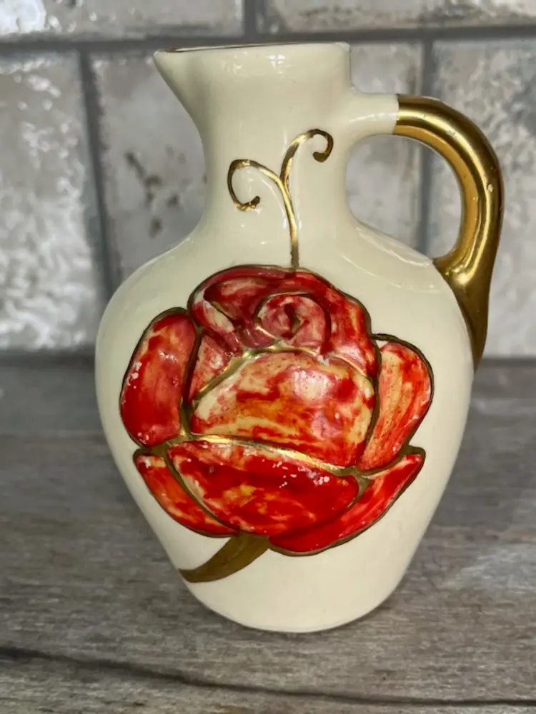 A pretty Vintage Gold & White with Red Rose Vase. Pottery. Stands approximately 5 1/2" Tall and 3 1/2 inches at its widest.