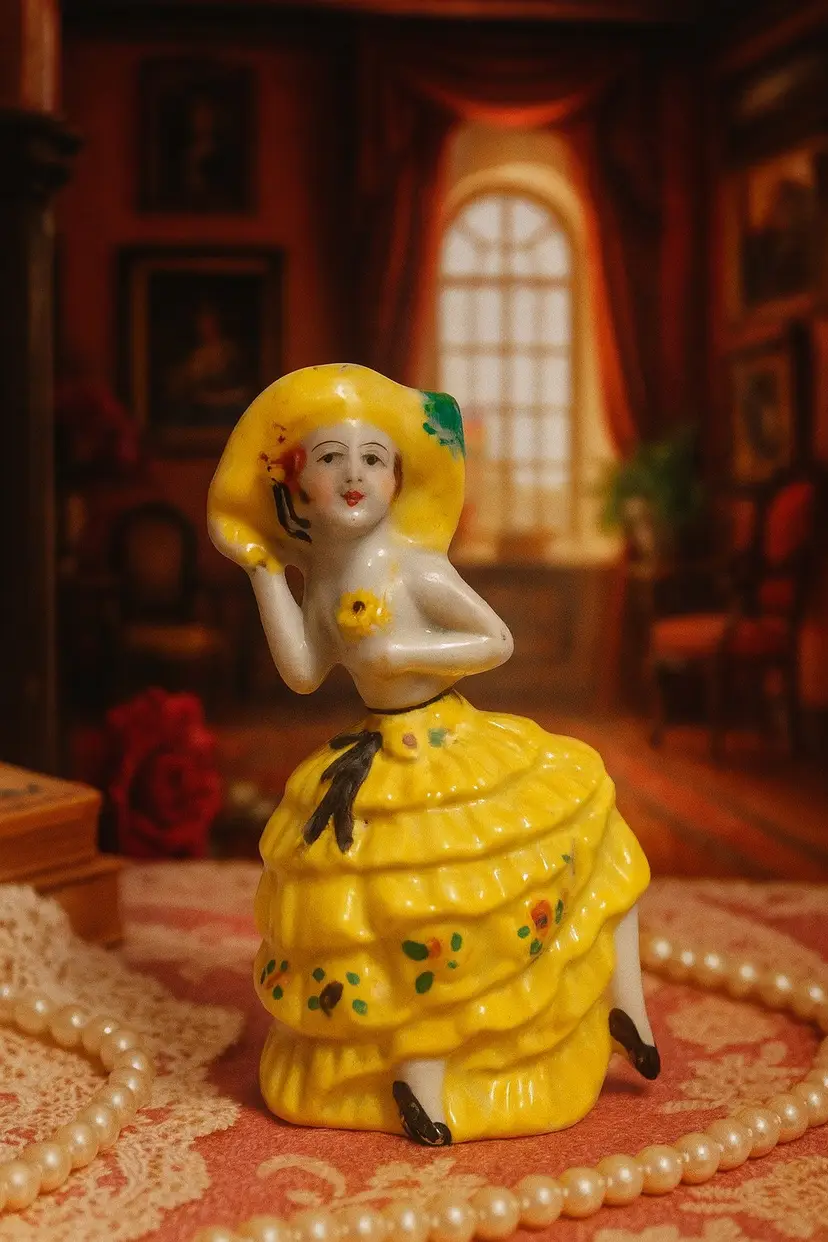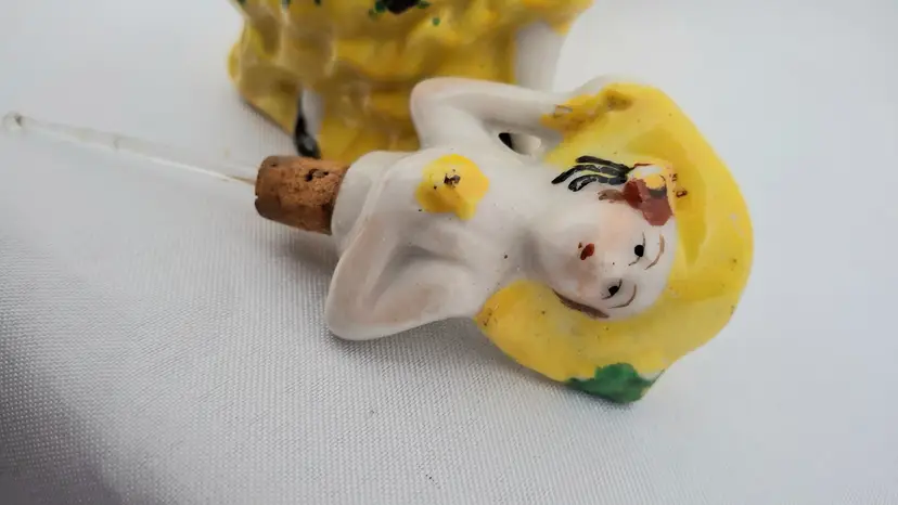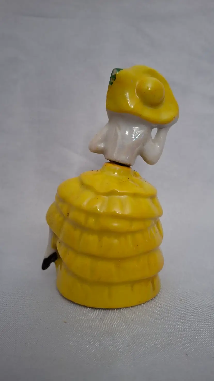 Vintage Gold Castle Chikusa Spanish Dancer Perfume Bottle – Made in Japan This charming 4-inch vintage porcelain perfume bottle by Gold Castle, Chikusa features a hand-painted Spanish dancer in a bright yellow ruffled dress and wide-brimmed hat. Crafted in Japan, this mid-century vanity collectible includes its original glass dauber, all intact and in excellent condition. Beautifully detailed and delicately styled, this piece embodies the grace and artistry of Japanese porcelain craftsmanship. A lovely addition to any vintage perfume bottle or porcelain figurine collection, and a timeless accent for your vanity or display shelf.