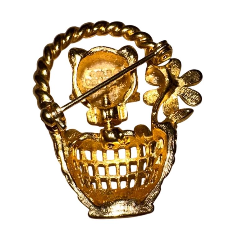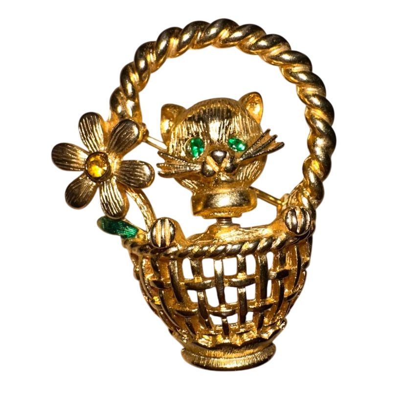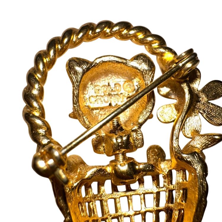 Vintage Gold Crown Kitty Cat in Basket Bobble Head Brooch Pin 1.5” tall x 1 1/4” wide