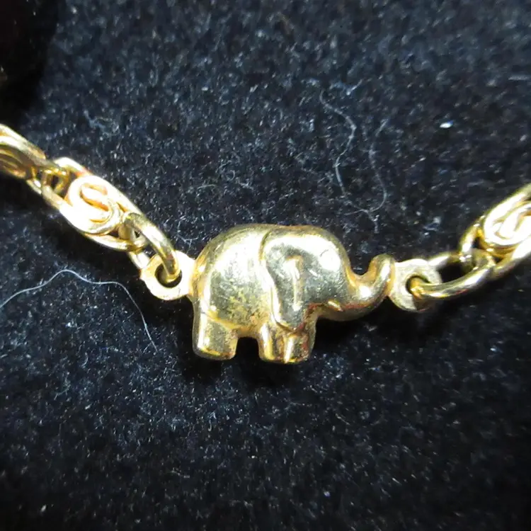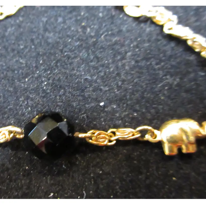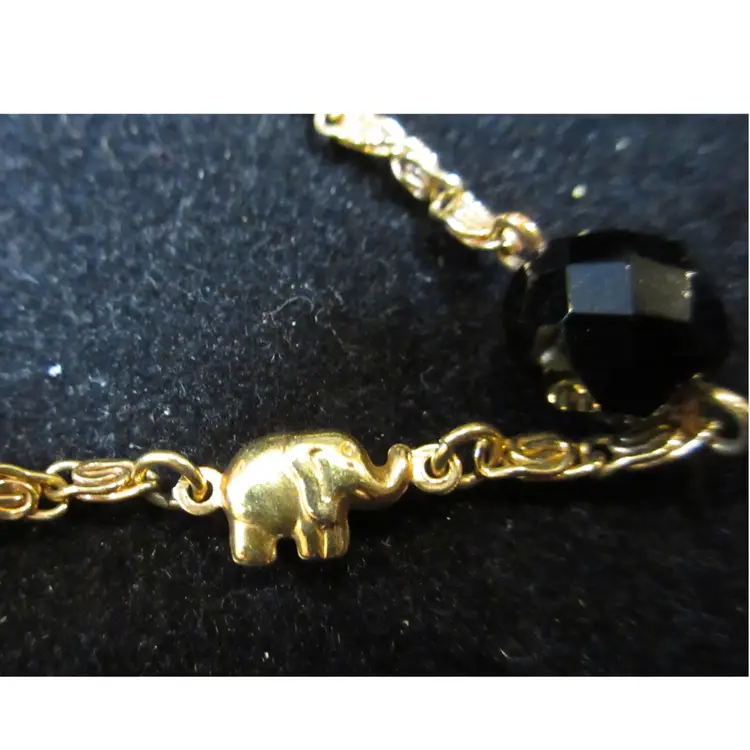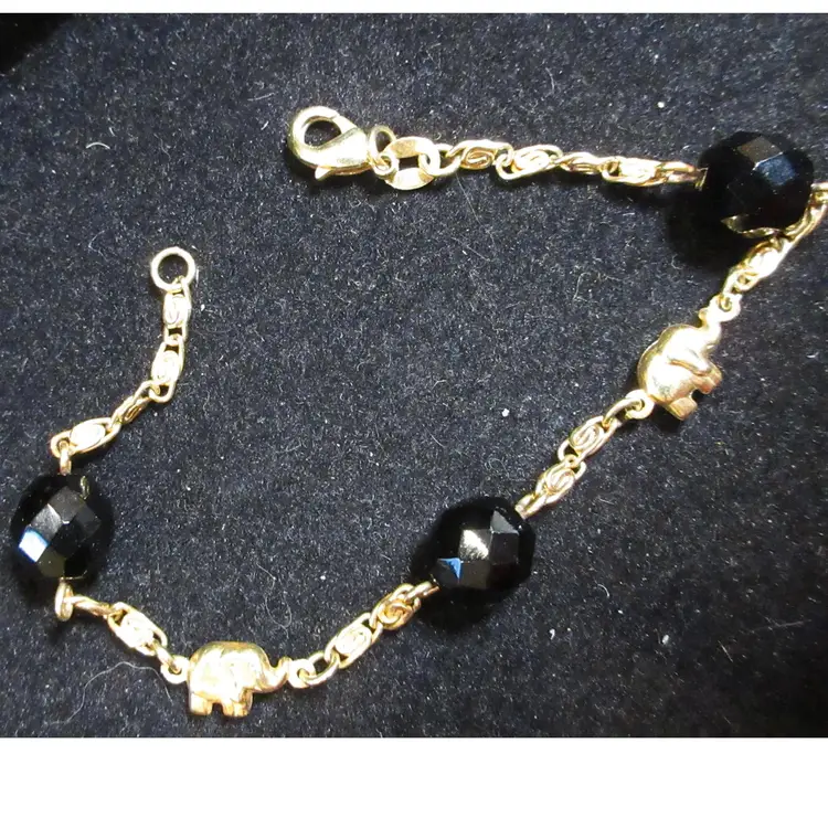 This is an amazing VINTAGE fold filled bracelet with small gold elephants and black faceted acrylic beads. The bracelet has gold filled metal links that have a cute spiral shape. The links attach to gold loops on the faceted beads. There is 1 link marked "GHR," which means it's gold filled. This bracelet is 7 inches long and ends in a lobster clasp.