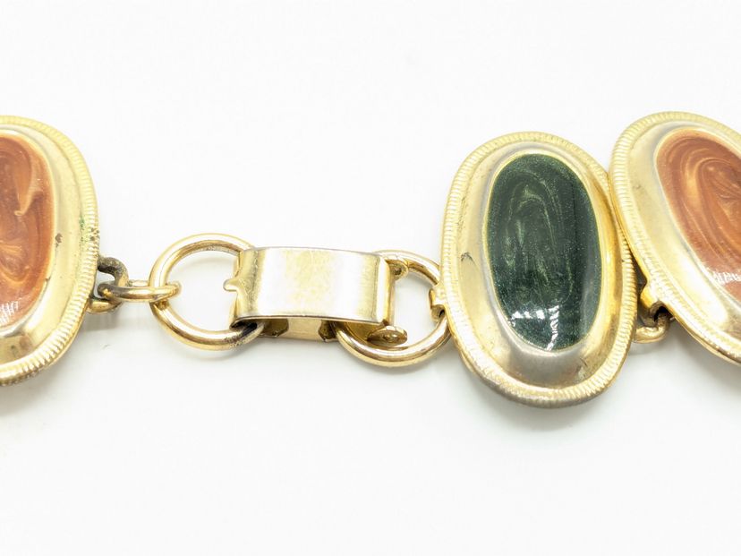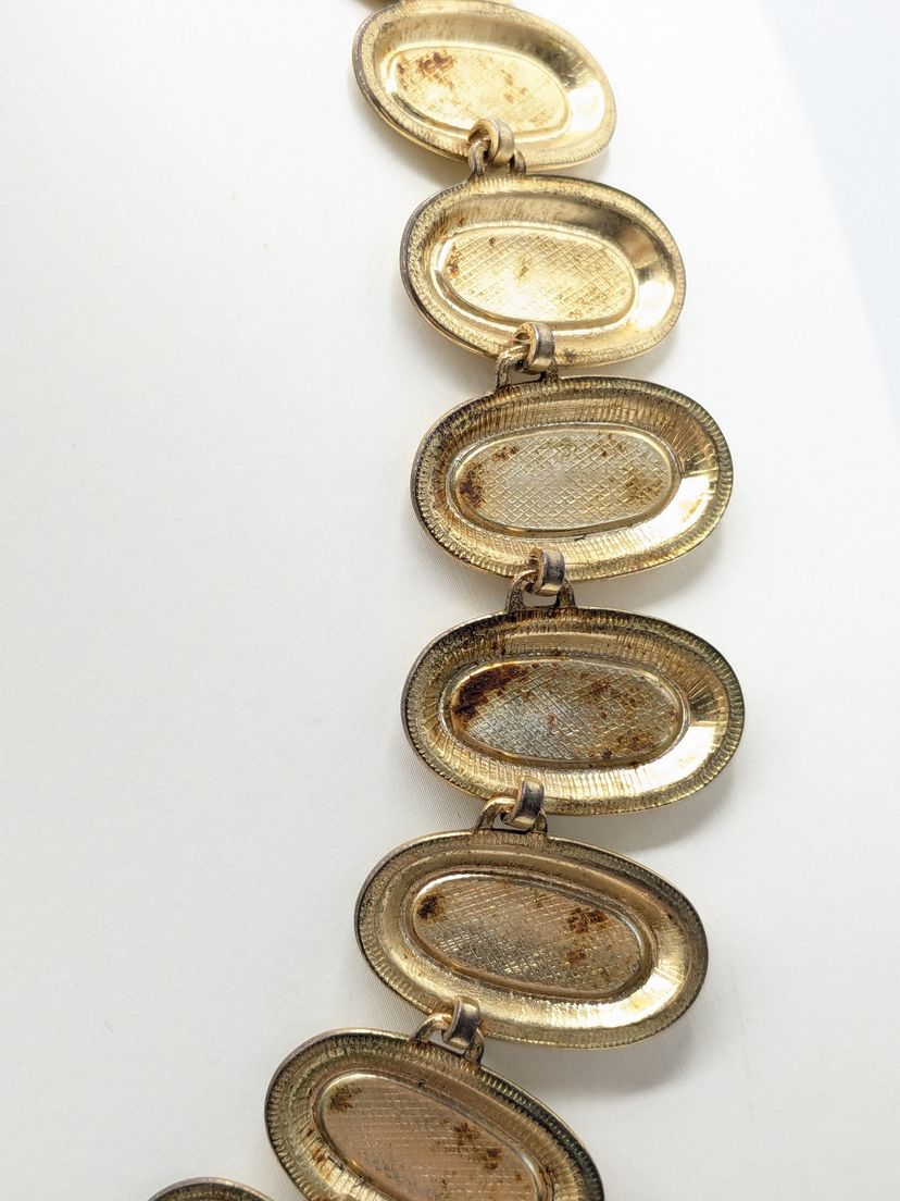 Good condition with some discolor on the back of necklace. Great colors for fall, orange, burgundy, and green enameled marbled look. Fold over clasp. Measures 17 1/2" and 1 1/8" wide. EN3