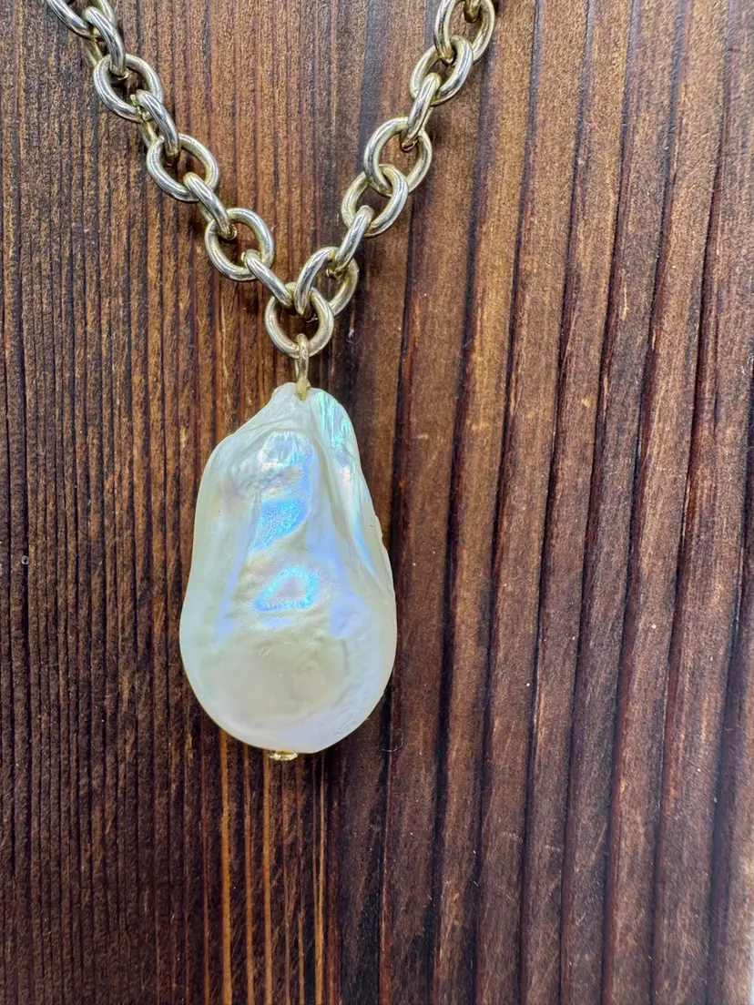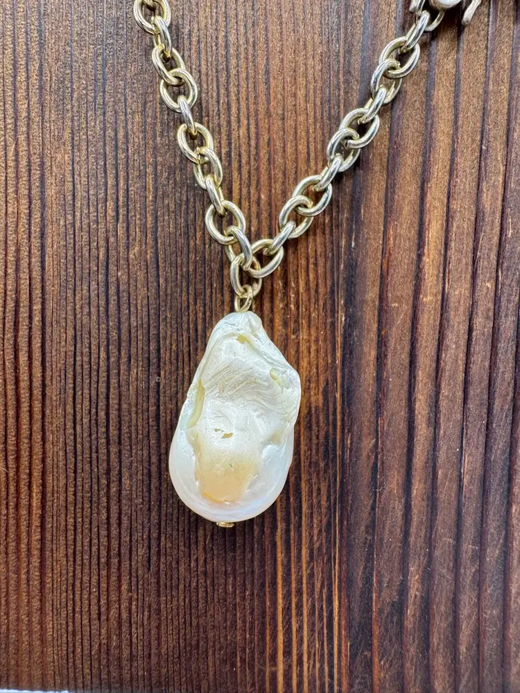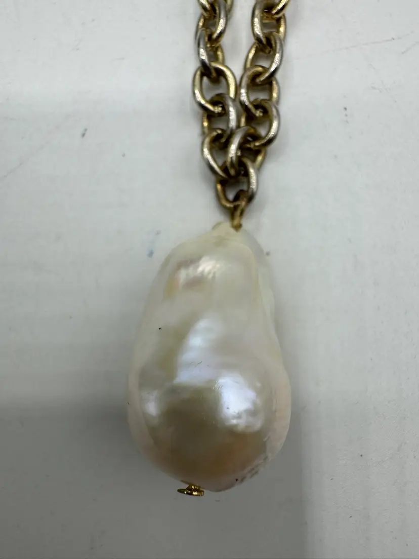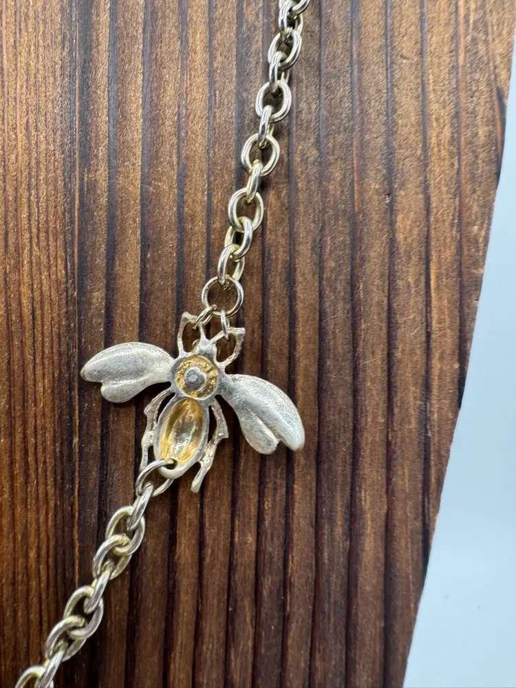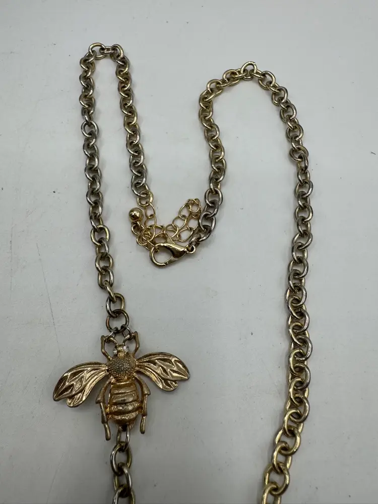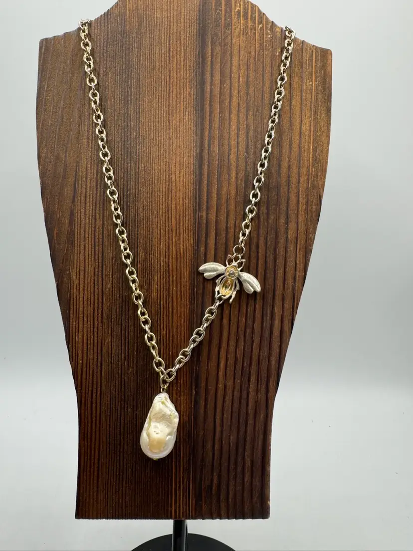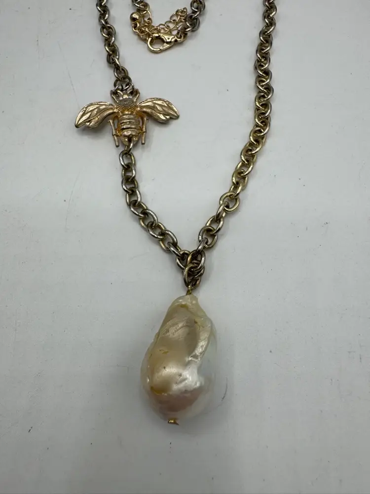 This Vintage Gold Tone Bee with Rhinestone Eyes & Baroque Pearl Necklace is a unique and elegant piece of jewelry. The necklace features a beautiful baroque pearl as the main stone, complemented by a delicate gold tone bee pendant with rhinestone eyes. The adjustable design makes it suitable for women of all neck sizes, adding a touch of vintage charm to any outfit. This original and fashion-forward necklace is a perfect addition to any jewelry collection. Necklace has some vintage wear. Please see photos. Fantastic one-of-a-kind piece. Measures 18” with 3” extender Pearl is 1 1/4” X 3/4”