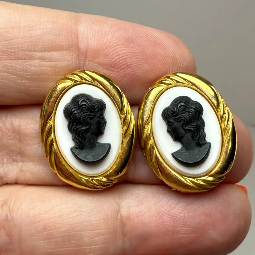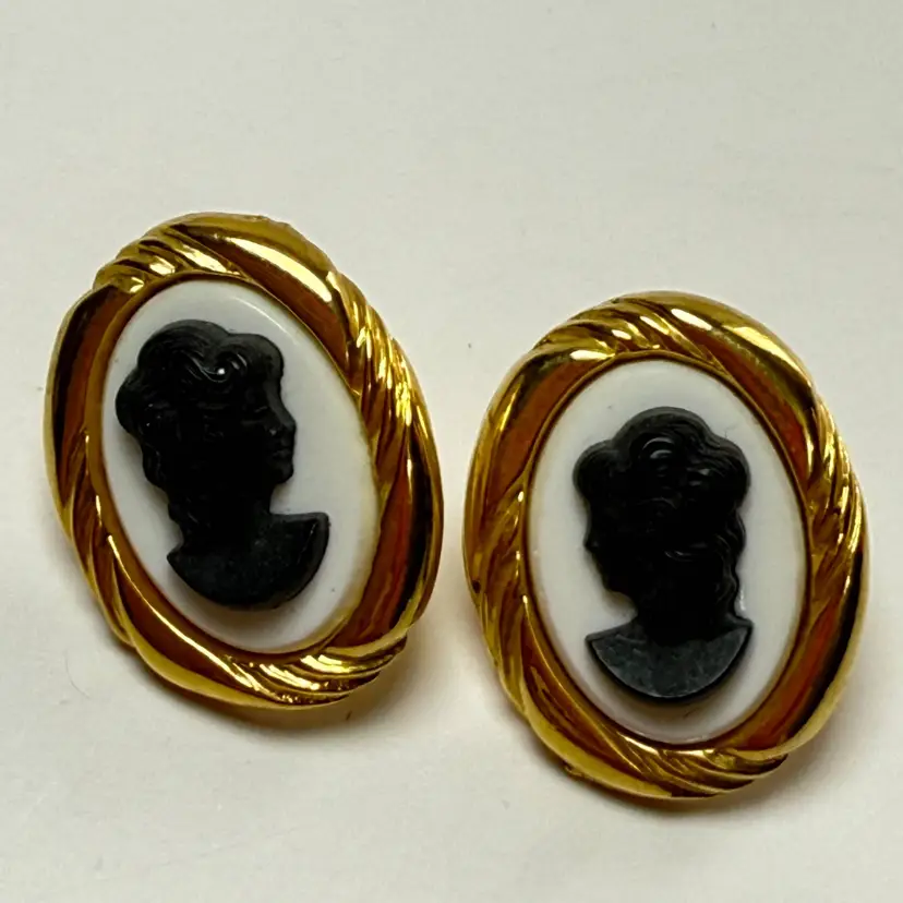 Vintage Gold Tone Black & White Cameo Pierced Earrings Heavy