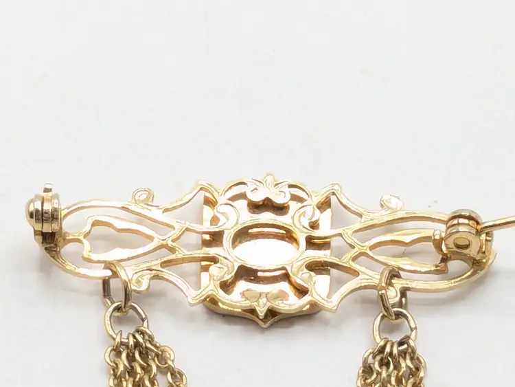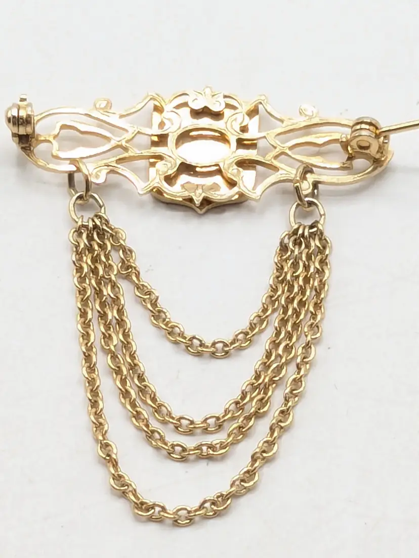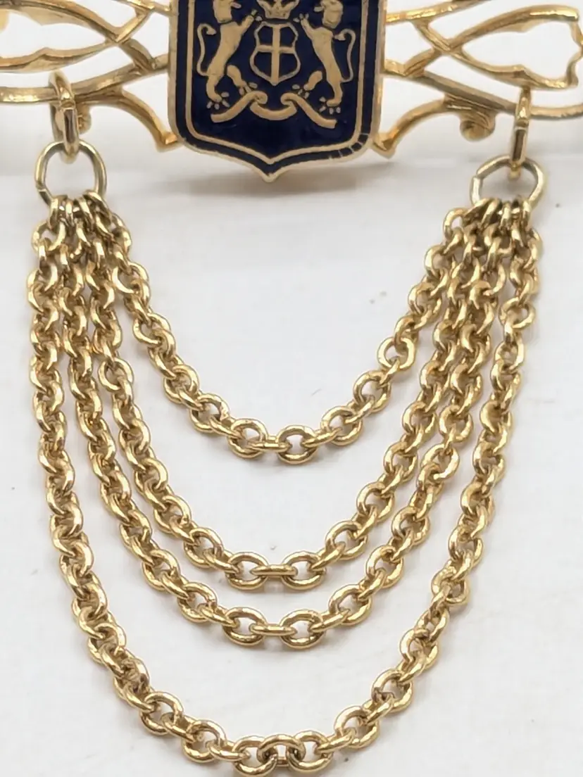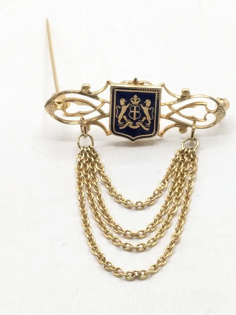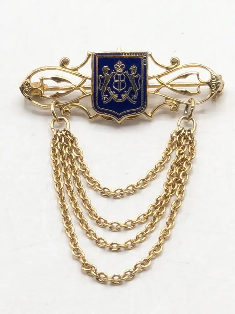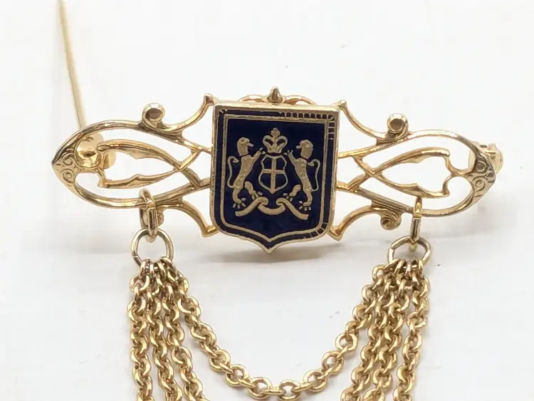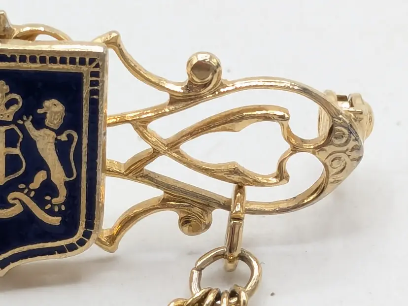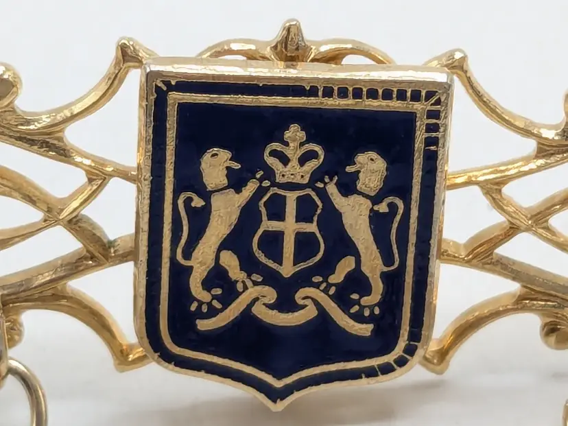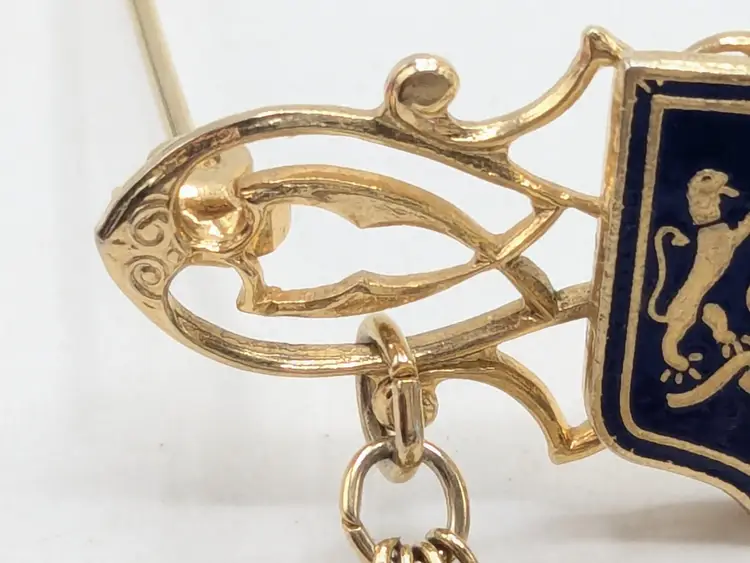 Good condition. Gold tone is bright and shiny with no color loss. Features a blue enameled crest with gold tone chain drape. Measures 1 1/2" in length and 1/2" wide. wen