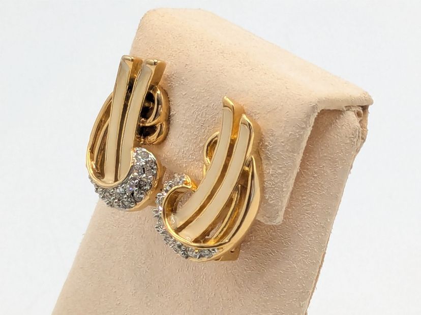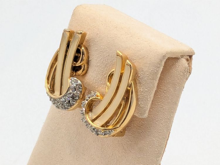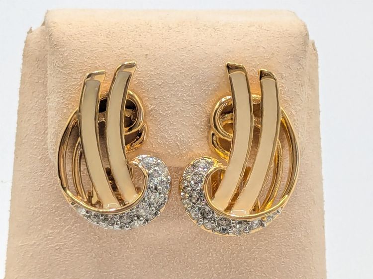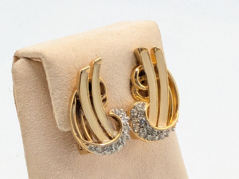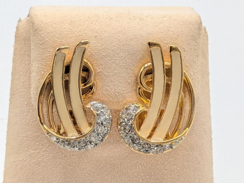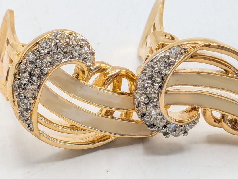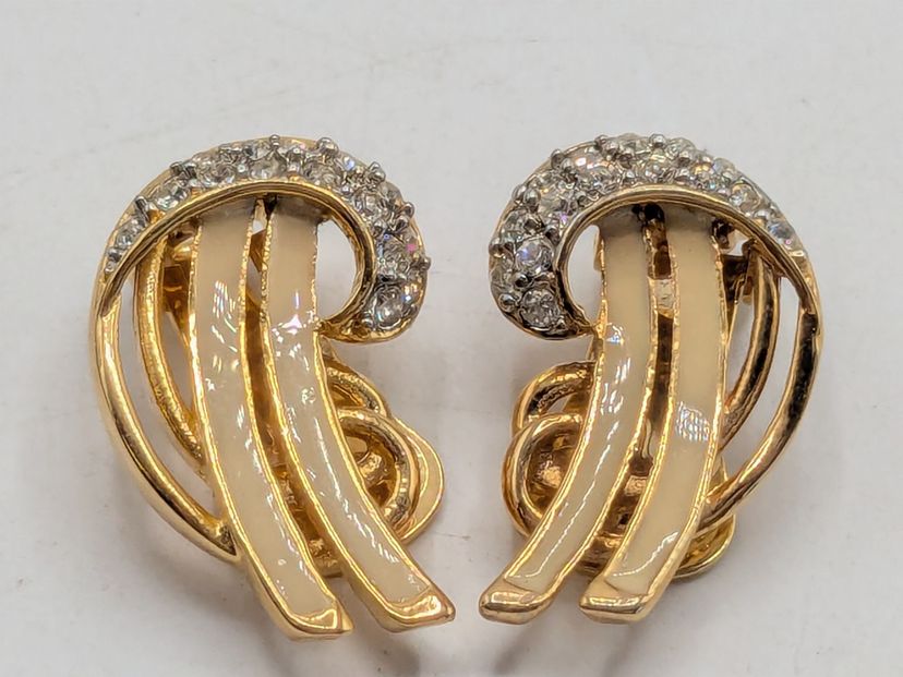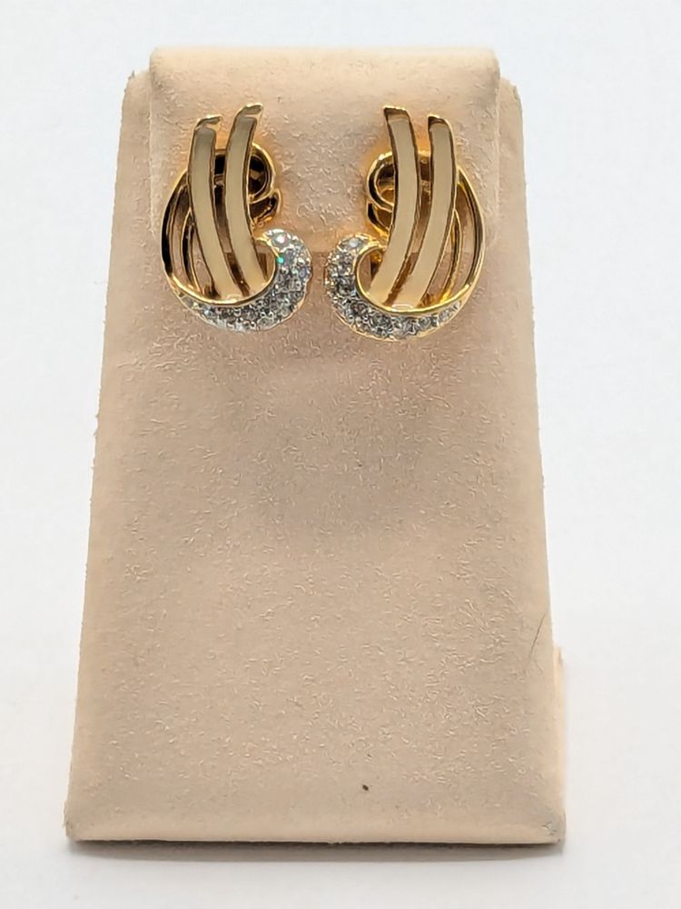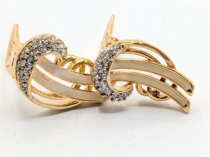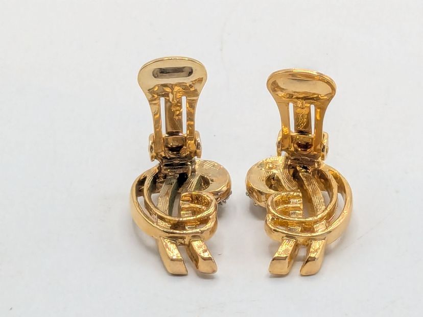 Good condition. Gold tone is bright and shiny with no colour loss. Rhinestones are all present and sparkly. Clip on earrings. Measures 1" in length and 5/8" wide. EN3