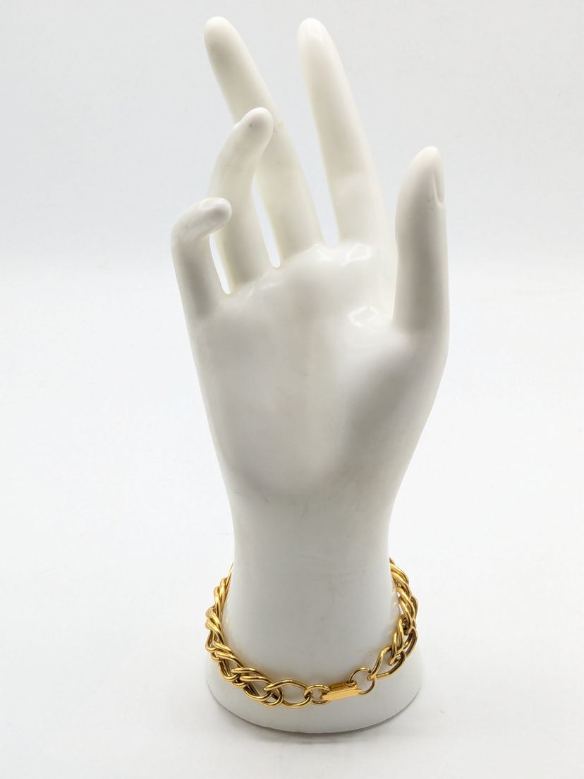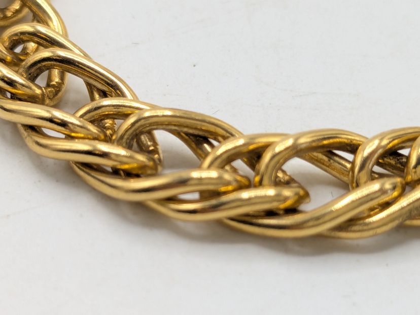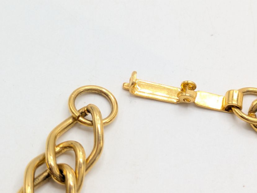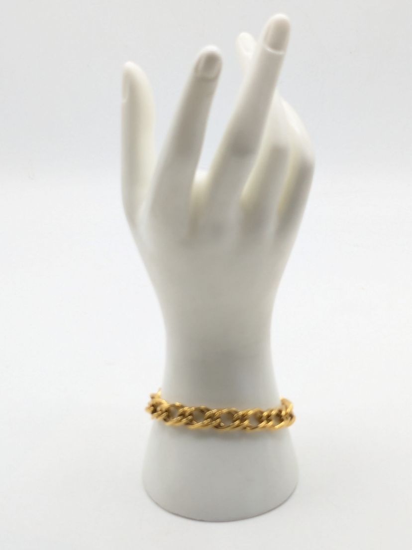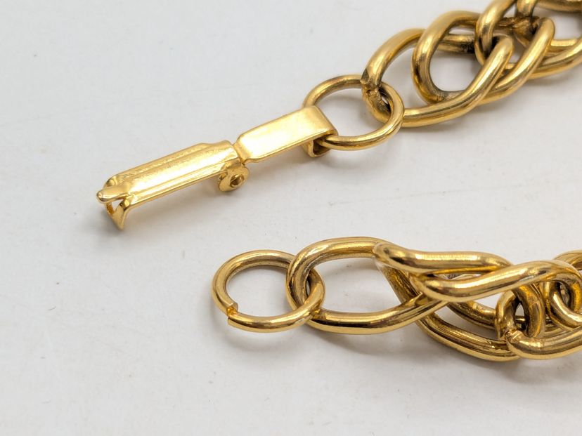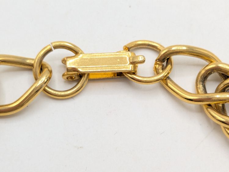 Great starter bracelet with charms. Good condition. Gold tone is bright and shiny with no color loss. Fold over clasp. Measures 7" and 3/8" wide. EN3