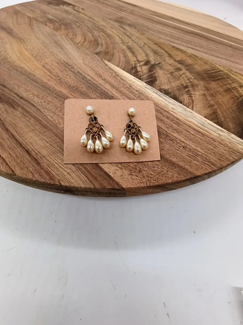 Vintage Gold Tone Fresh Water & Faux Pearl Dangle Drop Screw Back Earrings. These have a single pearl near the earlobe conected to a small fillagree area from which the natural pearls dangle. These are 1.75 inches from pearl to bottom of the dangling pearls. This is preowned, the dangling pearls appear to be fresh water while the one at top is either a low grade cultured or faux. No missing stones, screw backs work. Very slight spotty oxidation/ age darkening on pad and screw end that touches the ear, No other issues. Excellent condition. Ships USPS
