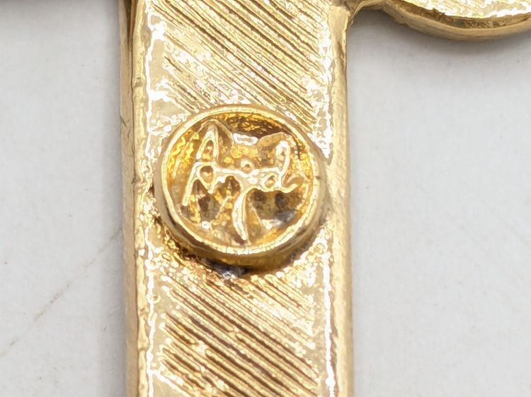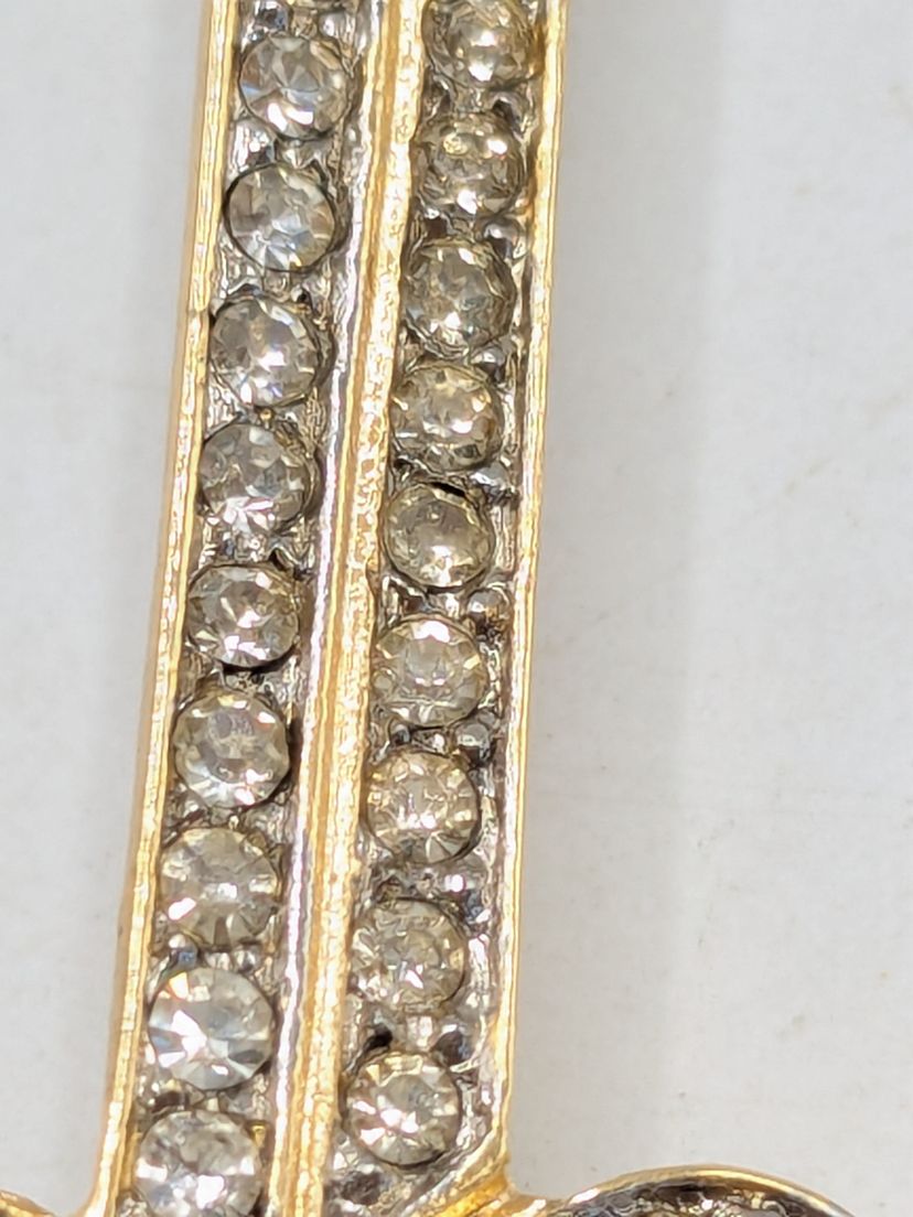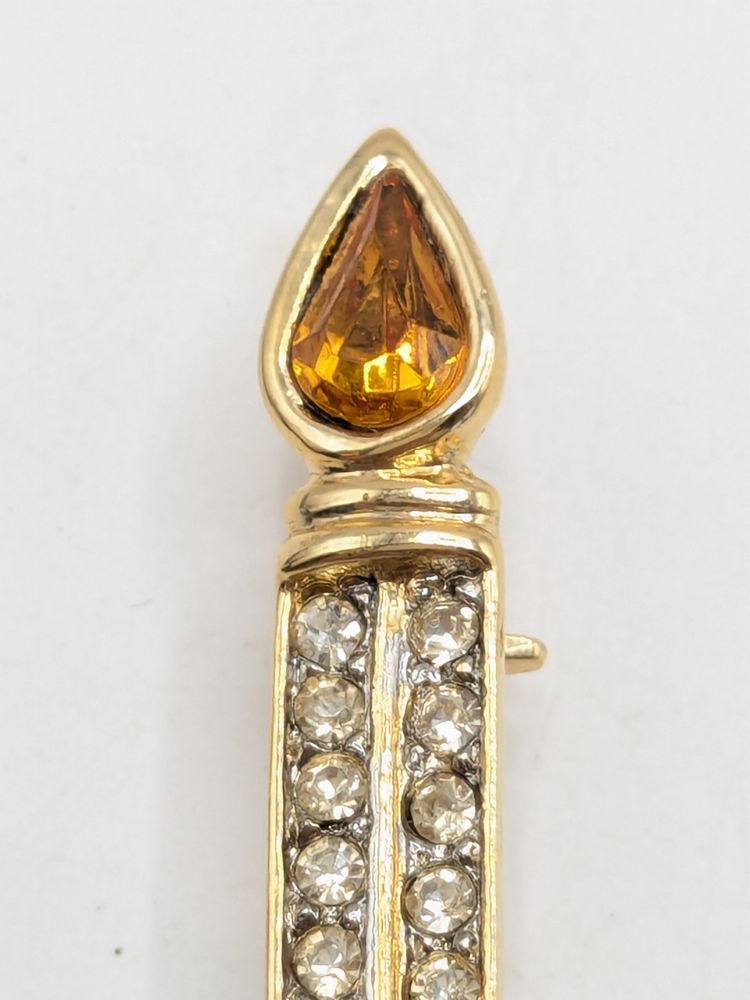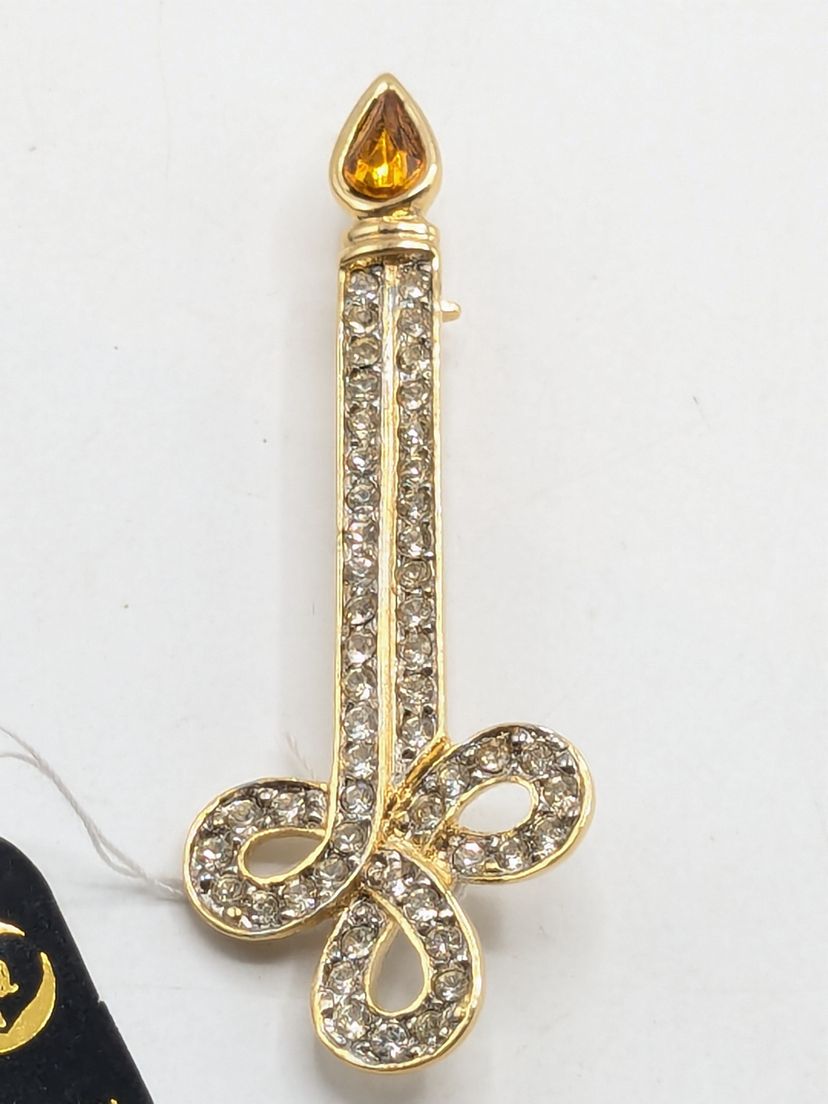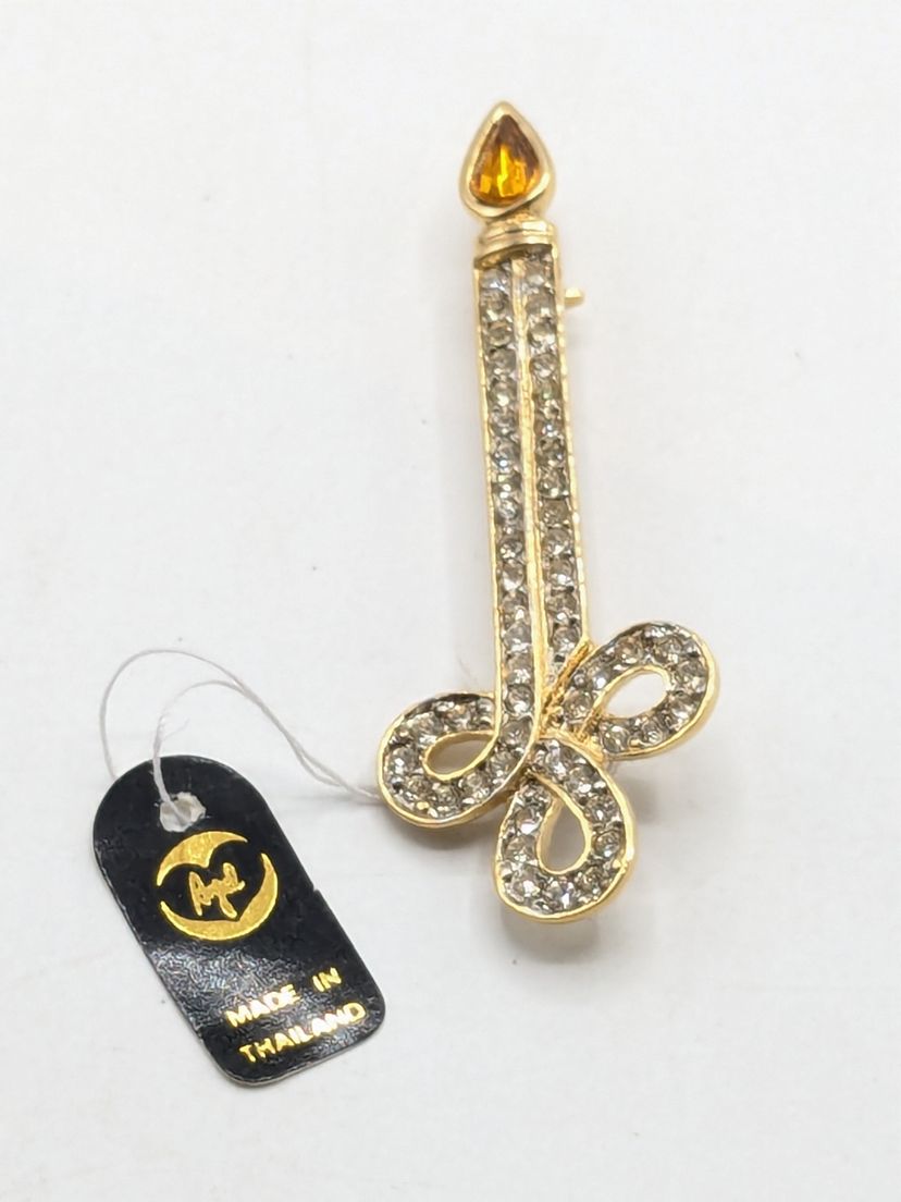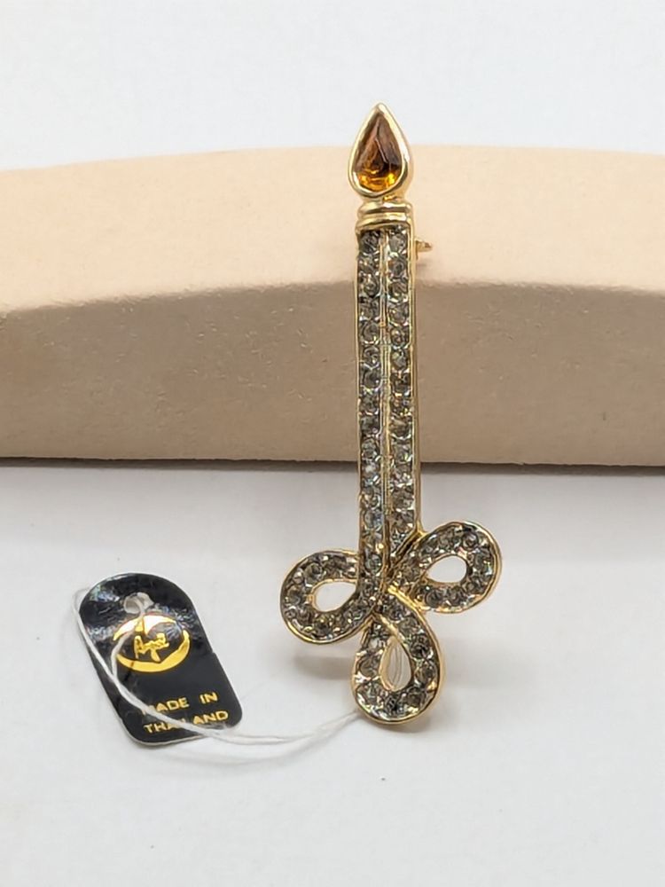 Holiday jewelry. Good condition. New old stock. Gold tone is bright and shiny with no color loss. Rhinestones are all present and very sparkly. Signed Angel, from an early QVC jewelry line in the late 1980's. Original tag. Made in Thailand. Measures 2 1/2" in length and 1" at its widest point. EN3