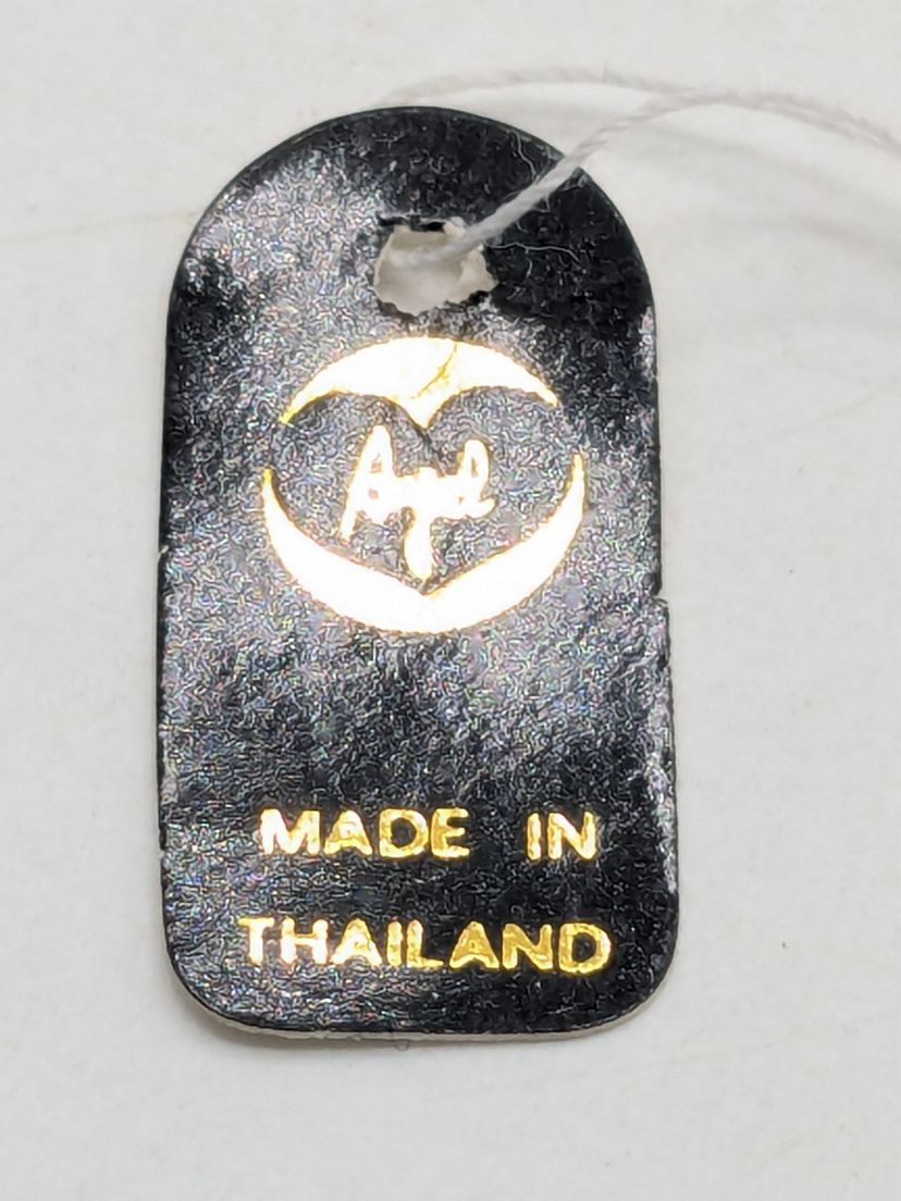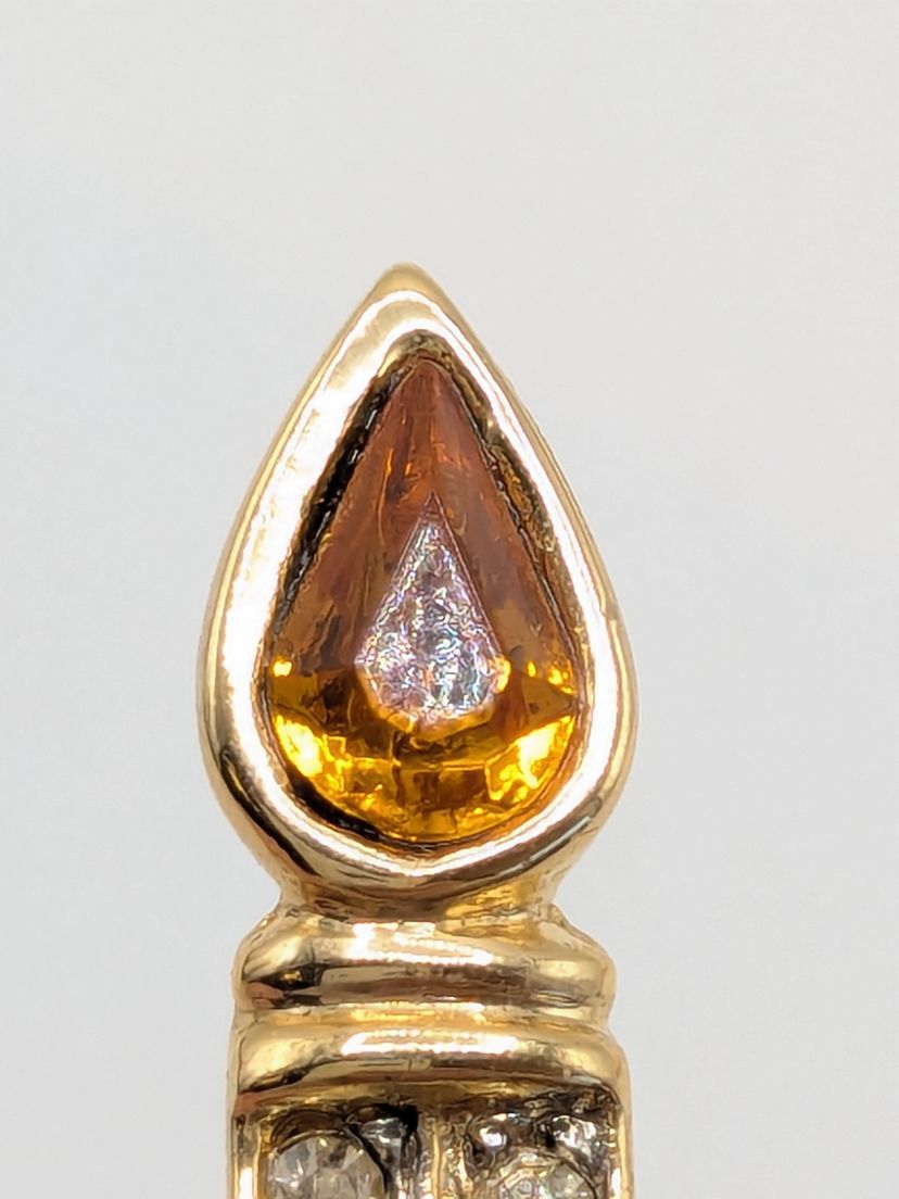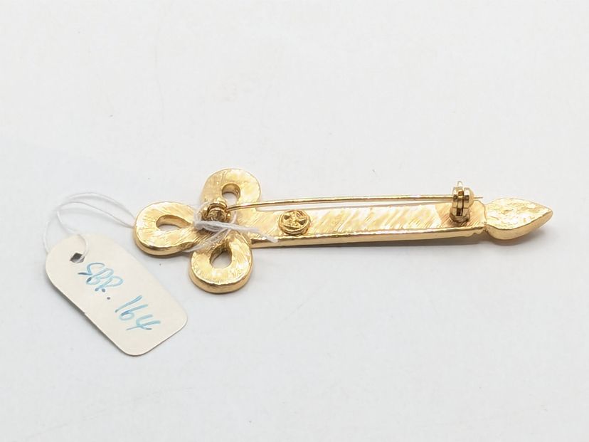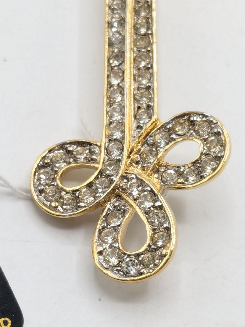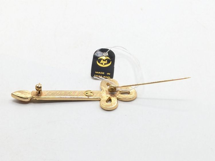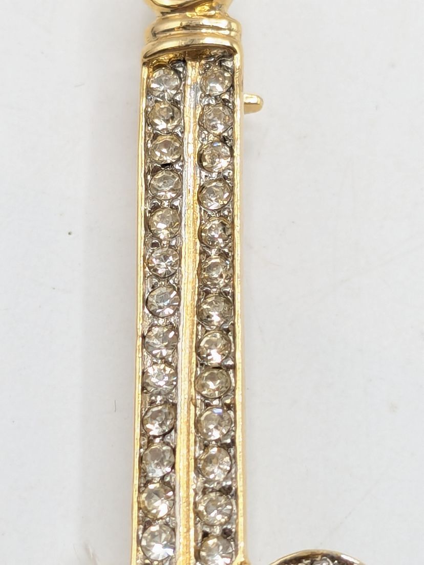 Holiday jewelry. Good condition. New old stock. Gold tone is bright and shiny with no color loss. Rhinestones are all present and very sparkly. Signed Angel, from an early QVC jewelry line in the late 1980's. Original tag. Made in Thailand. Measures 2 1/2" in length and 1" at its widest point. EN3