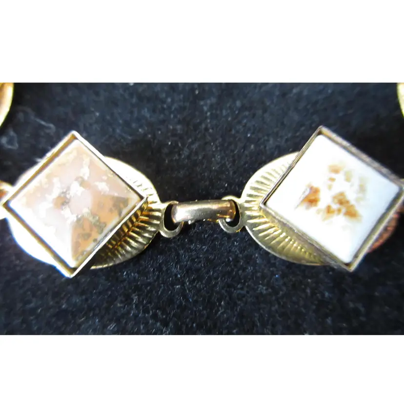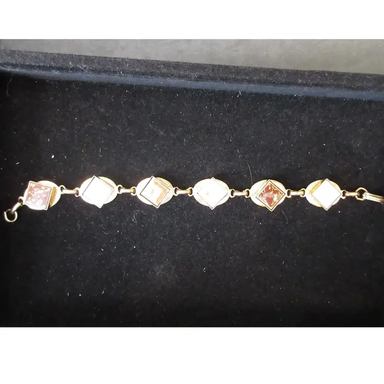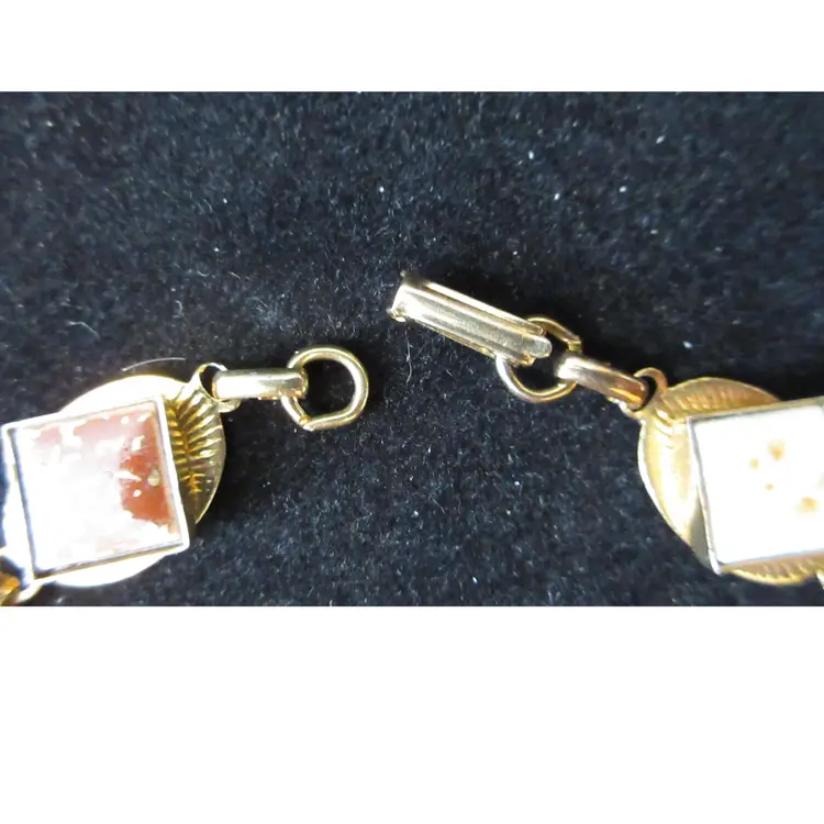 This is an AMAZING VINTAGE gold tone metal bracelet. The bracelet features oval links of gold tone metal that have gold squares attached with baked enamel tiles. The tiles are in white, brown and burgundy, and have gold and brown flecks on them. The effect is AMAZING! This bracelet closes with a fold over clasp and is 7 inches long.