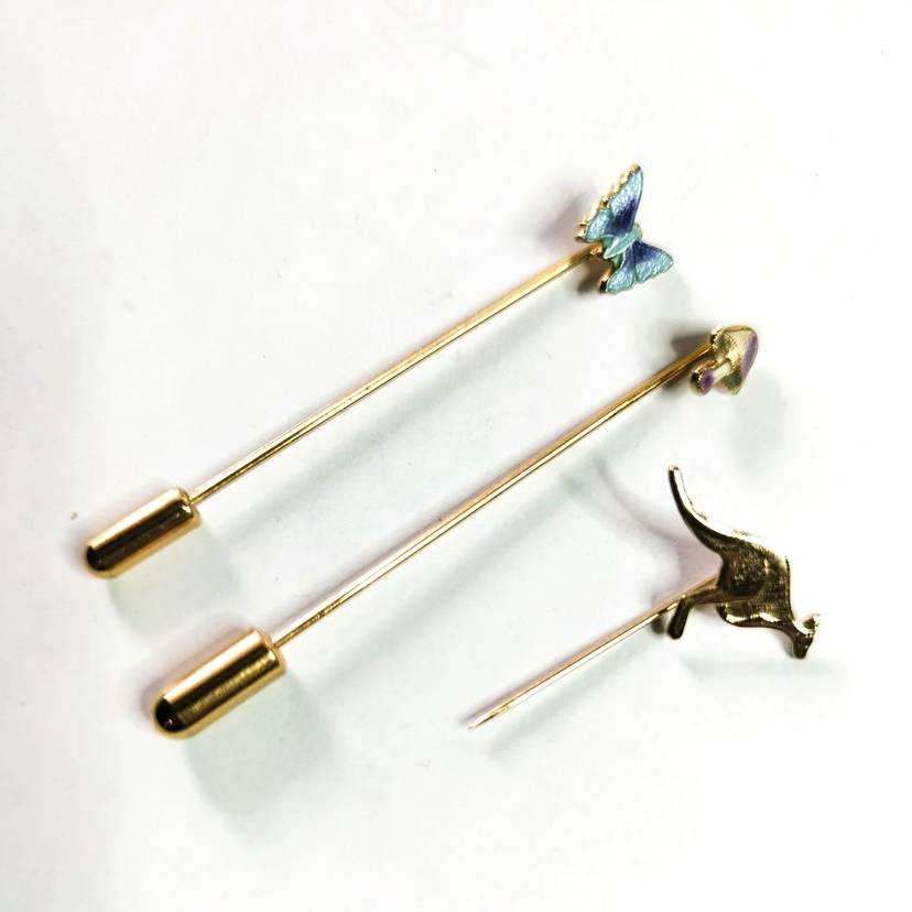 Vintage Gold-Tone Stick Pins With Butterfly Mushroom Kangaroo Designs. Condition is preowned. Elegant and charming, these vintage gold-tone stick pins feature intricate designs of a butterfly, mushroom, and kangaroo. (FC03)