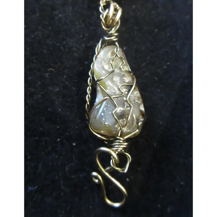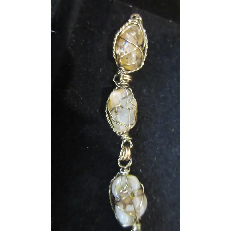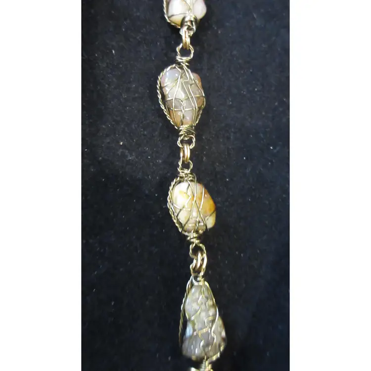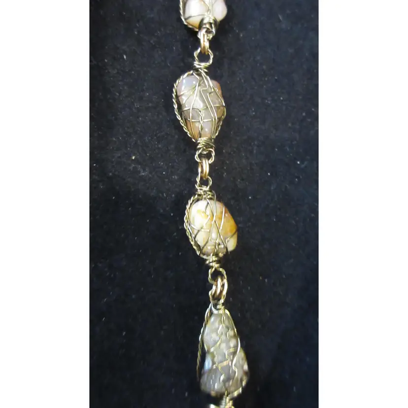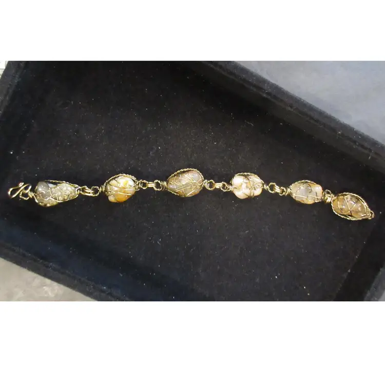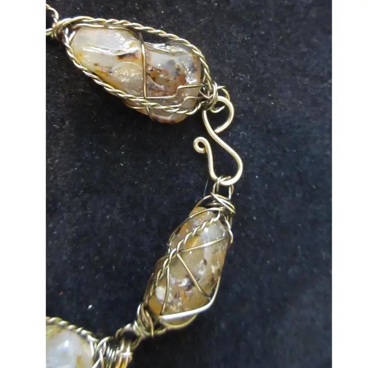 This is an AMAZING vintage gold tone metal wire bracelet. The wire is wrapped around 6 nuggets of quartz agate. The stones are opaque and translucent, and have shades of gray, brown, amber, pink and white. It's very BOHO in design. This bracelet is 8.5 inches and has a hook closure.