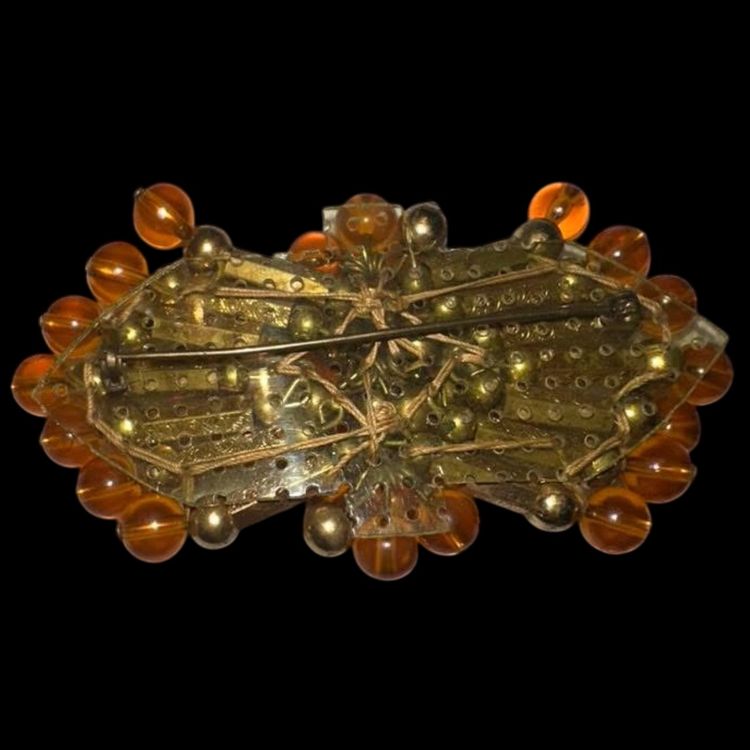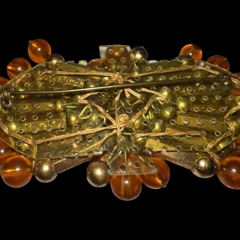 Vintage Gold tone with Amber beaded brooch Plastic backing 3 1/2 inches wide by 2 inches tall No issues