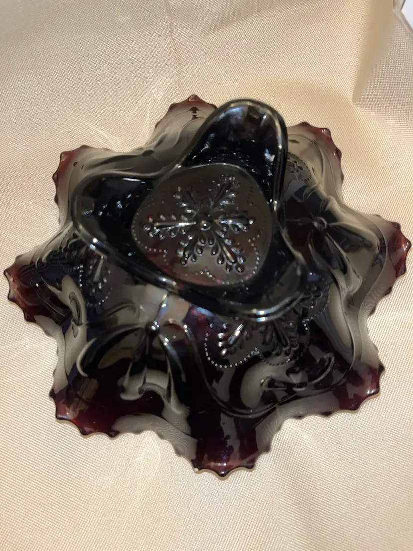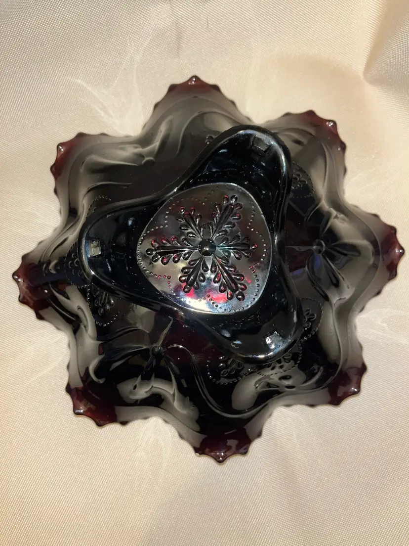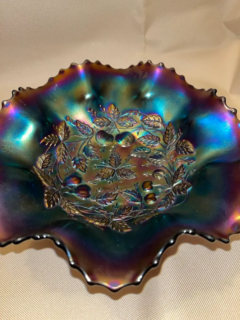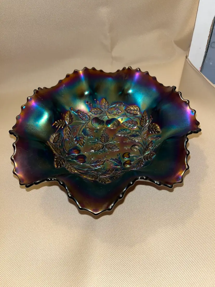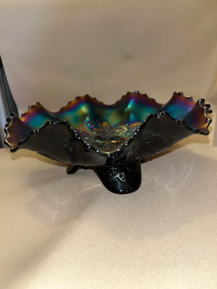 Vintage gorgeous Northwood carnival glass Three Ffuit Meallion dish 9” wide 3 1/2” tall 3 footed bowl. Great condition no chips or cracks