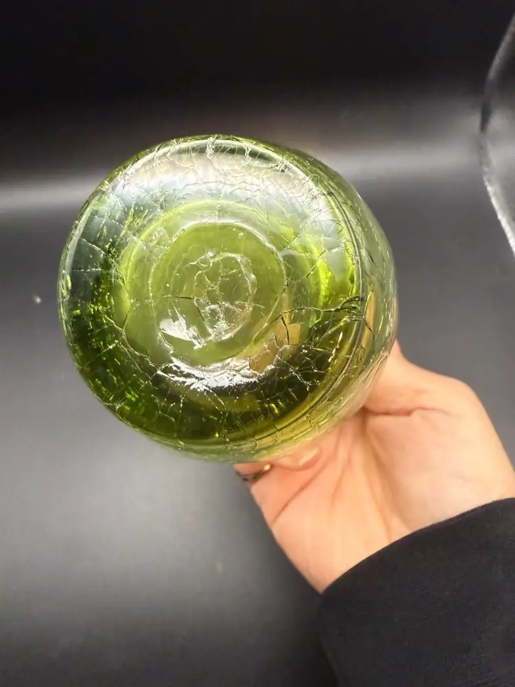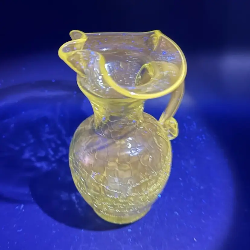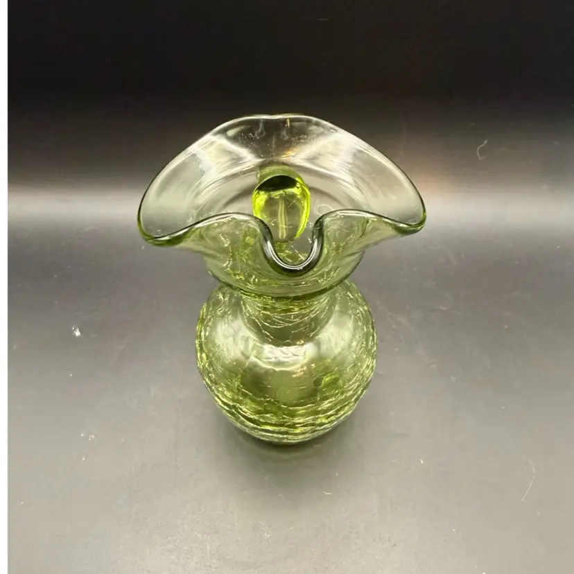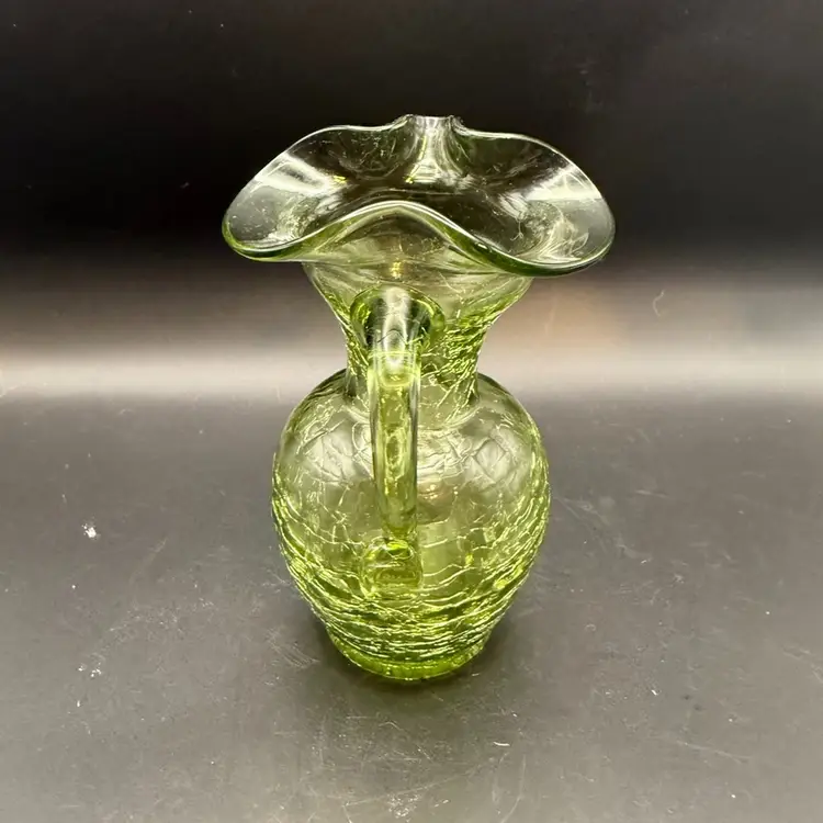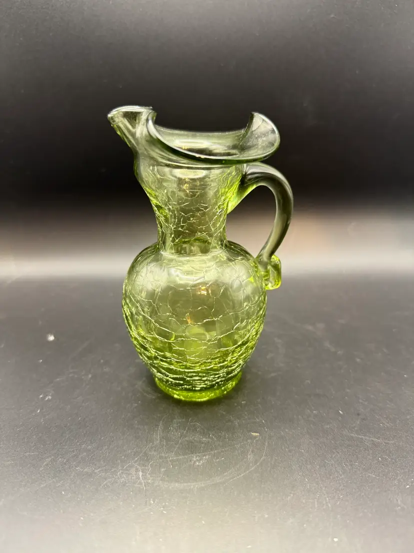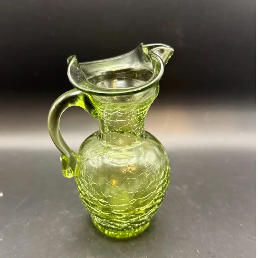 The crackle glass effect is created by dipping hot, molten glass into cold water, which causes the surface to crack. The glass is then reheated and blown to its final shape, which seals the cracks. The style of this pitcher is often associated with the mid-century modern period, specifically from the 1920s to the 1960s