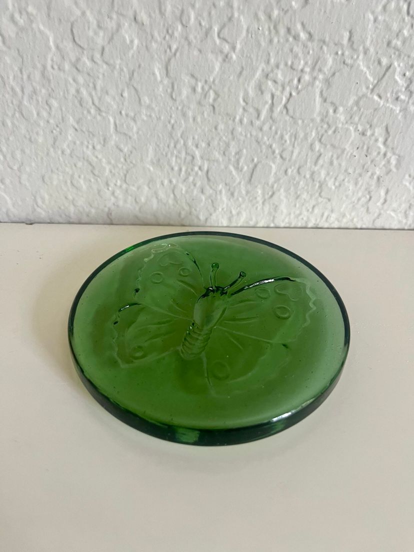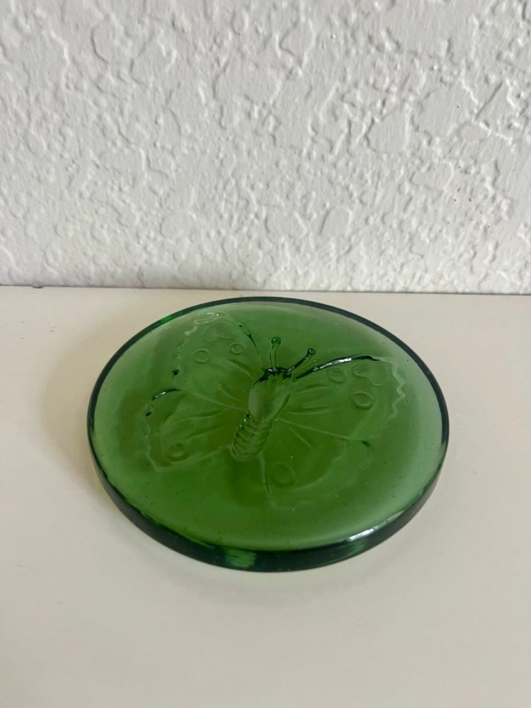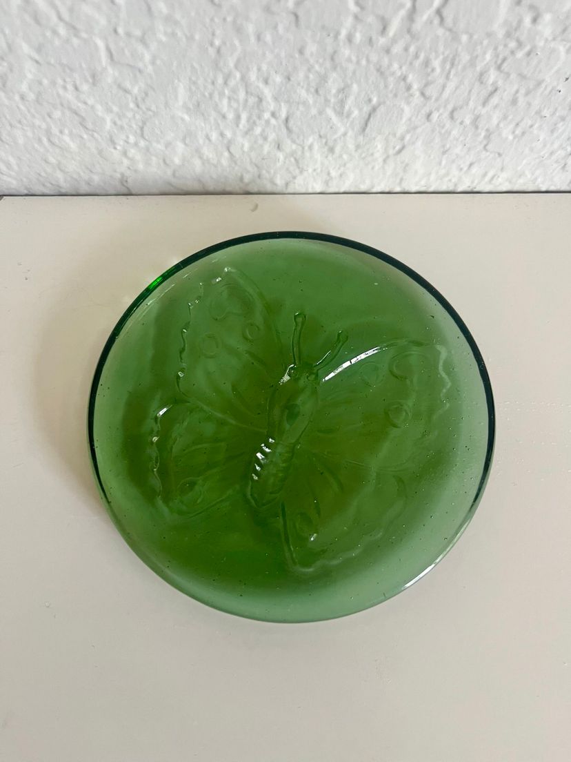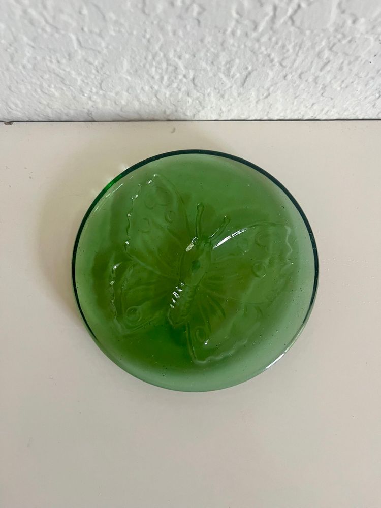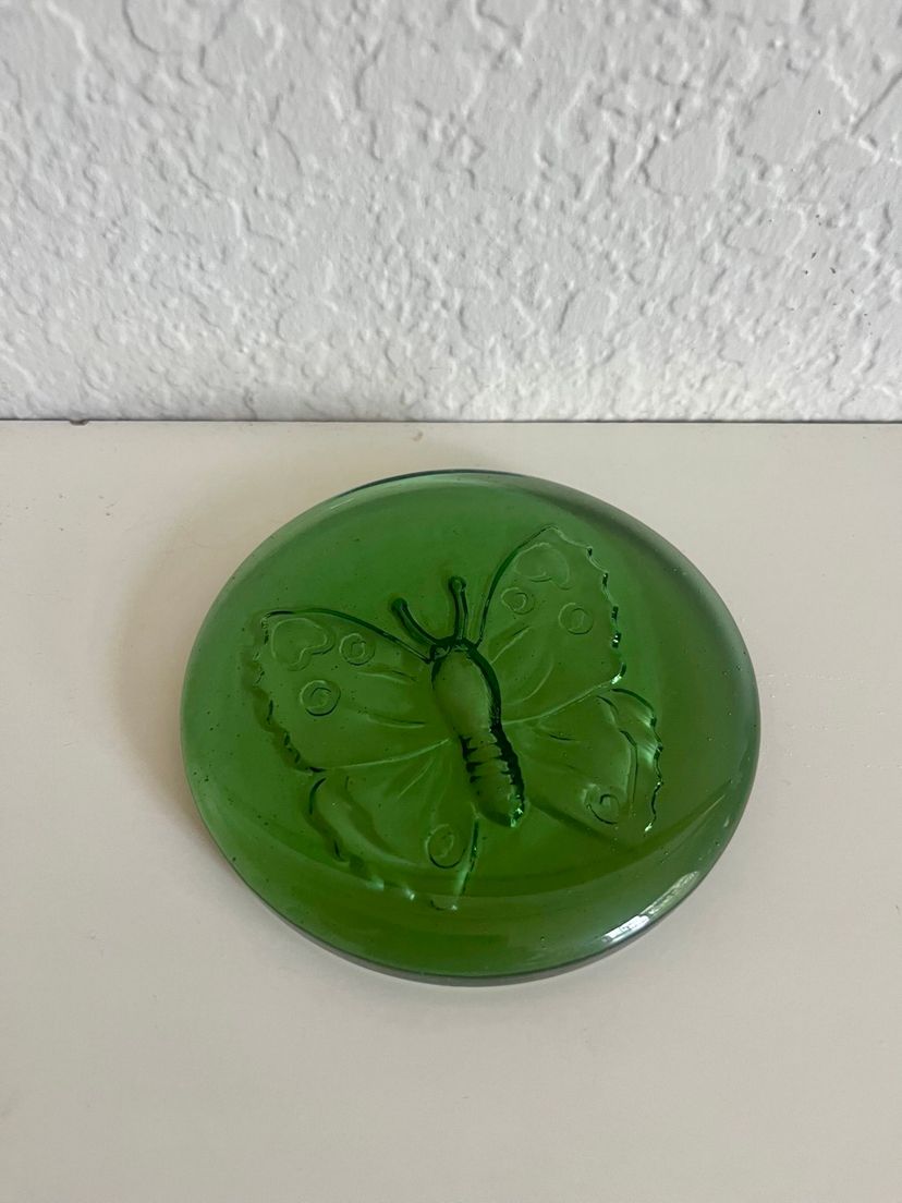 This pretty paperweight features an embossed butterfly design within a round, green glass form. No chips or cracks 4”