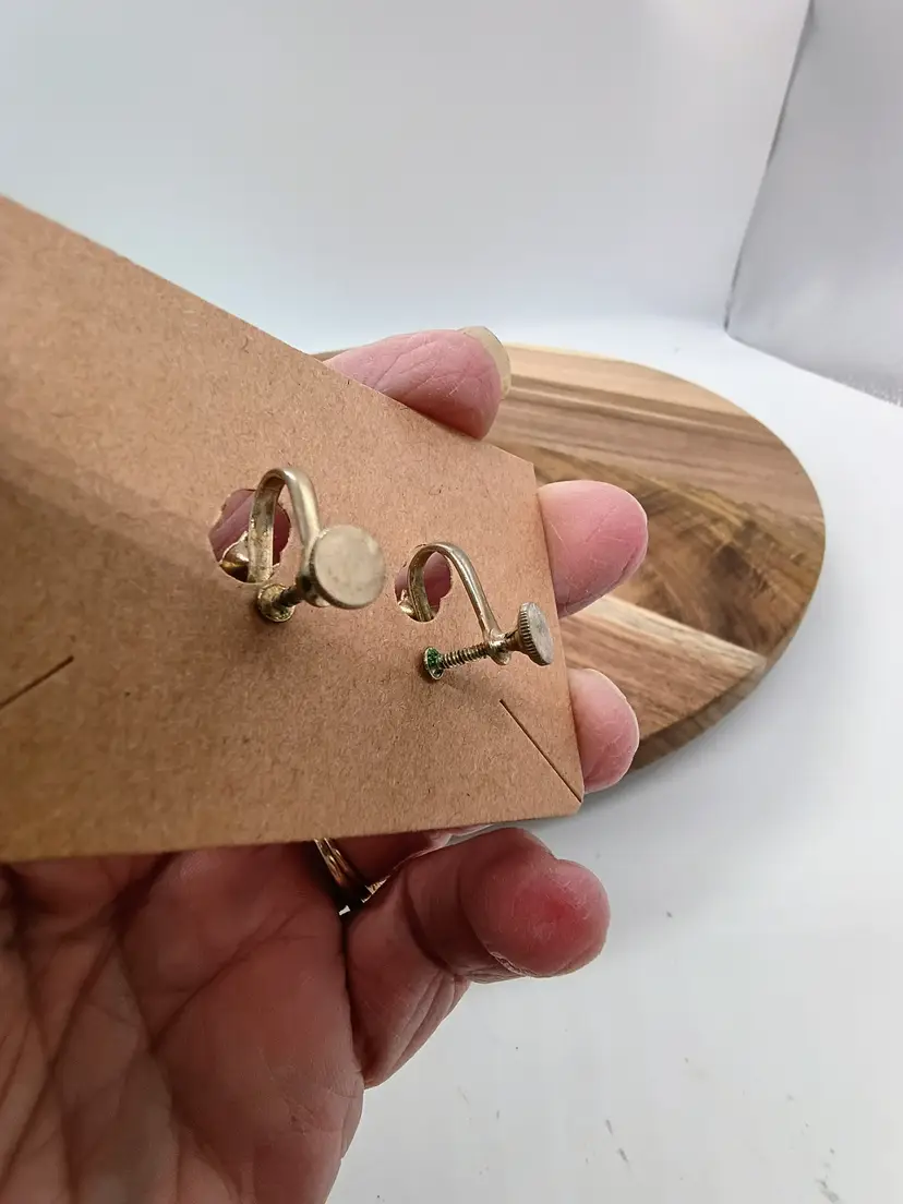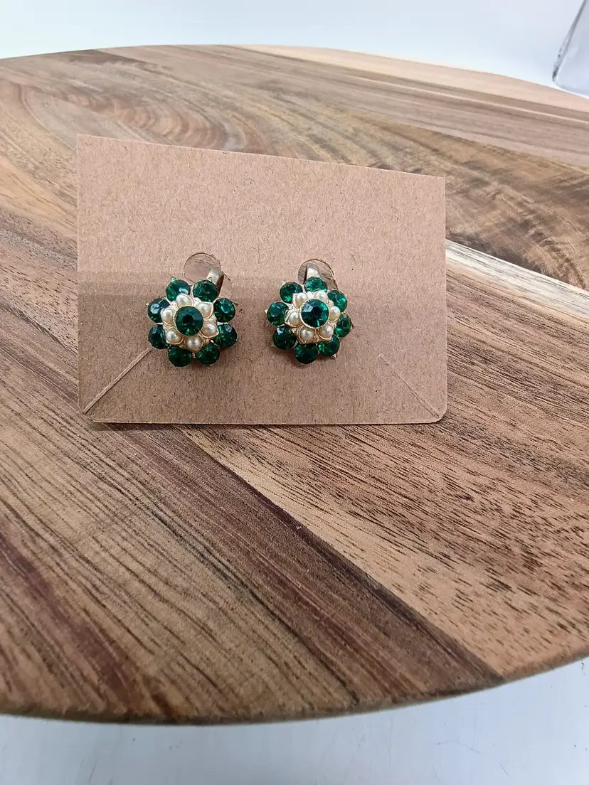 Vintage Green Glass Rhinestone & Pearl Gold Screw Back Earrings Flower. 3 tiered setting style for a 1/2 inch diameter flower. Rhinestones then pearls then larger rhinestone. Screw backs are intact and function normally. These are preowned Vintage to Antique Circa 1920-1936 Pre WWII. All the stones are present. There is little to no oxidation on metal. These came from an estate of a lady who fled Eastern Europe prior to WWII . I'm pretty sure these a Czech made. Excellent condition. Ships USPS