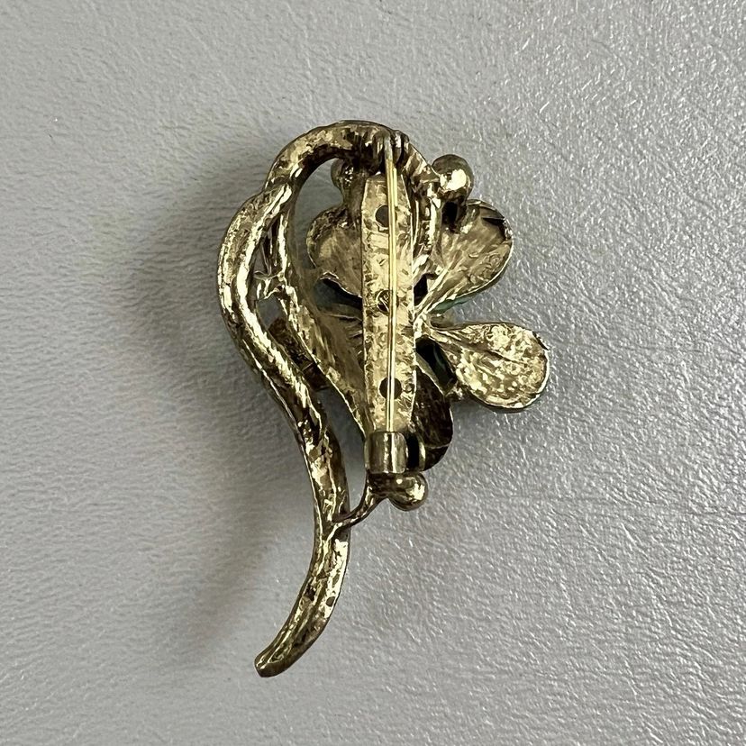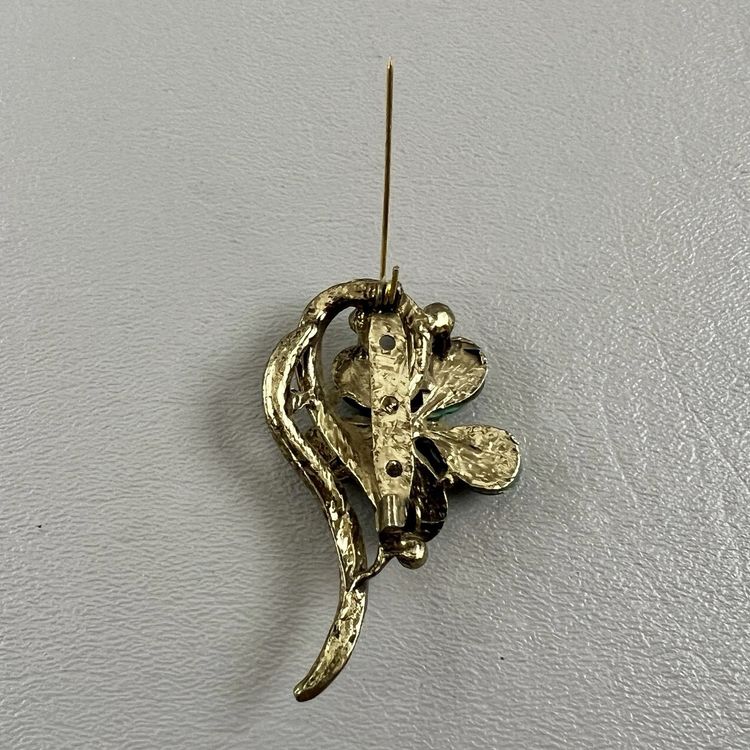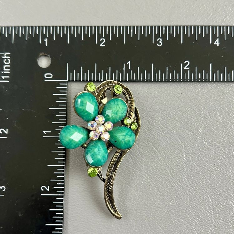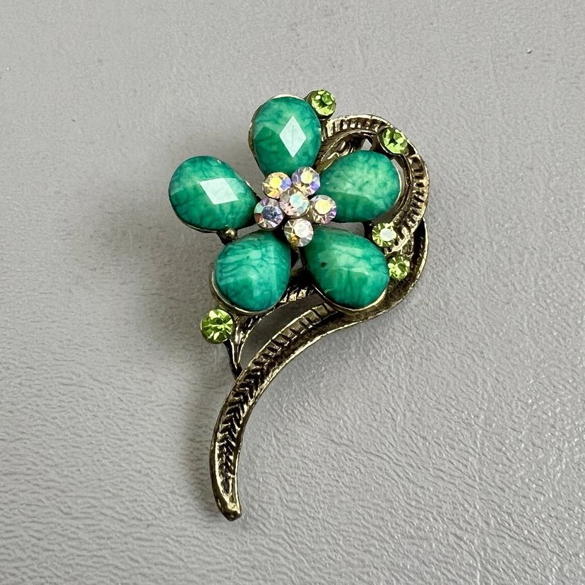 Vintage Green Rhinestones Daisy Flower Brooch Pin 2.5" Large Faceted Gold Tone Large blue green tear drop shape faceted rhinestone petals.