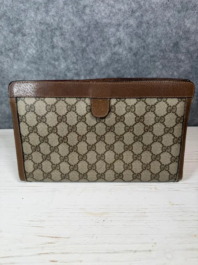 Authentic vintage Gucci GG canvas Accessory Collection clutch / long wallet, made in Italy. This is a classic archival Gucci piece featuring the iconic GG monogram canvas with brown leather trim and signature web detail.