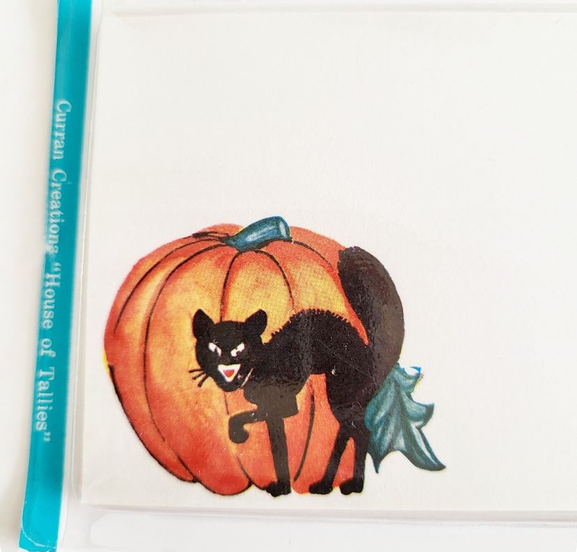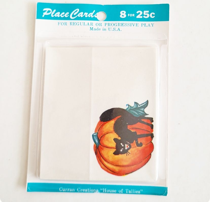 Vintage midcentury New Old Stock Halloween Black Cat Placecards. 8 cards in package. Curran Creations House of Tallies. Cards are 2.5 in x 2.75 in, package measures 3.5 in x 5 in.