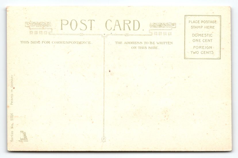 Printed in Germany during the divided back era (1907-1915), this postcard measures the standard 5.5 x 3.5 inches and showcases the exquisite detail and color typical of high-quality lithography of the time. The back is divided for correspondence and address, with a postage indication for domestic and foreign rates, and includes the series number 2516.