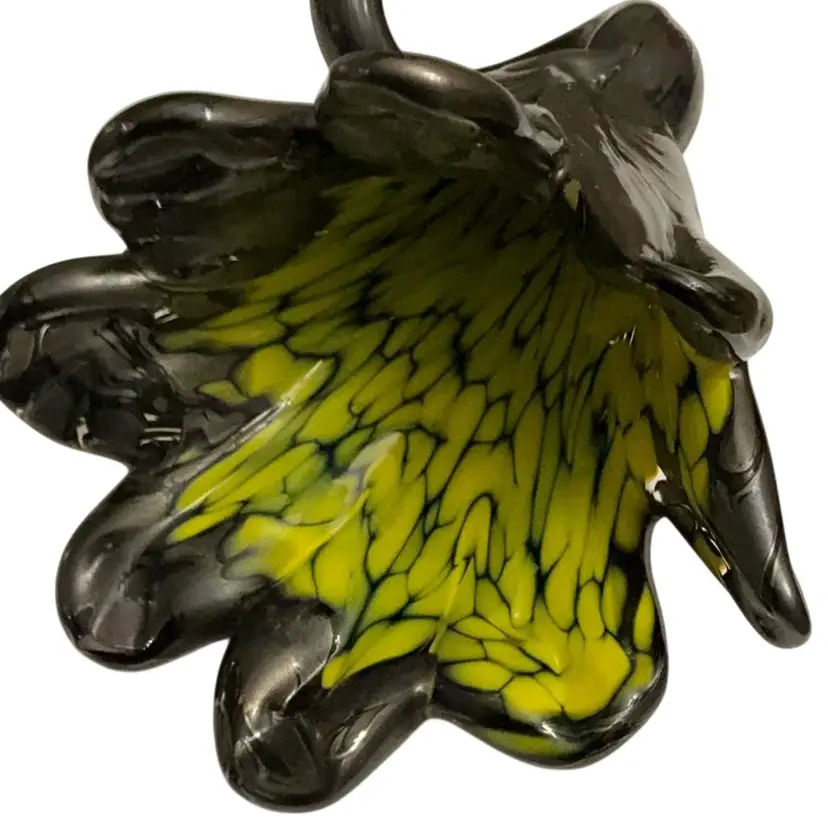 Beautiful hand blown flower. Lay on a shelf or display in a wide mouth vase. The yellow glows orange.
