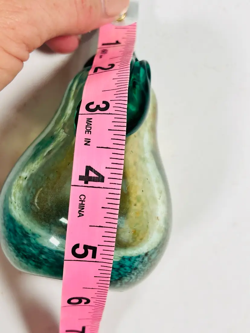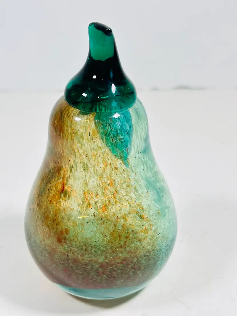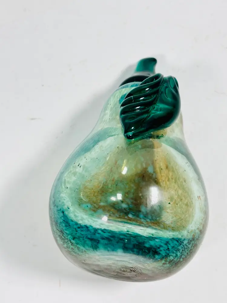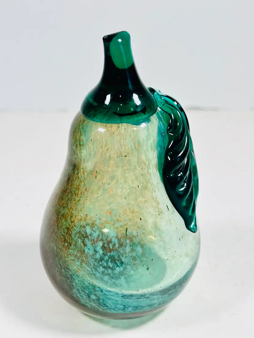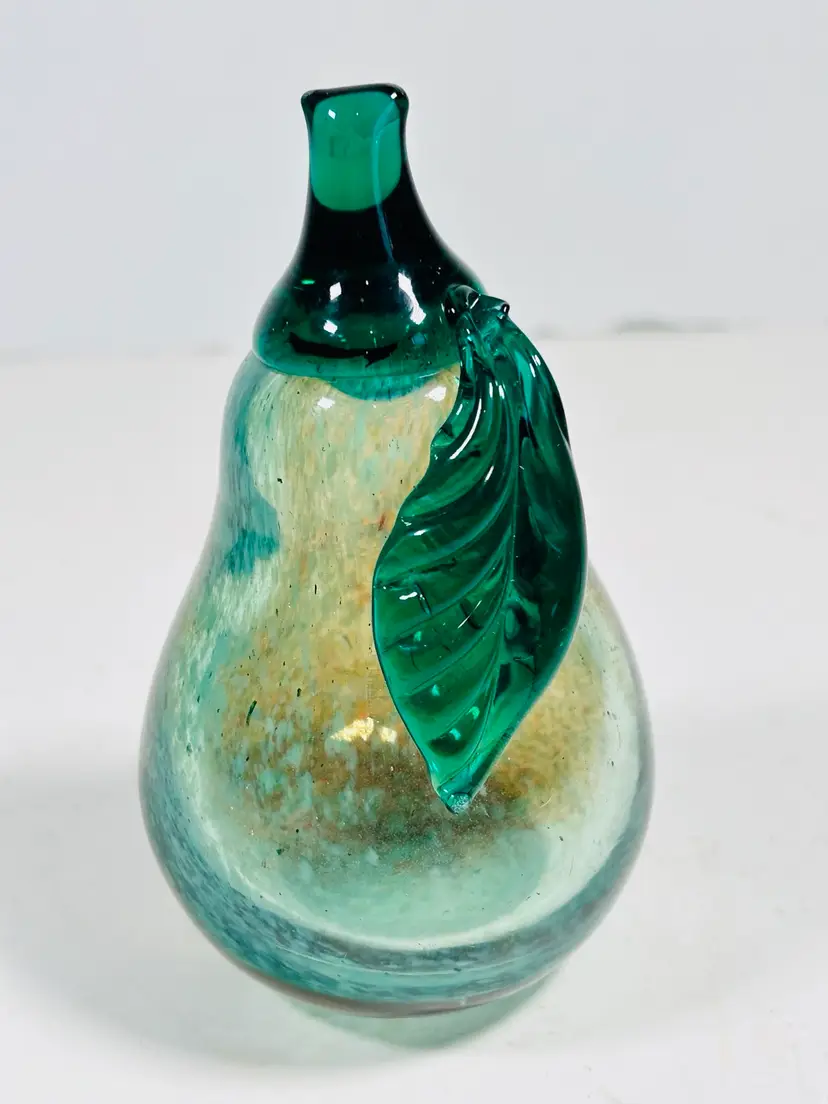 This vintage paperweight is a stunning piece of art glass that will add a touch of elegance to any collection. The hand blown glass has created a beautiful green pear shape with intricate details that showcase the skill of the artisan who made it. The hollow glass design gives the piece a unique and sophisticated look that is sure to impress.