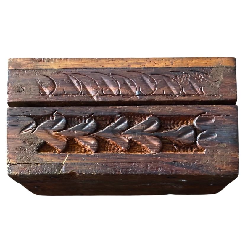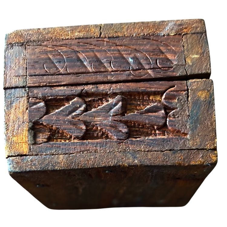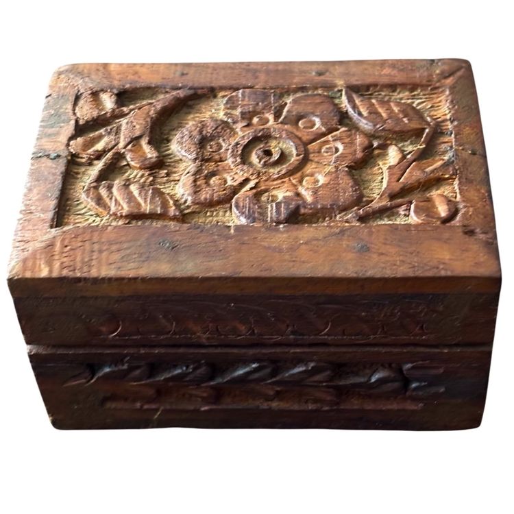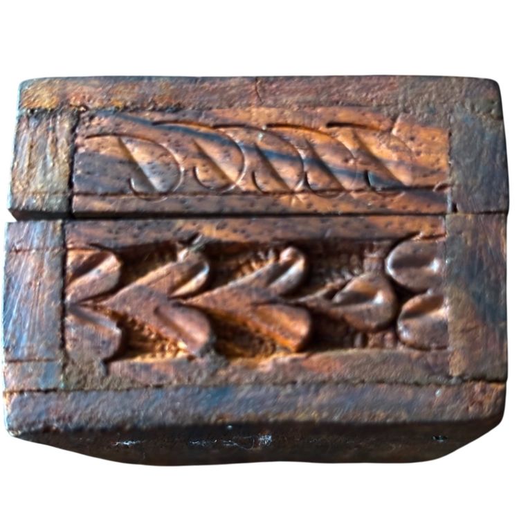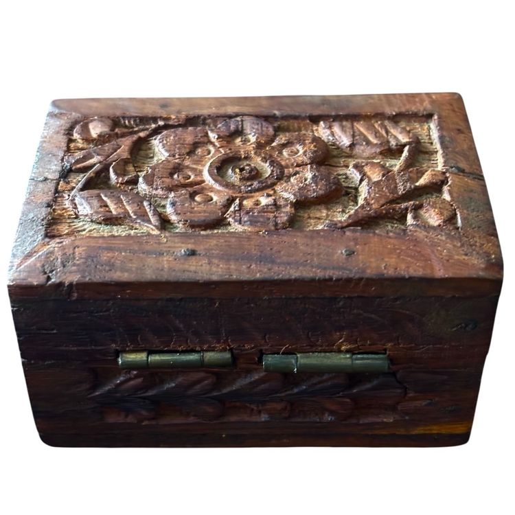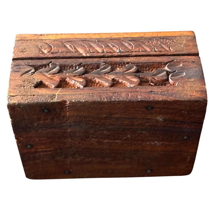 Vintage sheesham wood box is a beautiful addition to any home decor Hand carved with intricate details, this box is perfect for storing small items such as jewelry or keepsakes Measuring 2.75”x 2” x 1.5 inches, it is the perfect size for display on a shelf or dresser Crafted by skilled artisans, this box is a unique piece The hinged lid allows for easy access to the contents inside Perfect for those who appreciate the beauty of handmade items I could not find one made identical to this one!