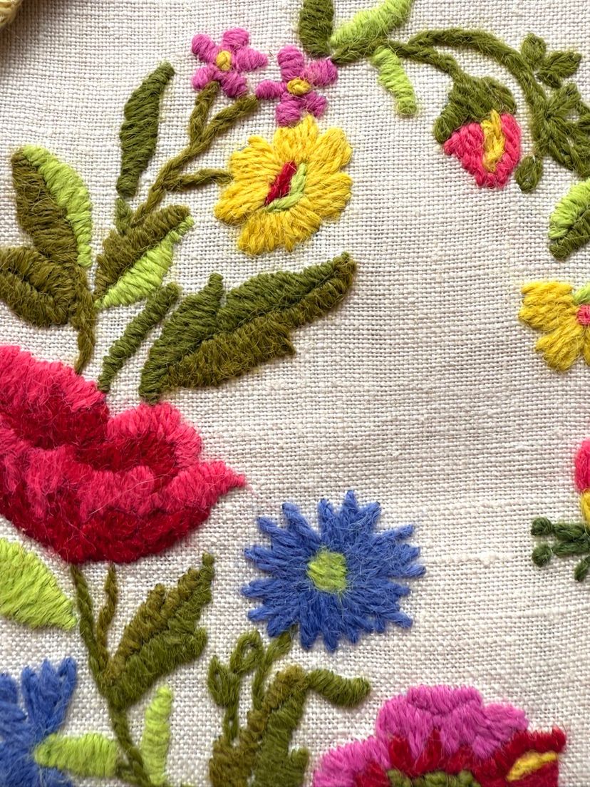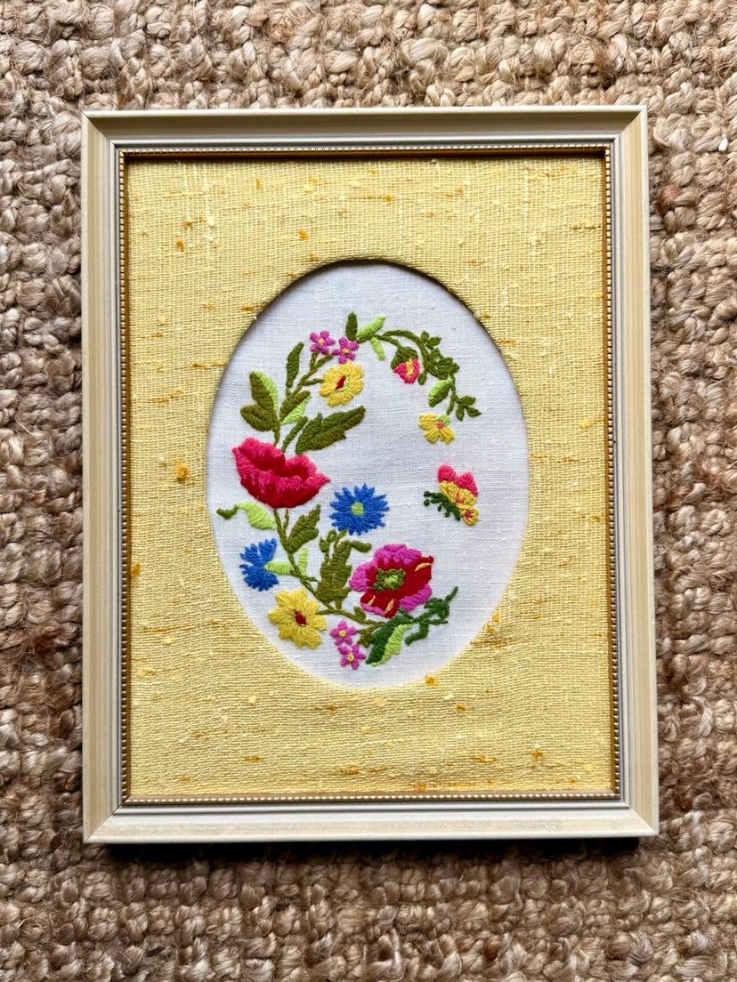 Add a touch of sweetness and charm to any space with this vintage hand-embroidered crewel floral piece. Bursting with vibrant pinks, blues, and yellows, it’s the perfect pop of color for a little girl’s bedroom or a vintage-inspired nursery.