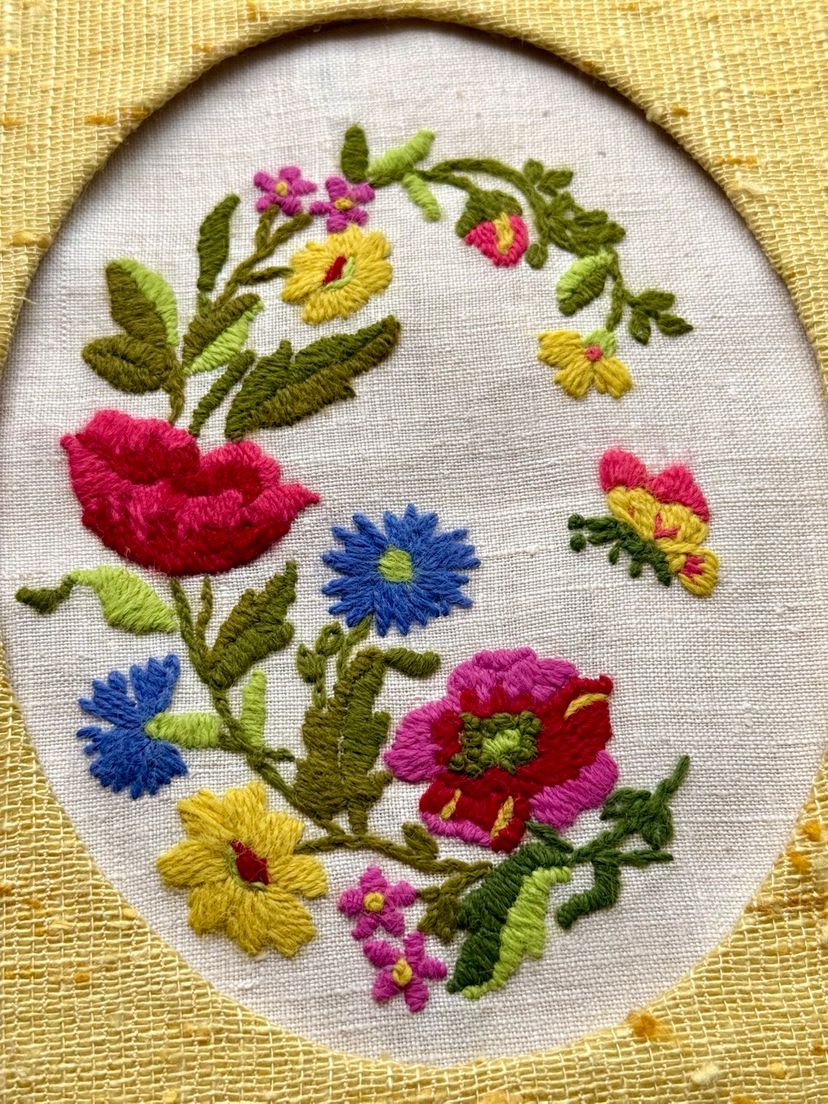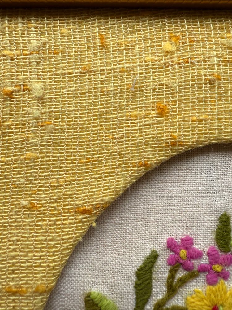 Material: Fabric, crewel embroidery, textured yellow linen, wood frame