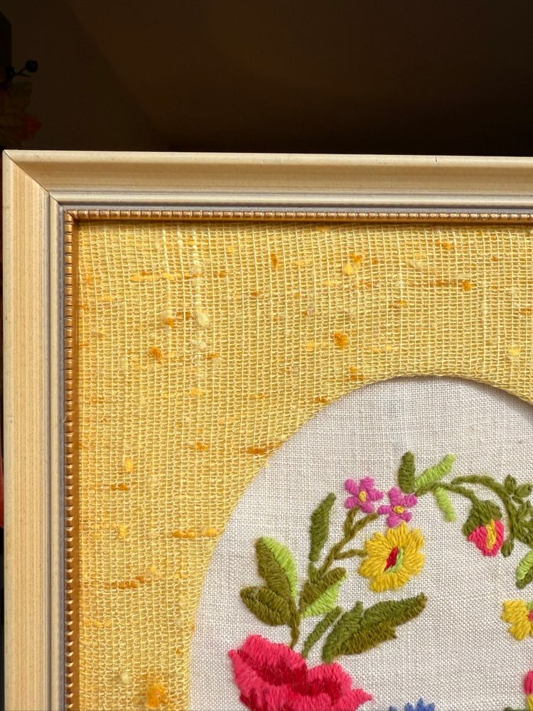 The soft yellow fabric background paired with the delicate white frame gives it a soft, inviting look that will make any room feel cozy and special. The hand-stitched details really stand out, showcasing the love and craftsmanship that went into creating this unique piece.