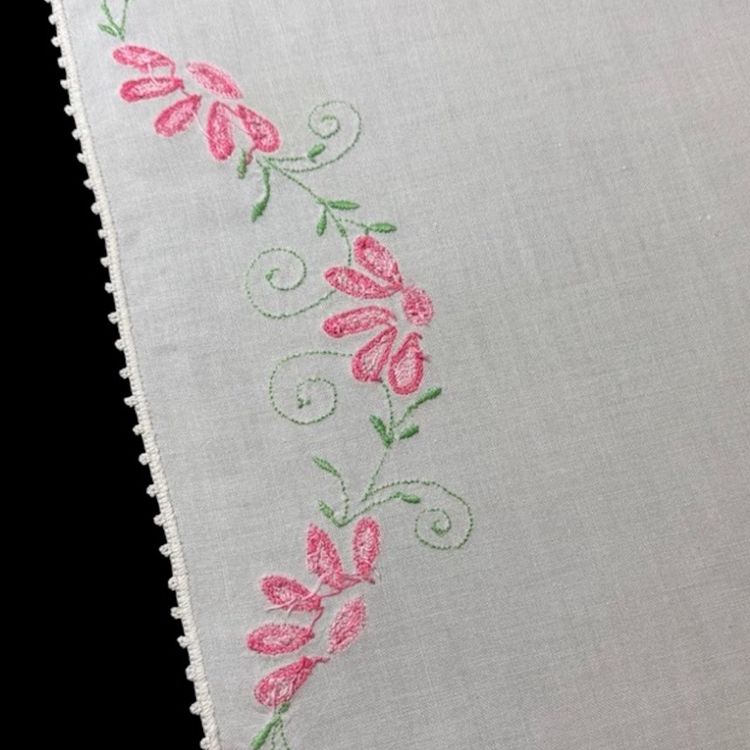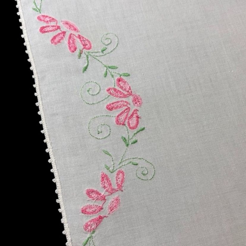Medium to lightweight hand embroidered white linen doily. Has pink flowers and green vines and leaves and a scalloped crocheted edge. Could be used as a dresser scarf or anywhere else you need it. The handwork is beautiful, very good quality. Excellent condition. 10”-32 ½” long 12 ½” wide
