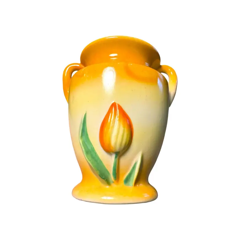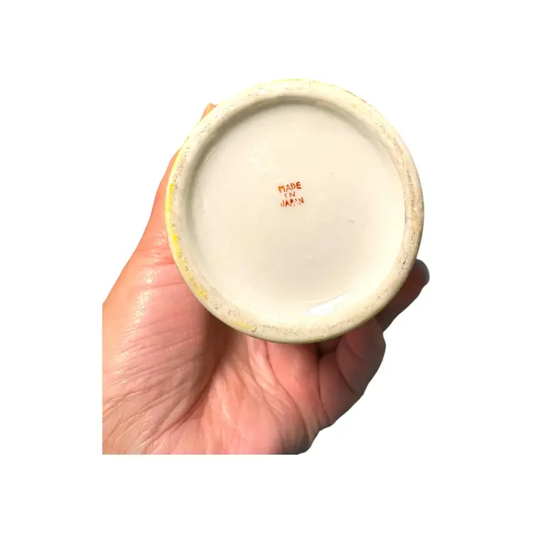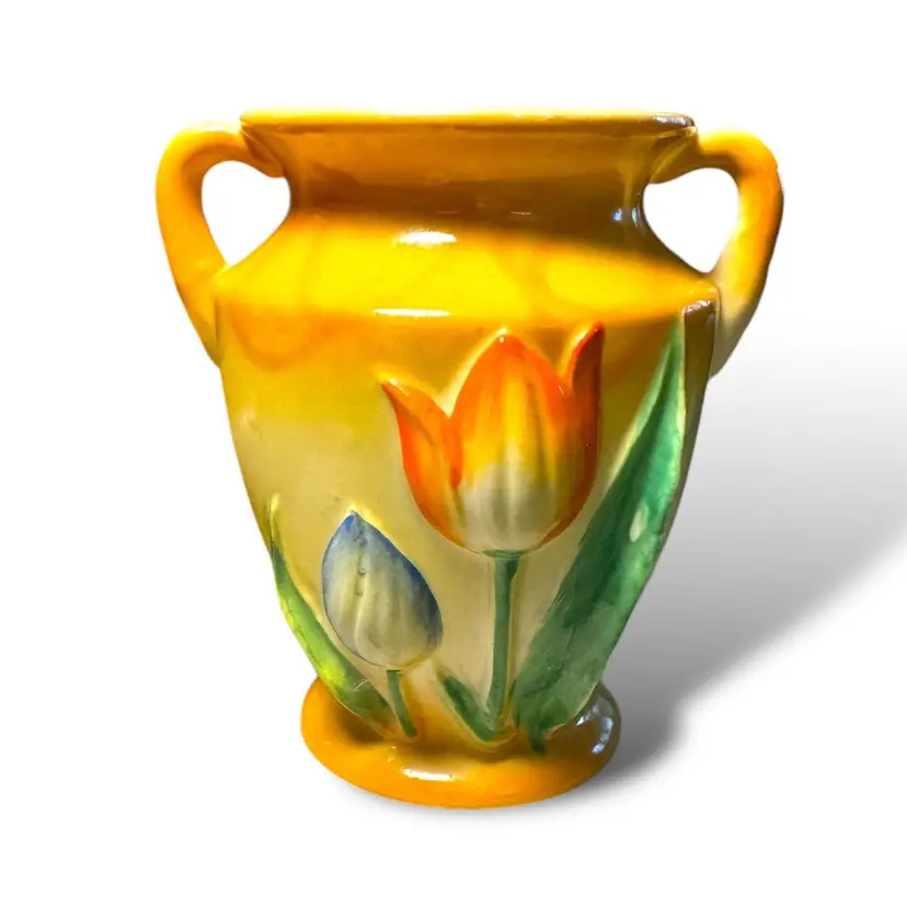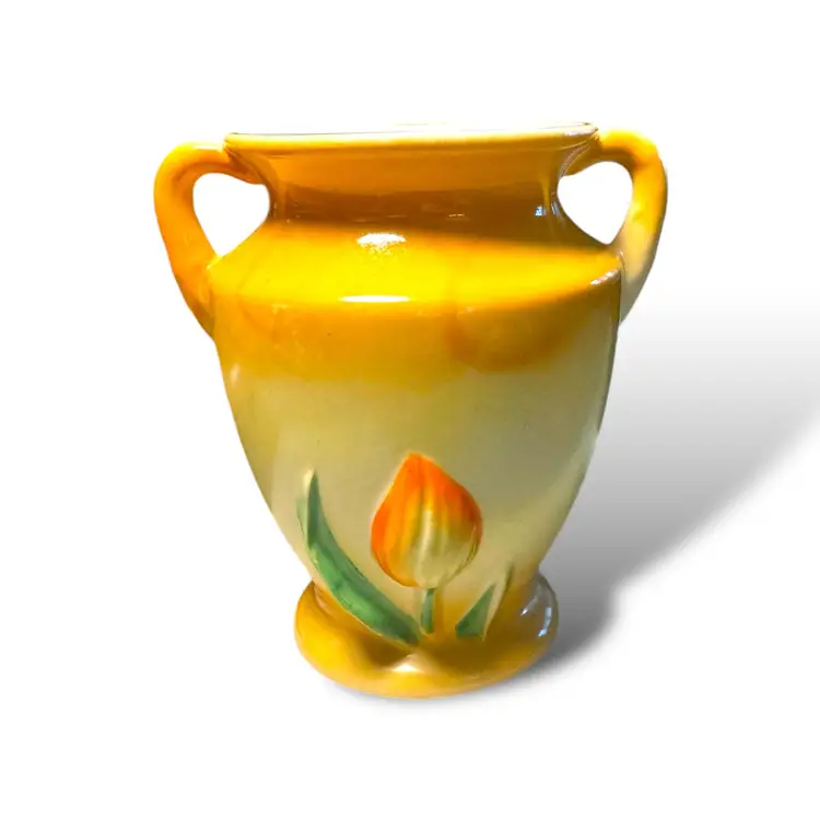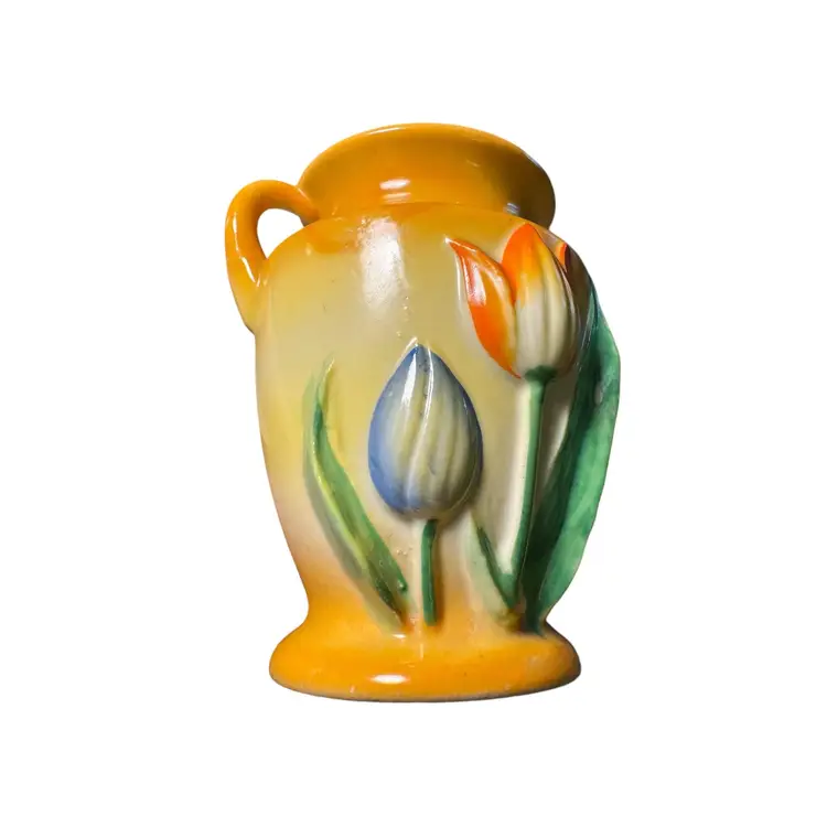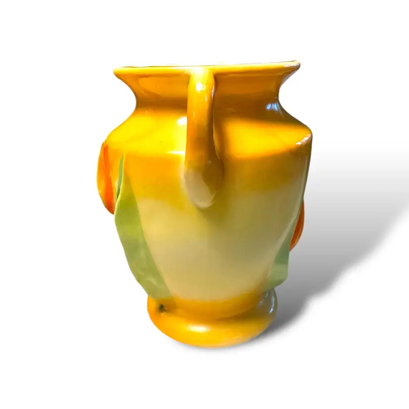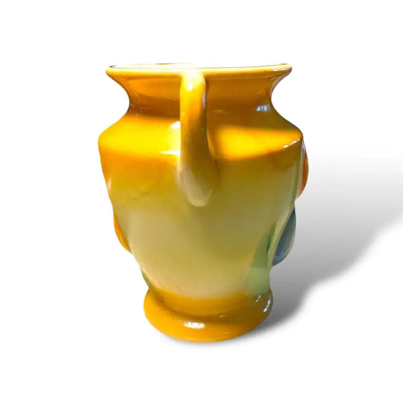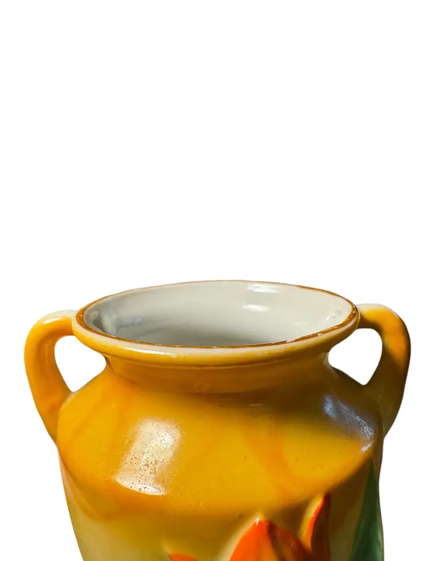 The vase has a mid-century modern style in yellow, orange, green and blue. Beautifully painted. The rim is trimmed in brown with some of the paint worn away.