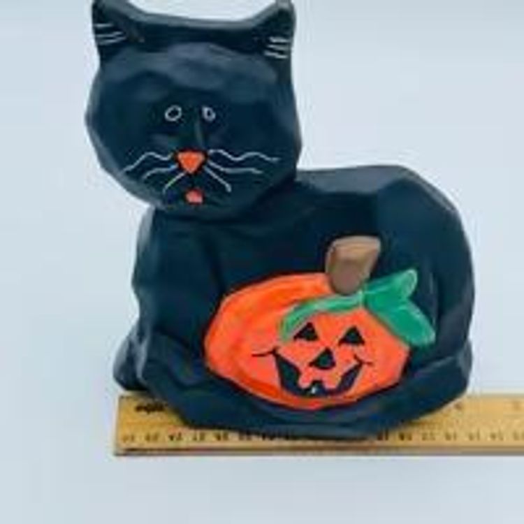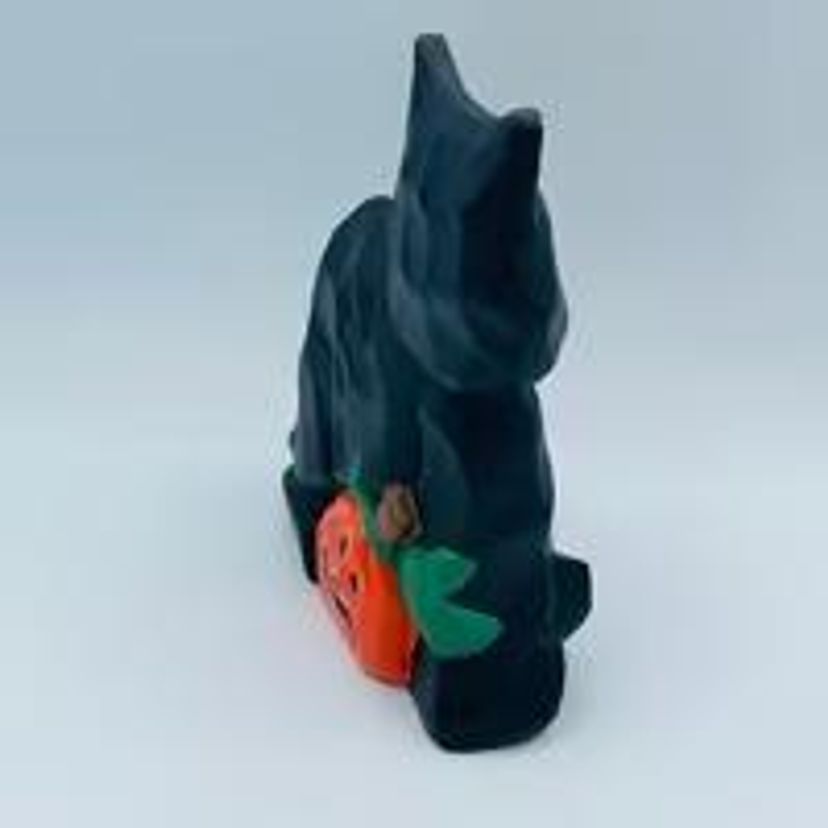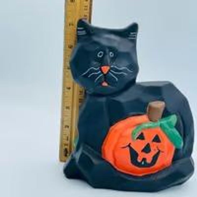 Charming vintage figurine featuring a black cat with a bright orange pumpkin. Perfect for adding a touch of Halloween spirit to your decor. Preowned condition- may have some mild paint chipping/wear. See all images for full details and more info.