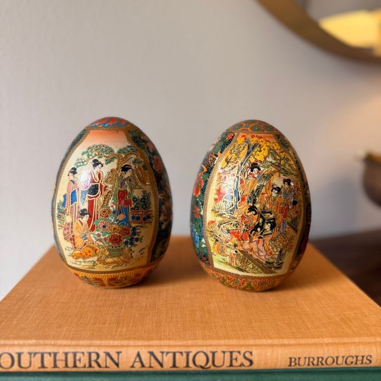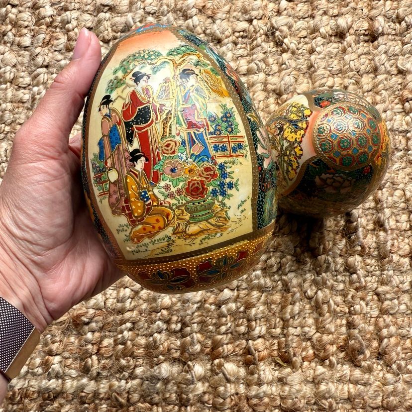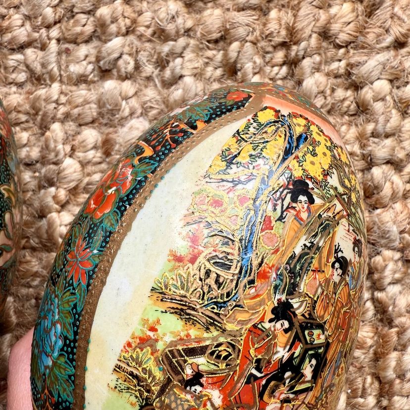 This is a beautiful pair of vintage hand-painted porcelain eggs from China. Each egg features intricate, colorful enamel-style designs depicting traditional Chinese figures in garden and court scenes, surrounded by ornate floral borders and gilt detailing.