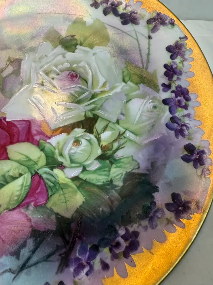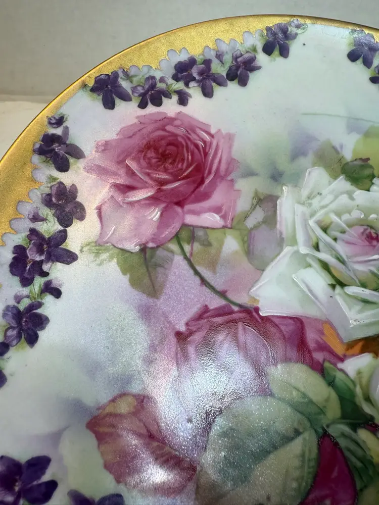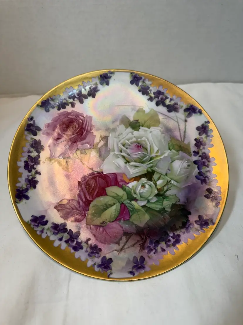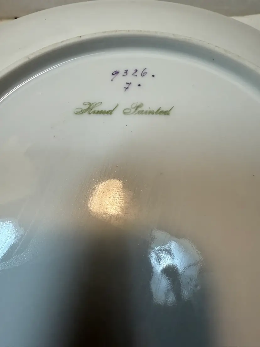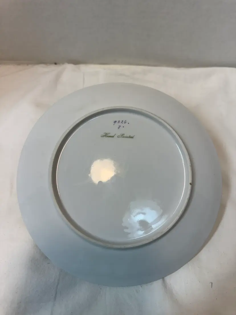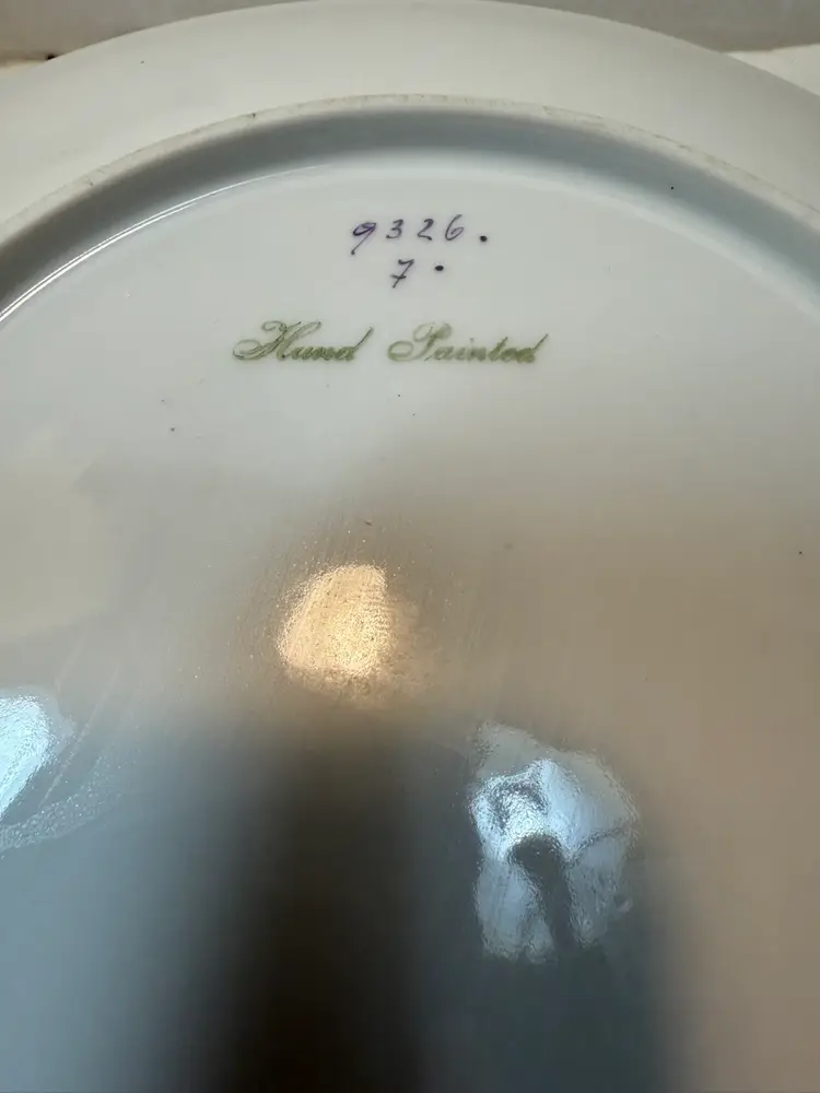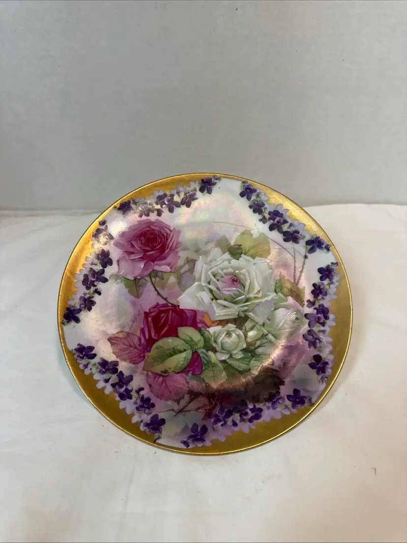 I’m guessing this is made in Germany labeled hand painted with pattern numbers and inventory but no makers mark . In great condition no cracks or chips, paint and gold gilding in good condition. Has a luster finish. Measurements are 8 1/2” wide.