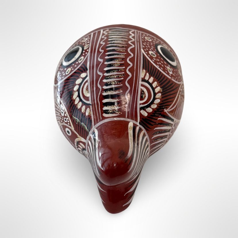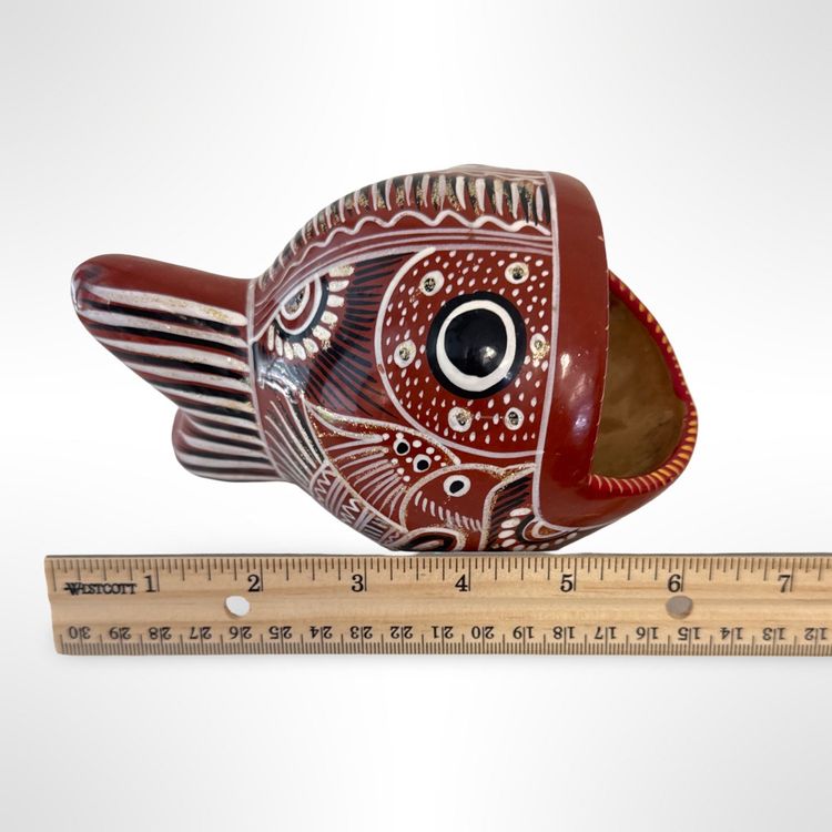 Great hand painted terra cotta pottery wide mouth fish sponge holder. Brown glaze with black, white, and gold glitter painted design. In good condition , with one small glaze chip on the mouth (see photos). Measures approximately 6.5” W x 3.5” H