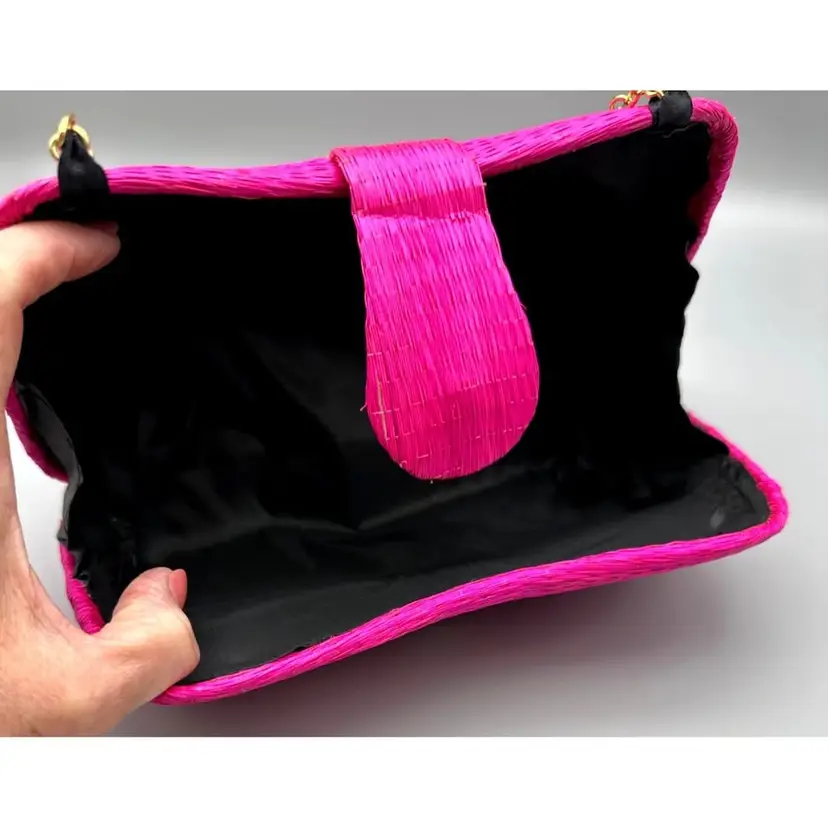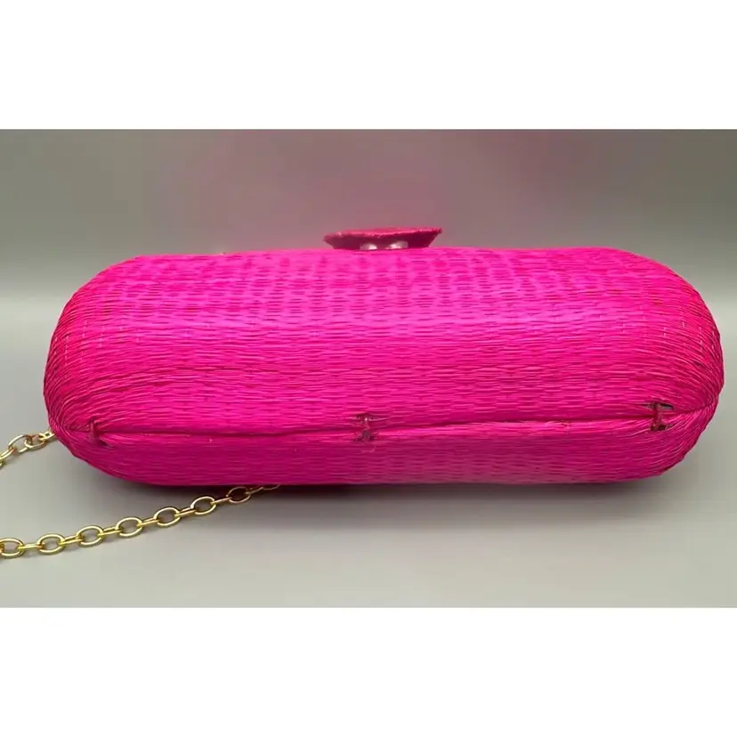A charming accessory showcasing vibrant pink woven straw craftsmanship paired with a delicate gold chain. This piece exudes timeless elegance for refined tastes.