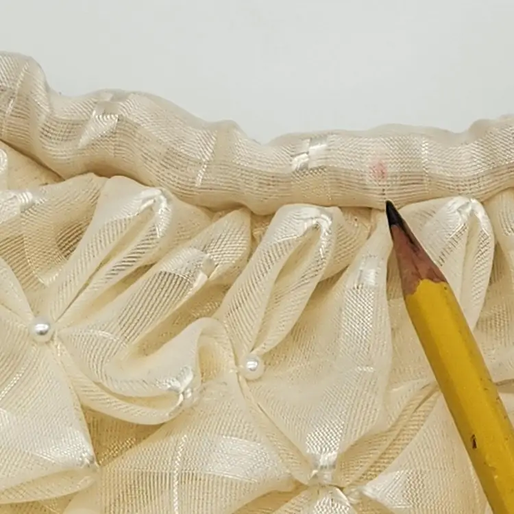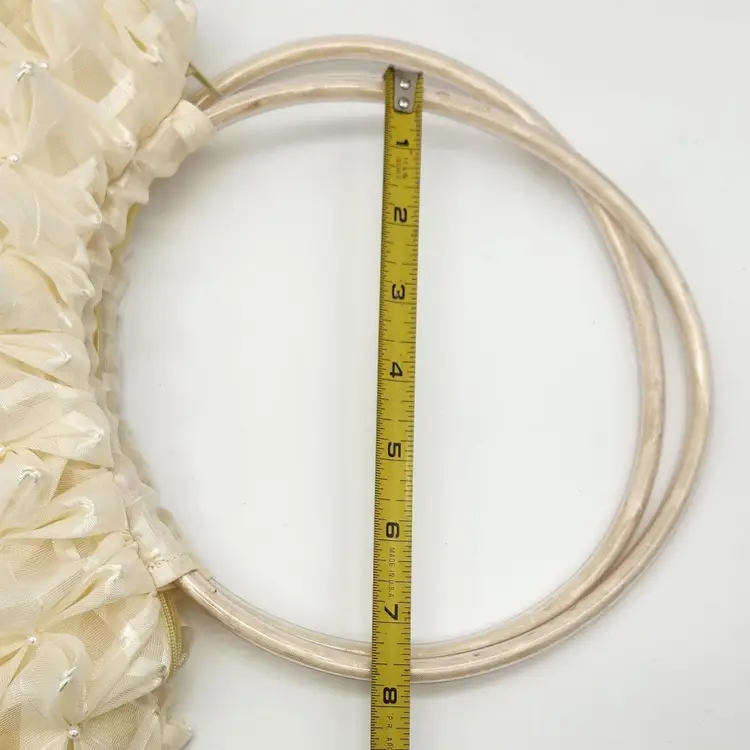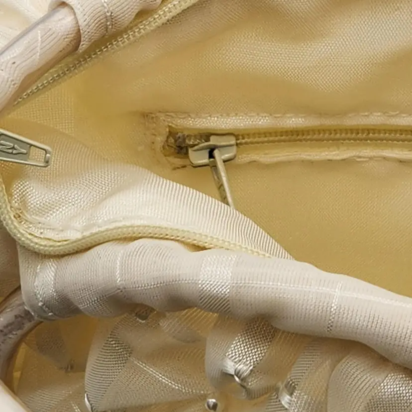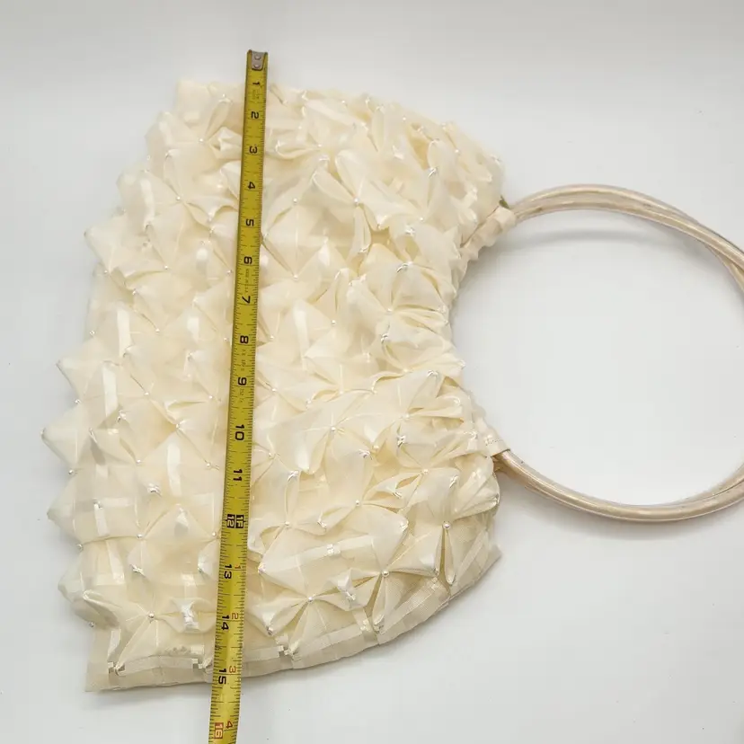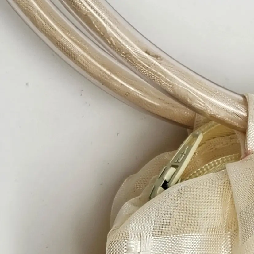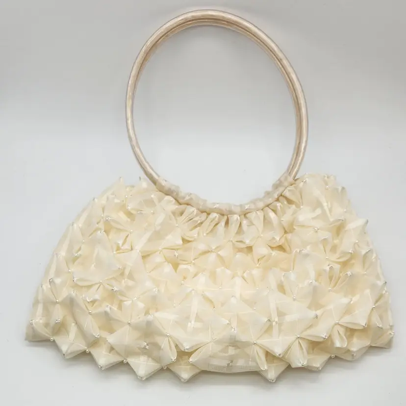 Vintage π Handbag - sheer ivory fabric, pintuck, tiny pearls, flexible clear plastic tubing handles, zipper closure & interior pocket. SO FUN to wear or as decor! Lovely condition with a few faint pink spots, as pictured. Some tiny pearls may be missing but it's hard to tell. See pics for measurements. Zippers work well. I will ship in a box in order to preserve proper shape. No identifying marks/tags. Never seen anything like this one. π