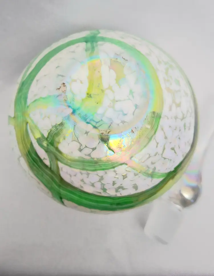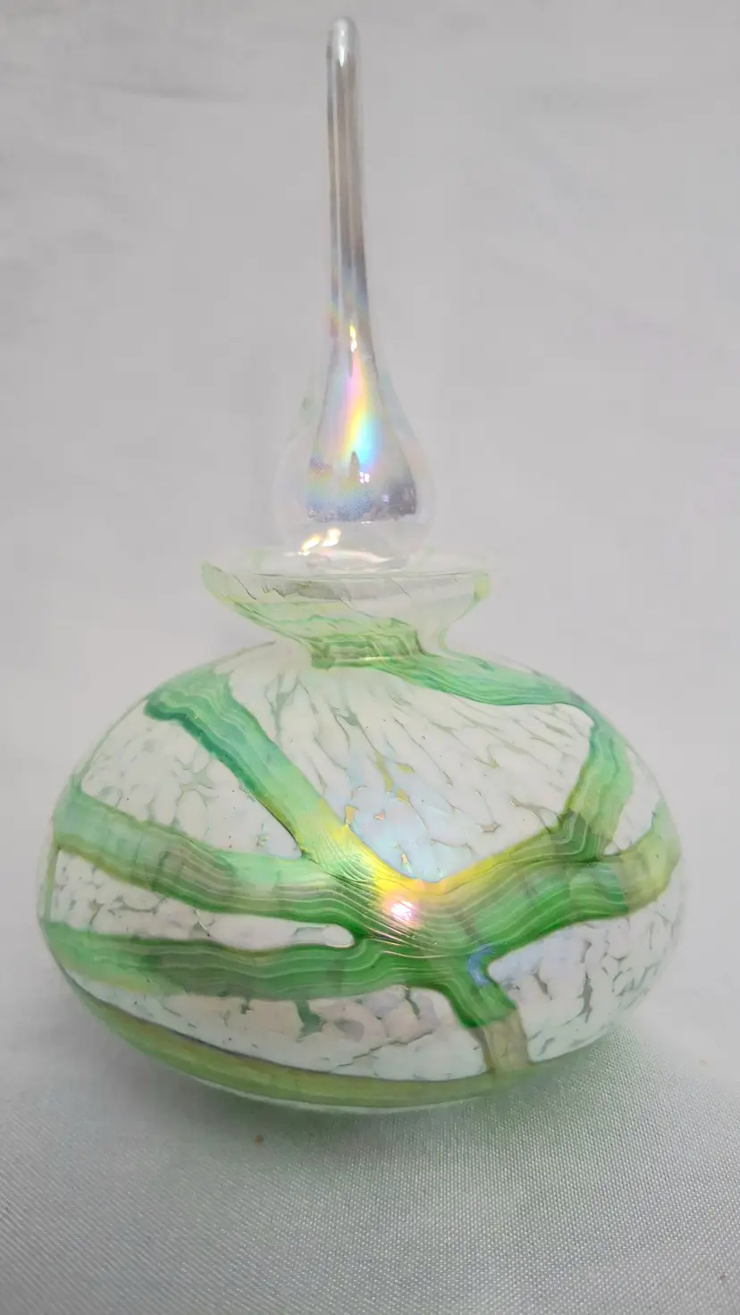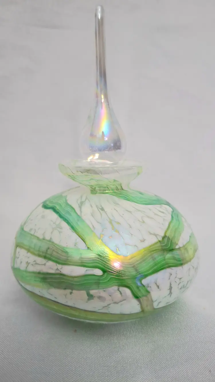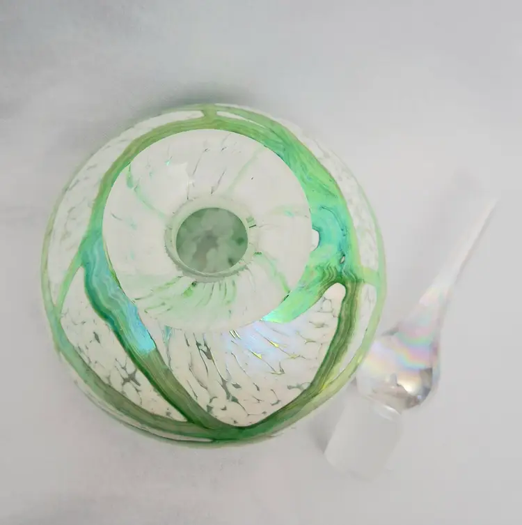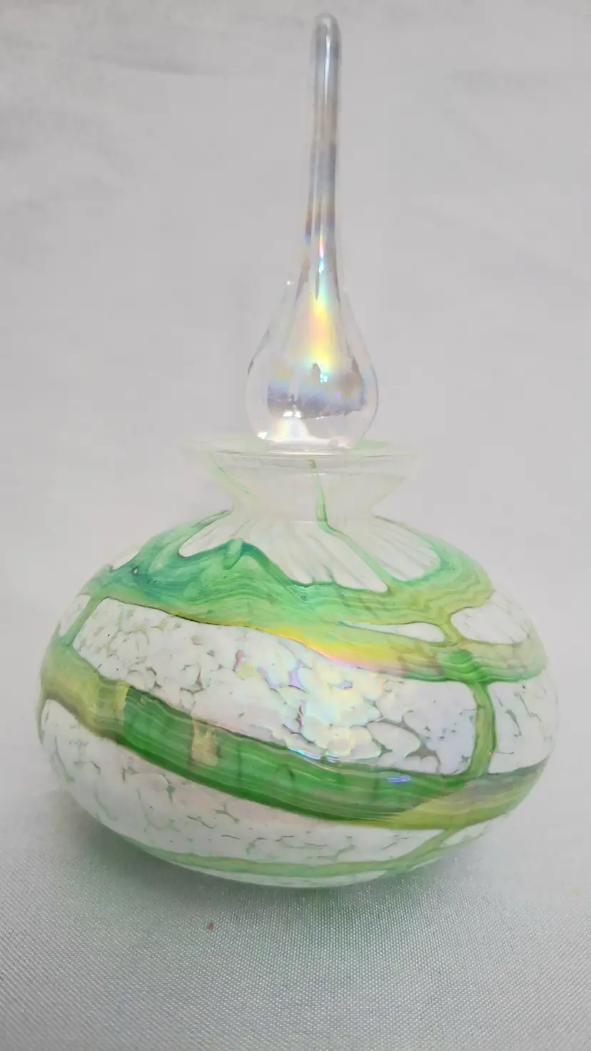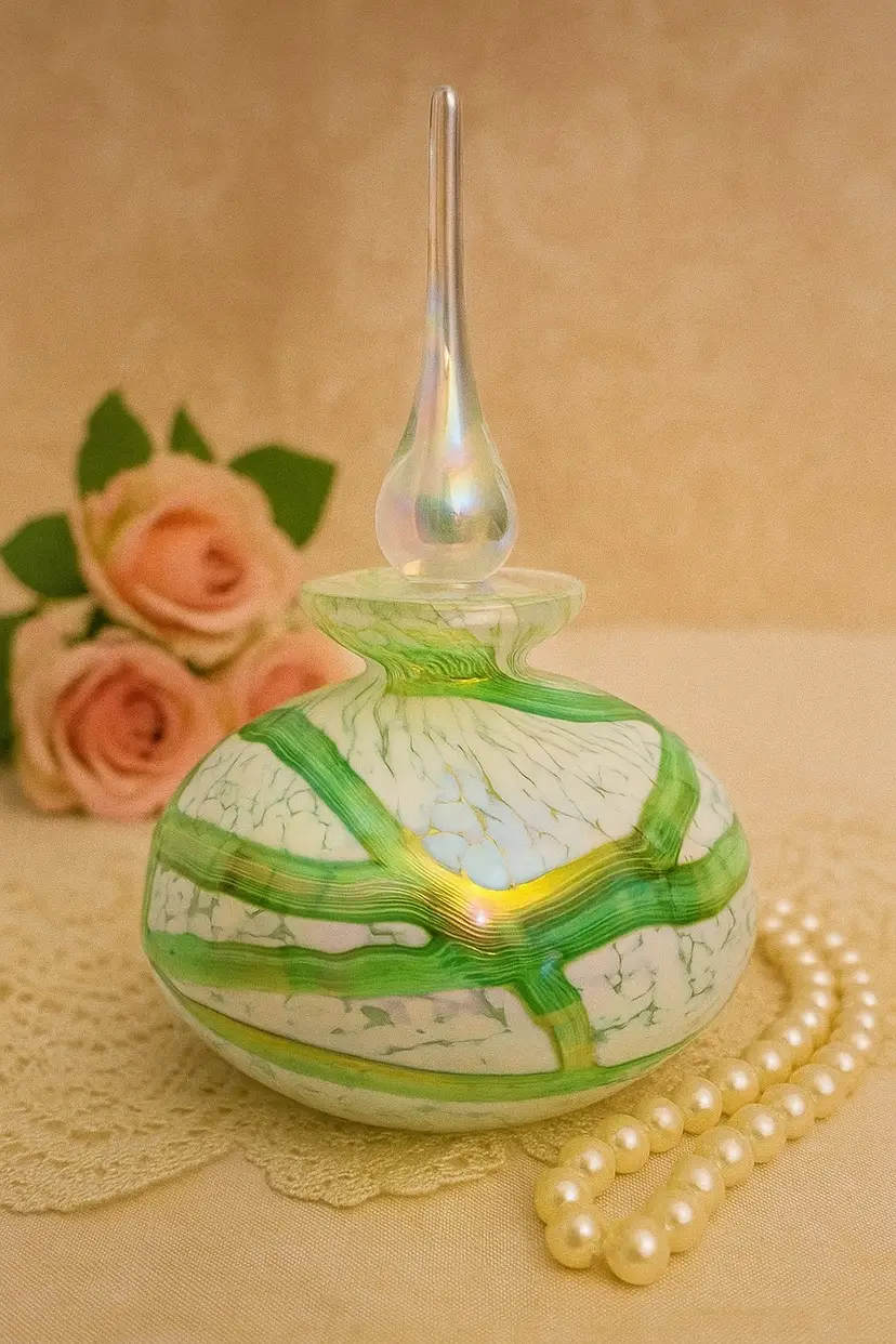 Vintage Handblown Art Glass Perfume Bottle – Green Swirl Frosted with Iridized Stopper. This vintage exquisite art glass perfume bottle stands 5½ inches tall and showcases a captivating blend of craftsmanship and elegance. The body features flowing green and white marbled glass with subtle iridescent highlights that shimmer beautifully in the light. Its tall, teardrop-shaped stopper glows with an ethereal iridescence, adding a touch of sophistication and magic. The bottle’s substantial weight and polished glass bottom reflect the high quality of its handblown artistry. A stunning decorative piece for a vanity or display shelf, this perfume bottle exudes timeless beauty and refined femininity — a true collectible for art glass lovers.