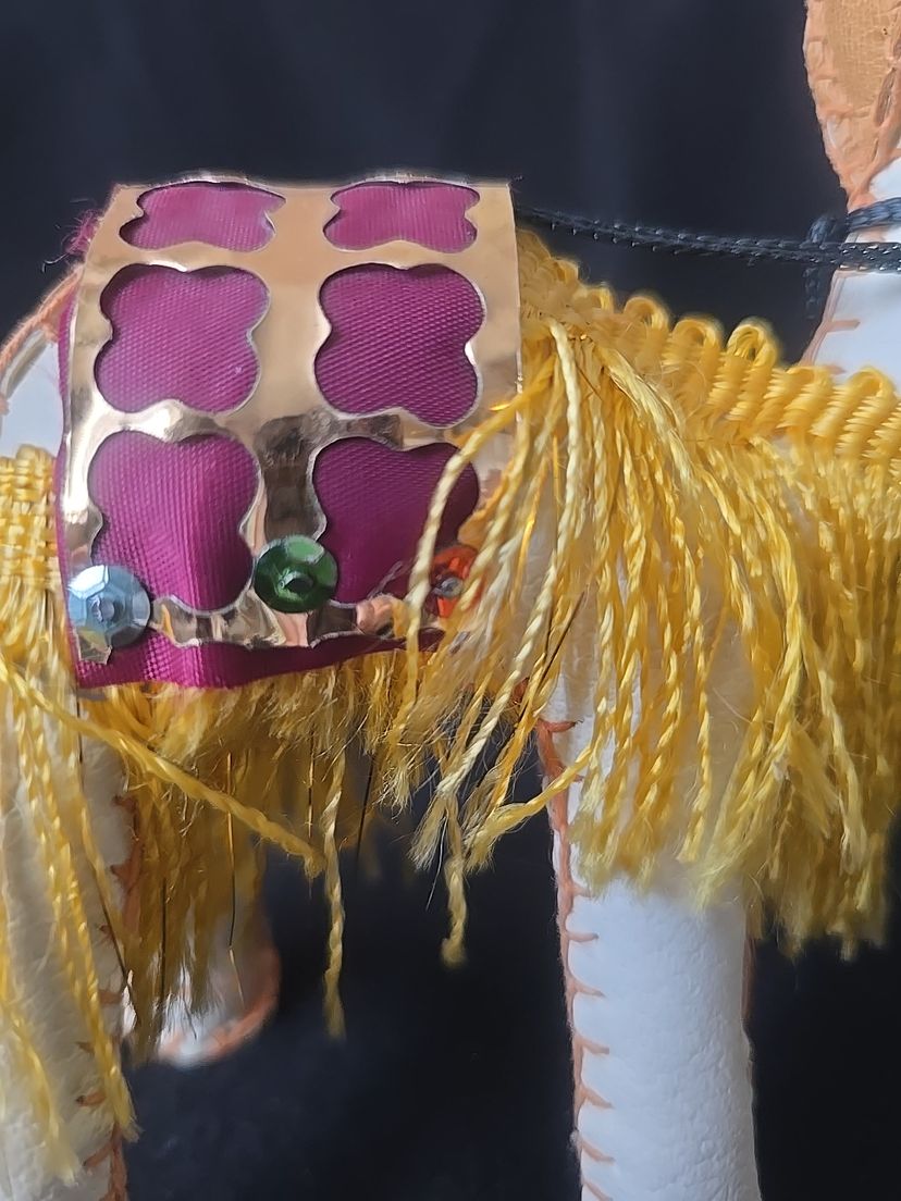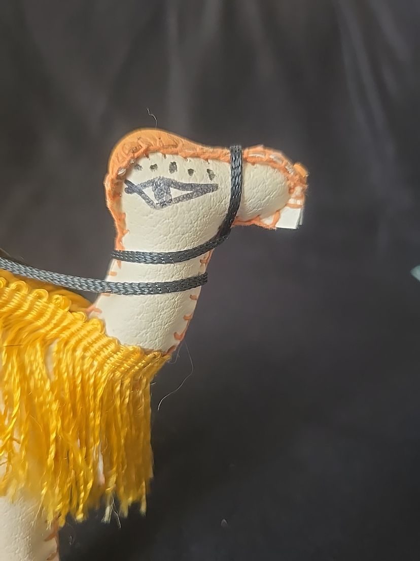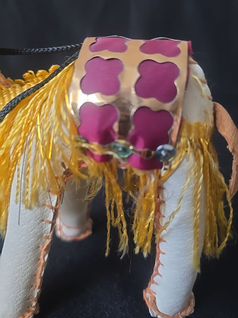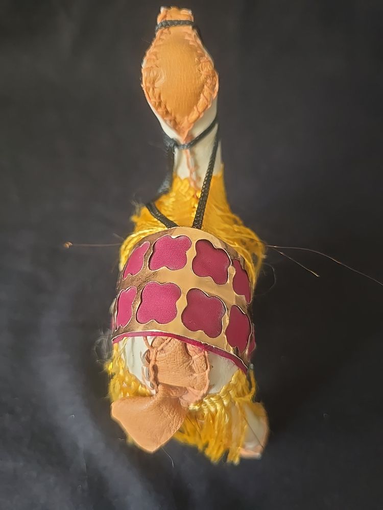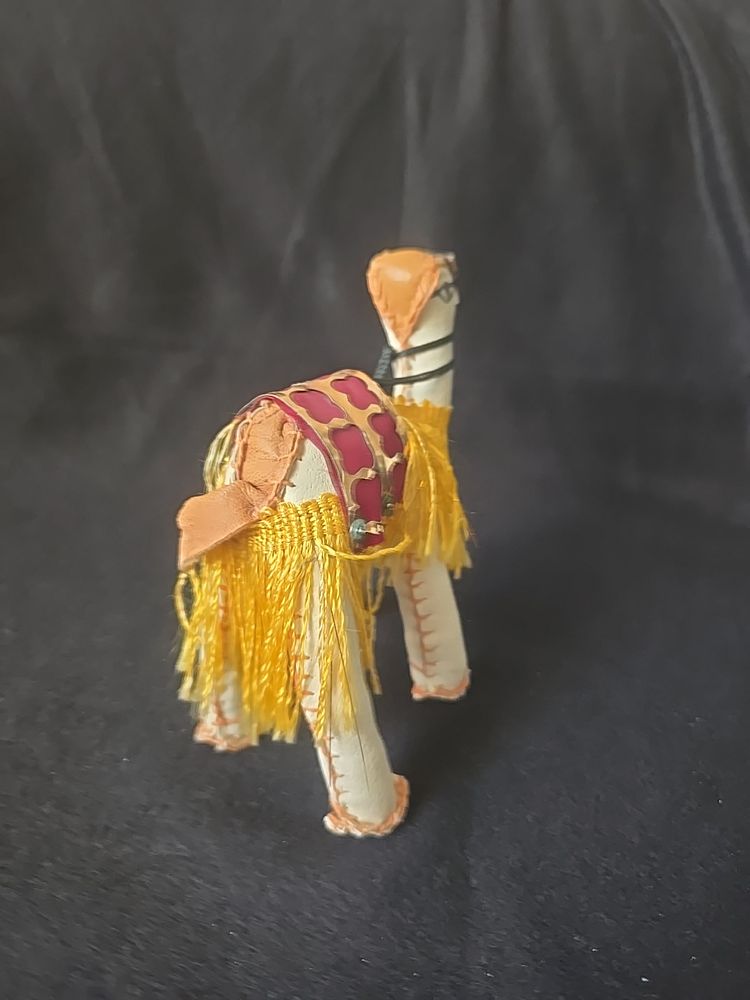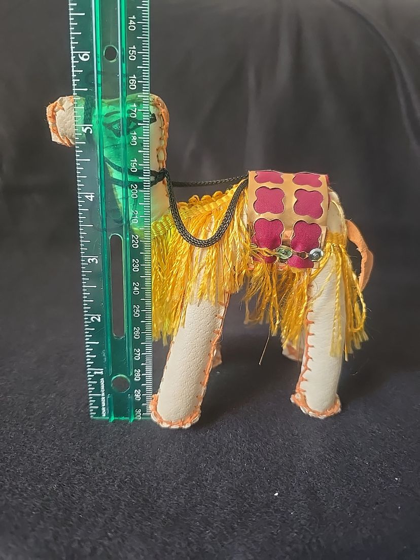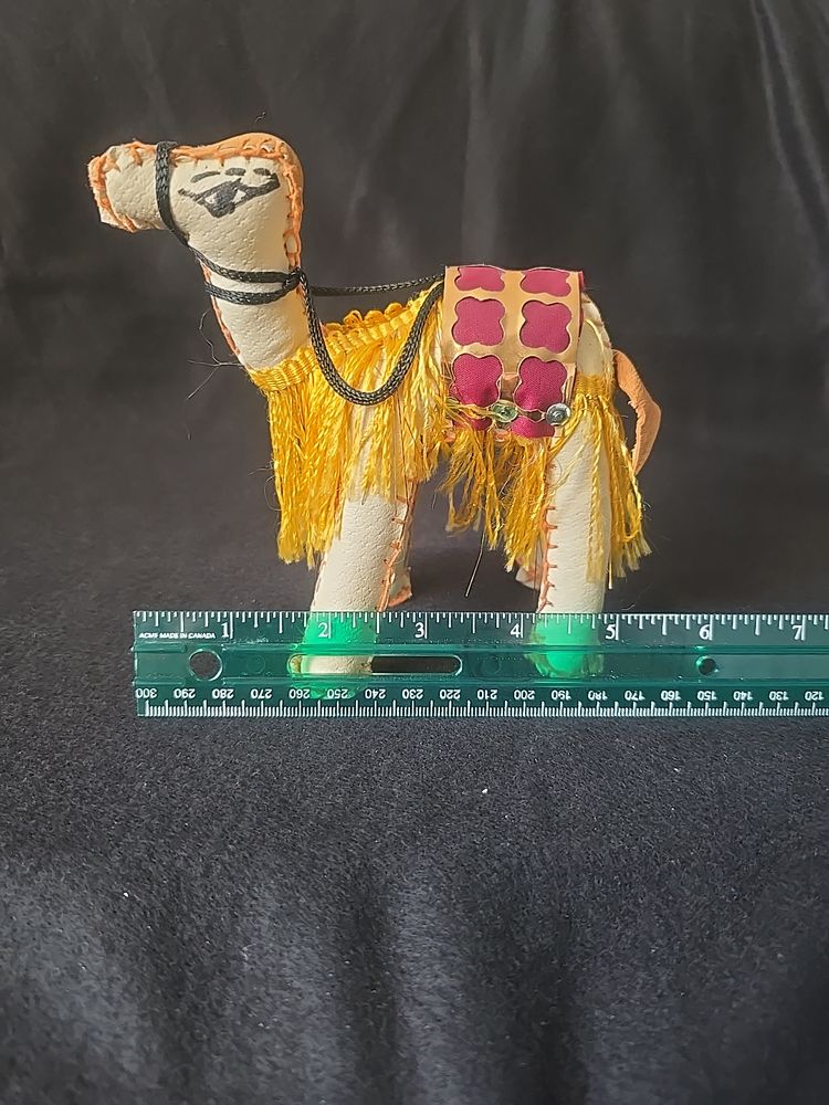 Unique vintage camel figurine, hand-stitched from leatherette with a colorful saddle and yellow fringe trim. Lightweight and likely mid-century, these were popular souvenirs from the Middle East and North Africa.