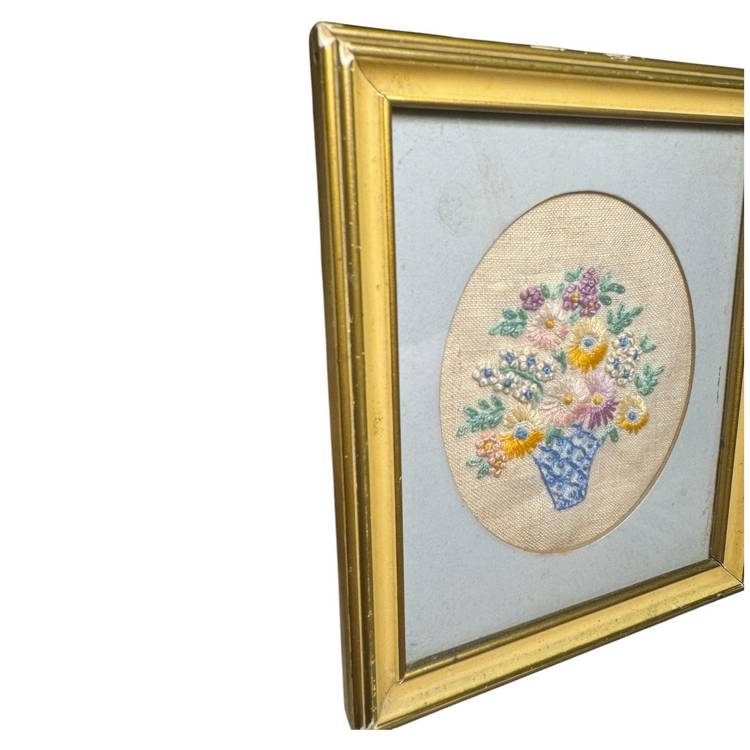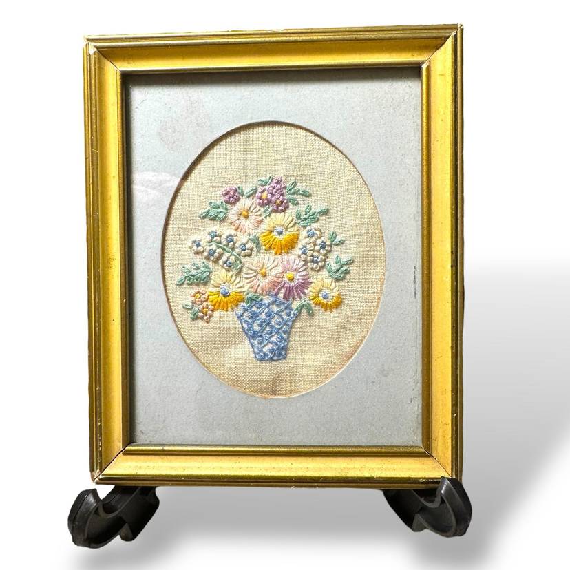 Vintage Framed Embroidery- Flower Bouquet in a vase