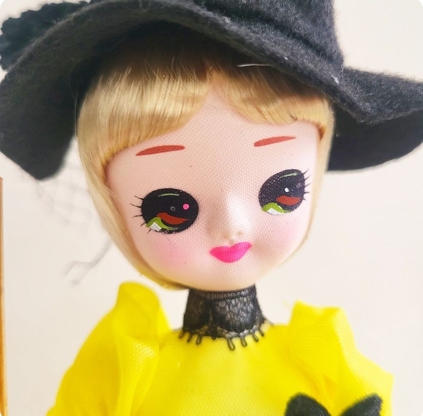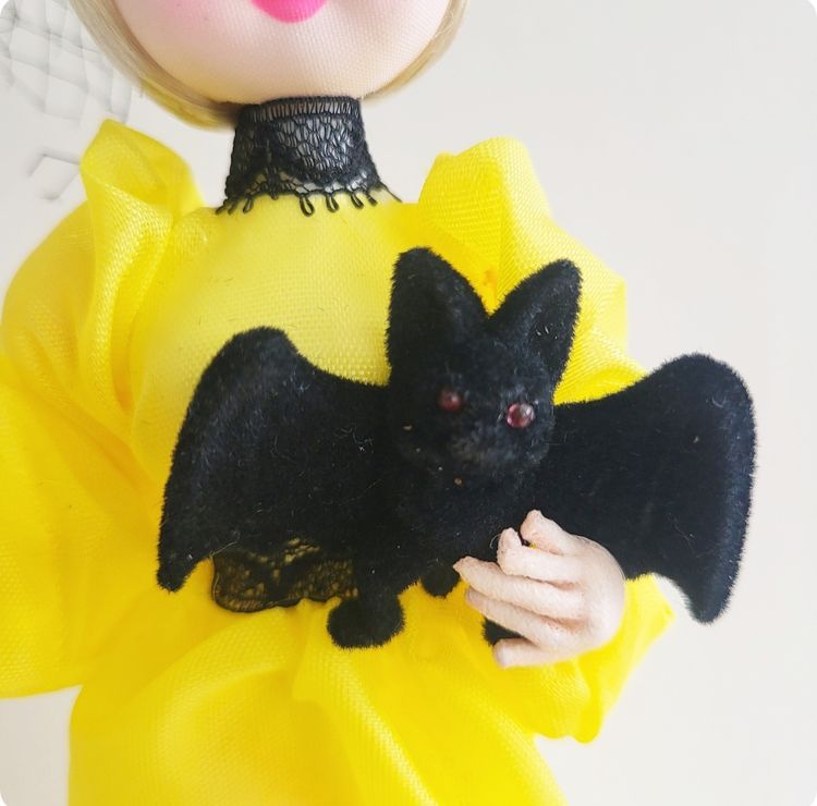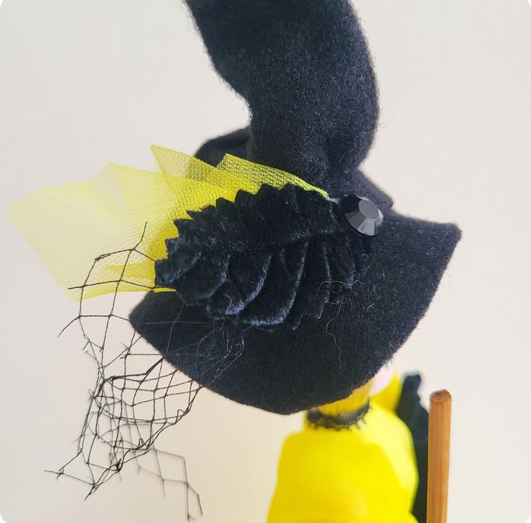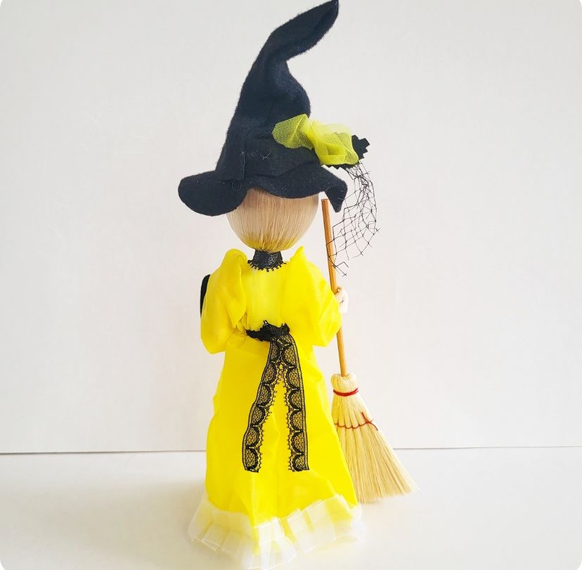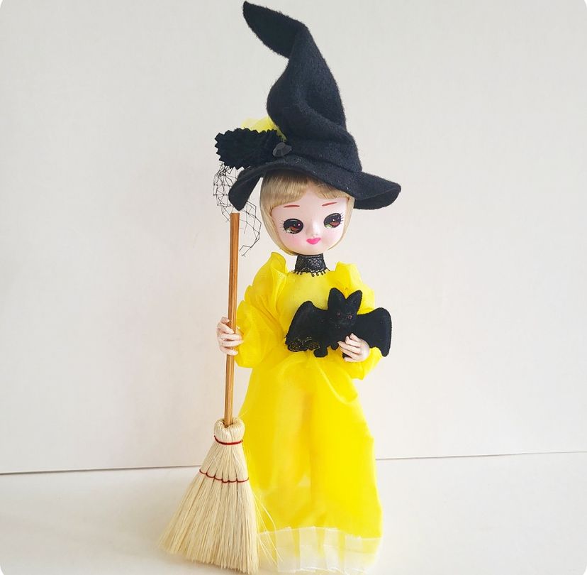 Handmade by me! Vintage Korea pose doll that I have turned into a Halloween Witch with her pet bat and broom. Scroll for details! Vintage elements include: pose doll, mini flocked bat, broom, black felt made into the hat, black lace, black netting, black flocked milnery leaf. New black rhinestone. Signed by me on the bottom. Measures 11 in tall x 5.5 in wide.