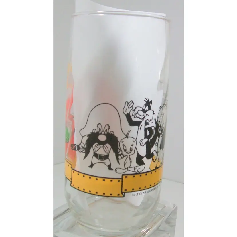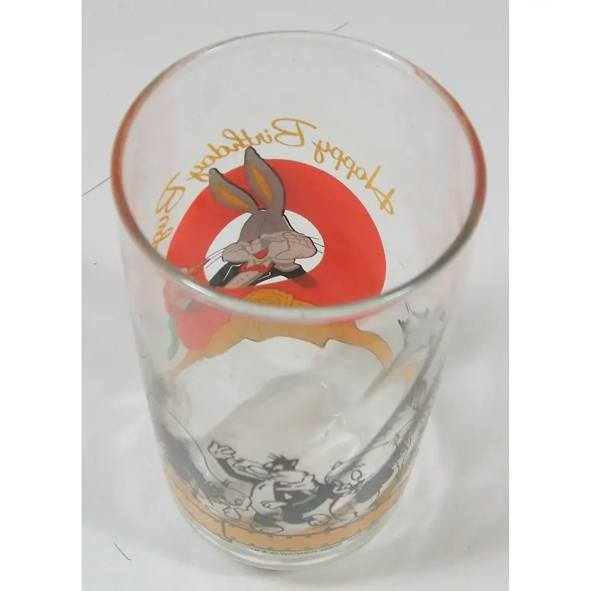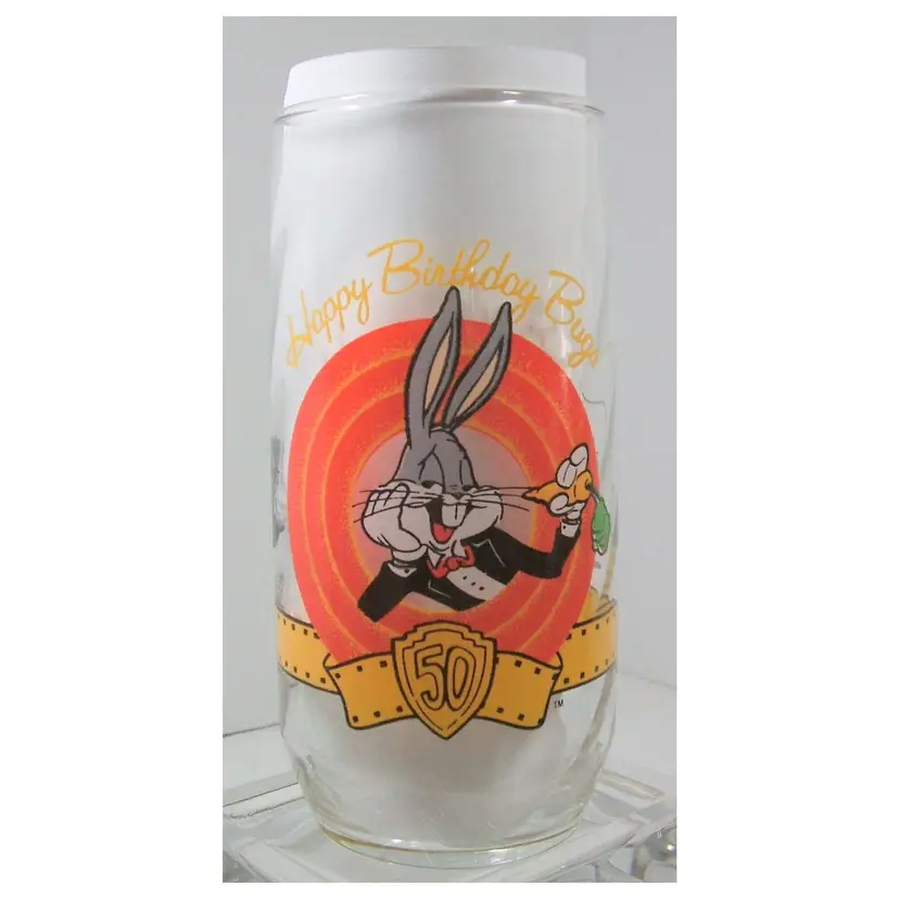 This vintage Warner Brothers drinking glass celebrates the 50th birthday for Bugs Bunny. One side has bugs with his carrot and circling the glass are his buddies, including tweety, sylvester, porky pig, the road runner and wiley e. coyote, daffy duck and yosemite sam. The glass is 6 inches tall and the diameter of the glass is 2.5 inches. It is previously owned but is in great condition - no fading or chipping on the designs. It has been kept in a smoke-free, pet-free and vape-free environment.