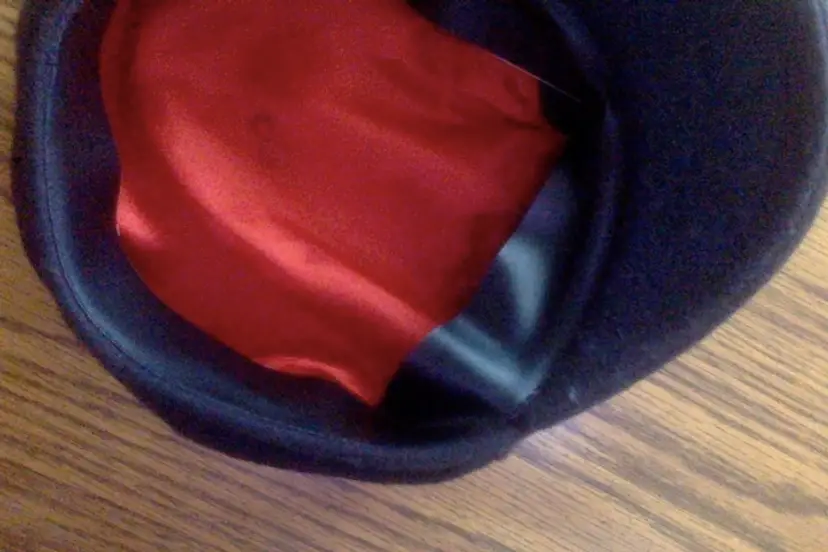 Vintage Black Wool Greek Fisherman's Cap. $8. Outside features black embroidery on brim and braided cord secured on each end with brass studs. The inside is lined with red satin and a "59" stamp. The inside band is vinyl and inside layer of cardboard. The inside band measures approx. 22 3/4 in. (no maker tag)