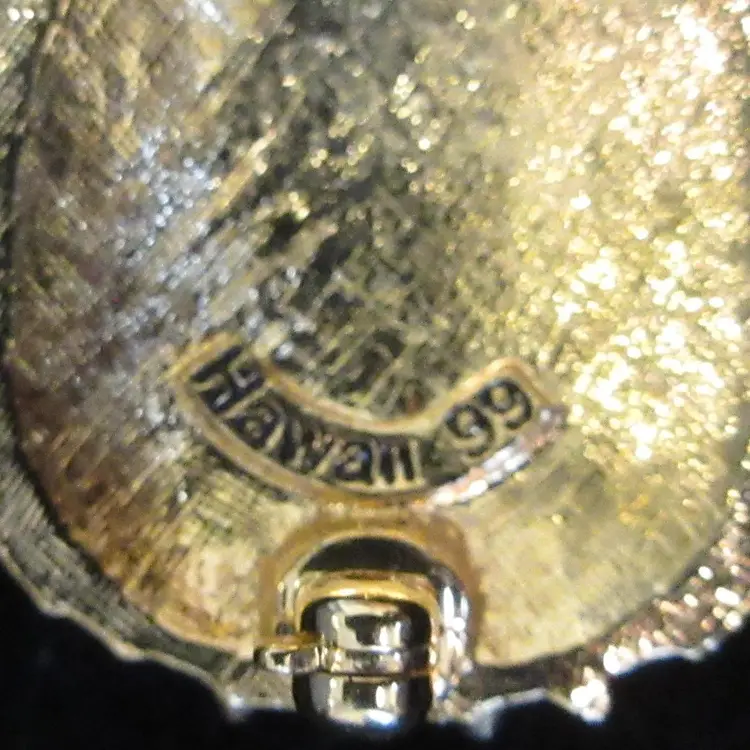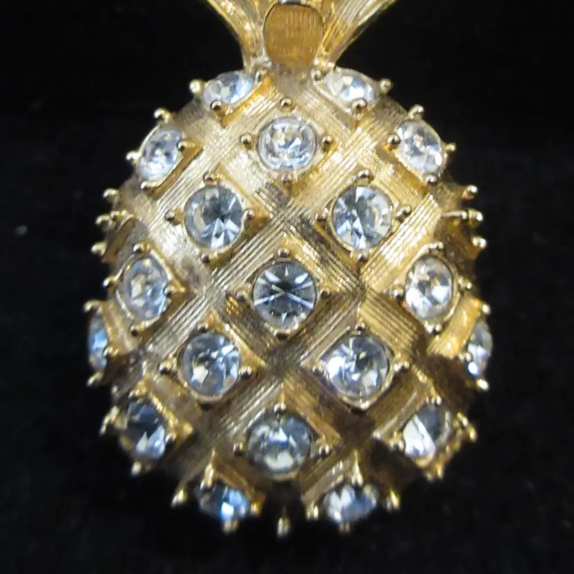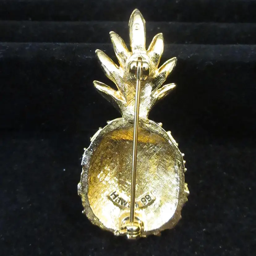 This is an AMAZING vintage gold tone metal brooch marked "Hawaii 99." It's shaped like a pineapple with clear crystal rhinestones embedded in the "skin." The top of the pineapple is amazingly detailed and looks almost real. It's a travel souvenir, but it's not obvious! This brooch is about 2 inches tall and has a pin back with a sliding C closure.