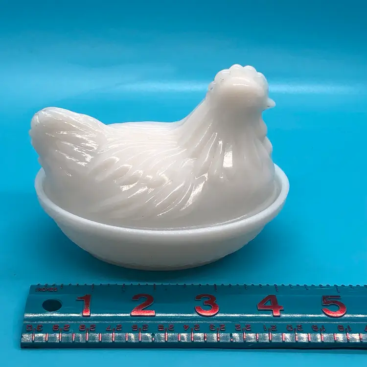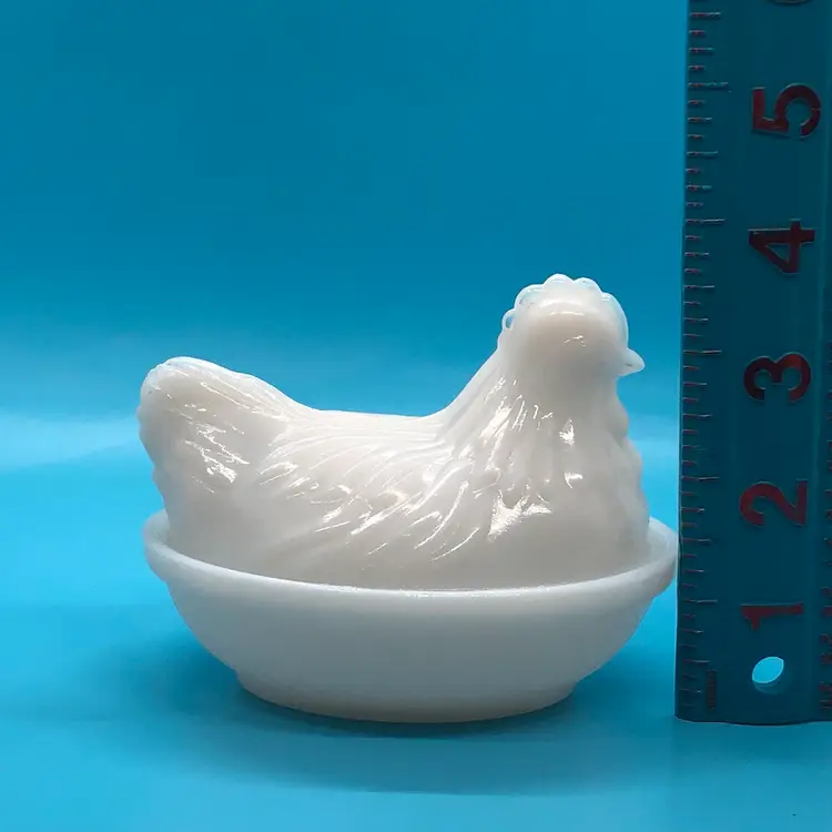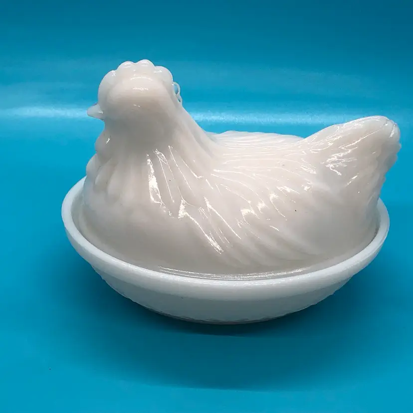 This vintage Hazel Atlas milk glass trinket box features a charming hen on nest design. The piece is made in the United States and is perfect for collectors of animal-shaped containers. The trinket box is made of high-quality milk glass, which gives it a beautiful and unique appearance. The hen on nest design adds a touch of countryside charm to any collection. This trinket box is a great addition to any collection and is perfect for storing small items such as jewelry or keepsakes. Hen on her nest is in great condition. Please check photos. Thank you ๐