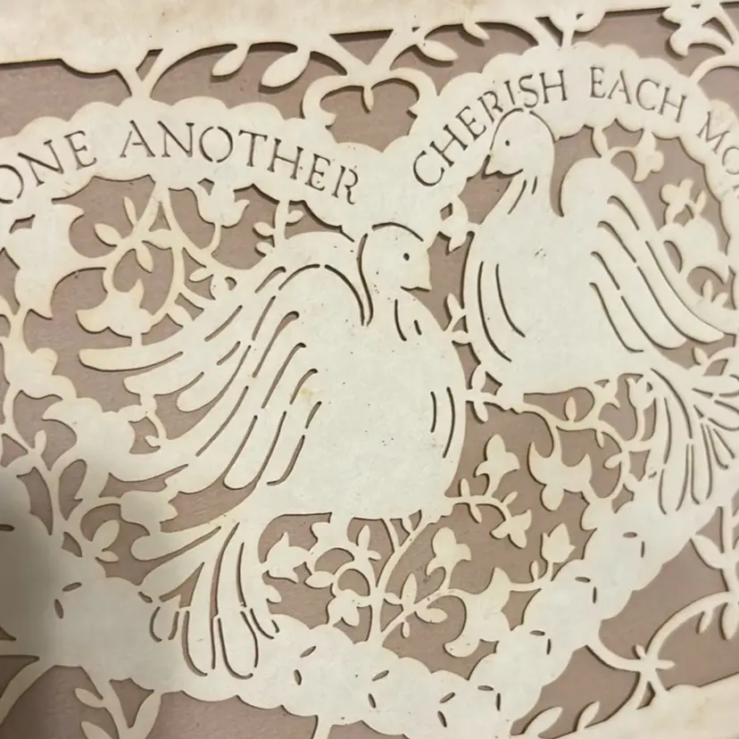 This is a vintage Figi Graphics Country Cuts framed paper-cut (scherenschnitte) wall art featuring a heart and two doves. The piece includes the text: LOVE ONE ANOTHER CHERISH EACH MOMENT