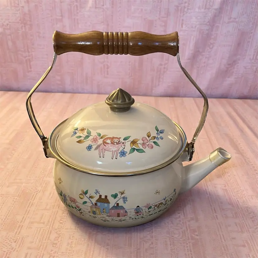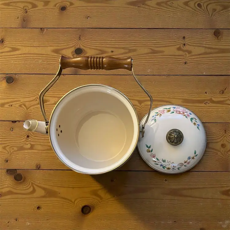 Vintage Heartland Enamel Tea Kettle by International China 2 quart Brass